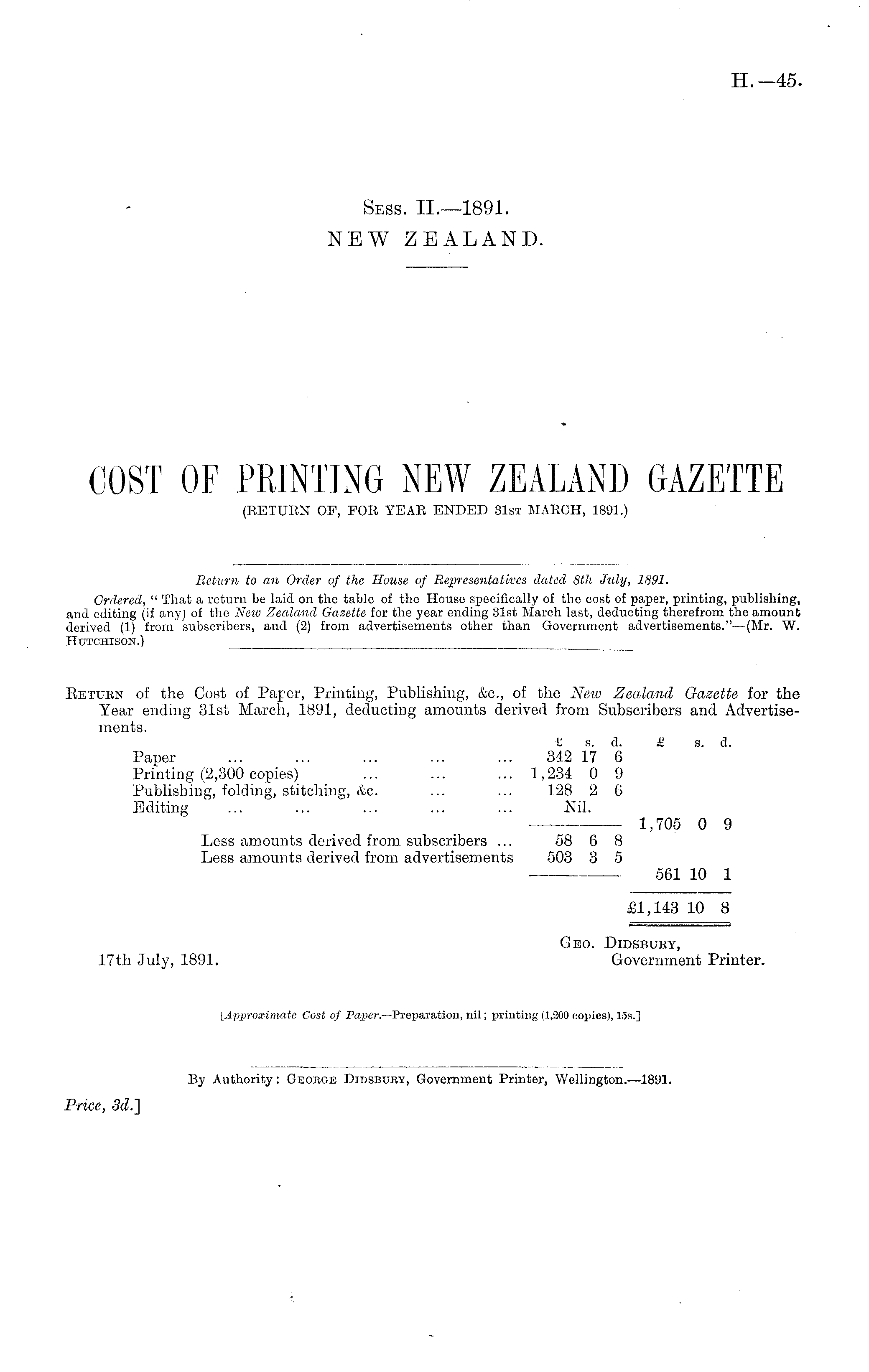 COST OF PRINTING NEW ZEALAND GAZETTE (RETURN OF, FOR YEAR ENDED 31st MARCH, 1891.)