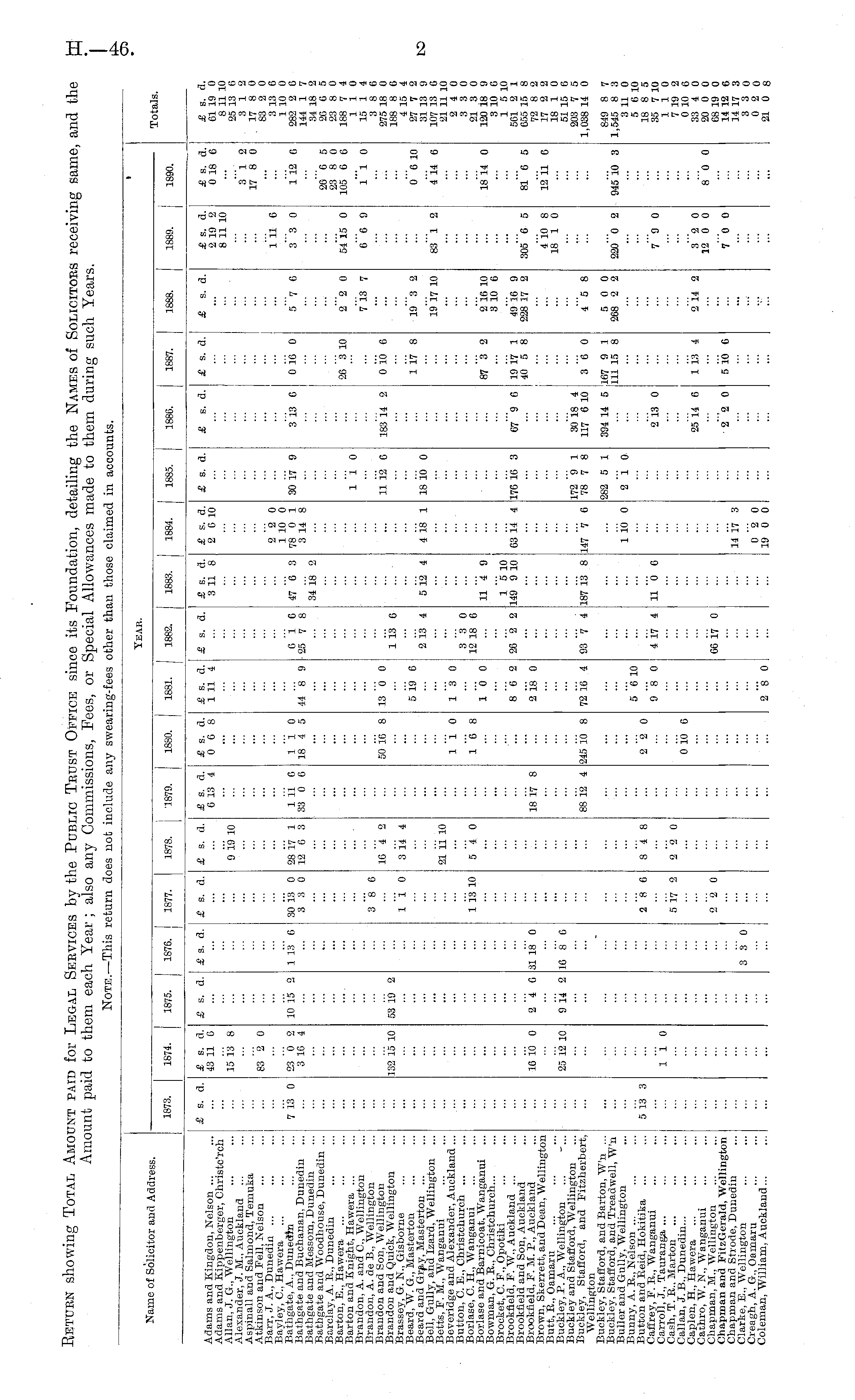 Return showing Total Amount paid for Legal Services by the Public Trust Office since its Foundation, detailing the Names of Solicitors receiving same, and the Amount paid to them each Year; also any Commissions, Fees, or Special Allowances made to them during such Years. Note.—This return does not include any swearing-fees other than those claimed in accounts.