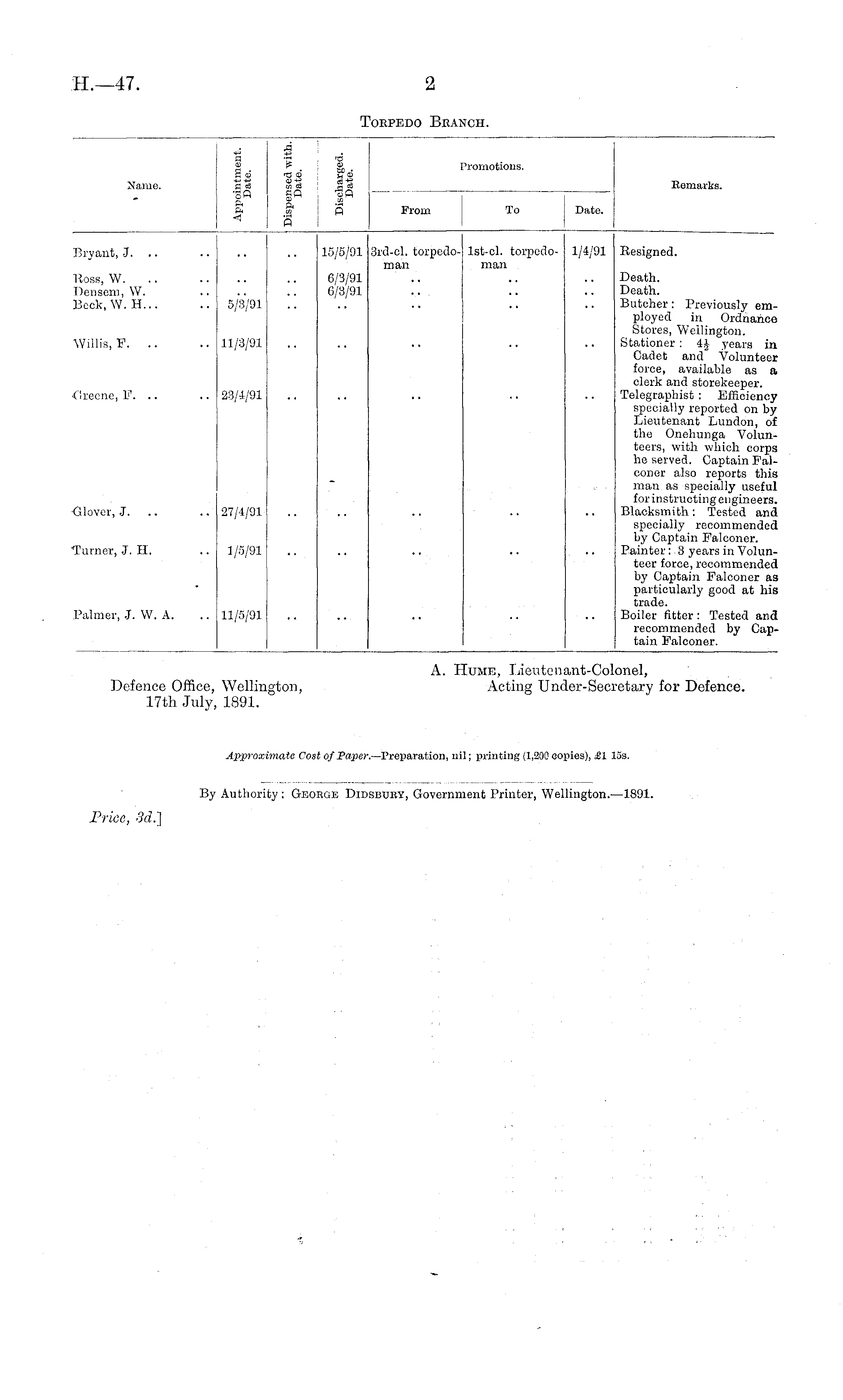 A. Hume, Lieutenant-Colonel, Defence Office, Wellington, Acting Under-Secretary for Defence. 17th July, 1891. Approximate Cost of Paper. —Preparation, nil; printing (1,200 copies), £1 15s.