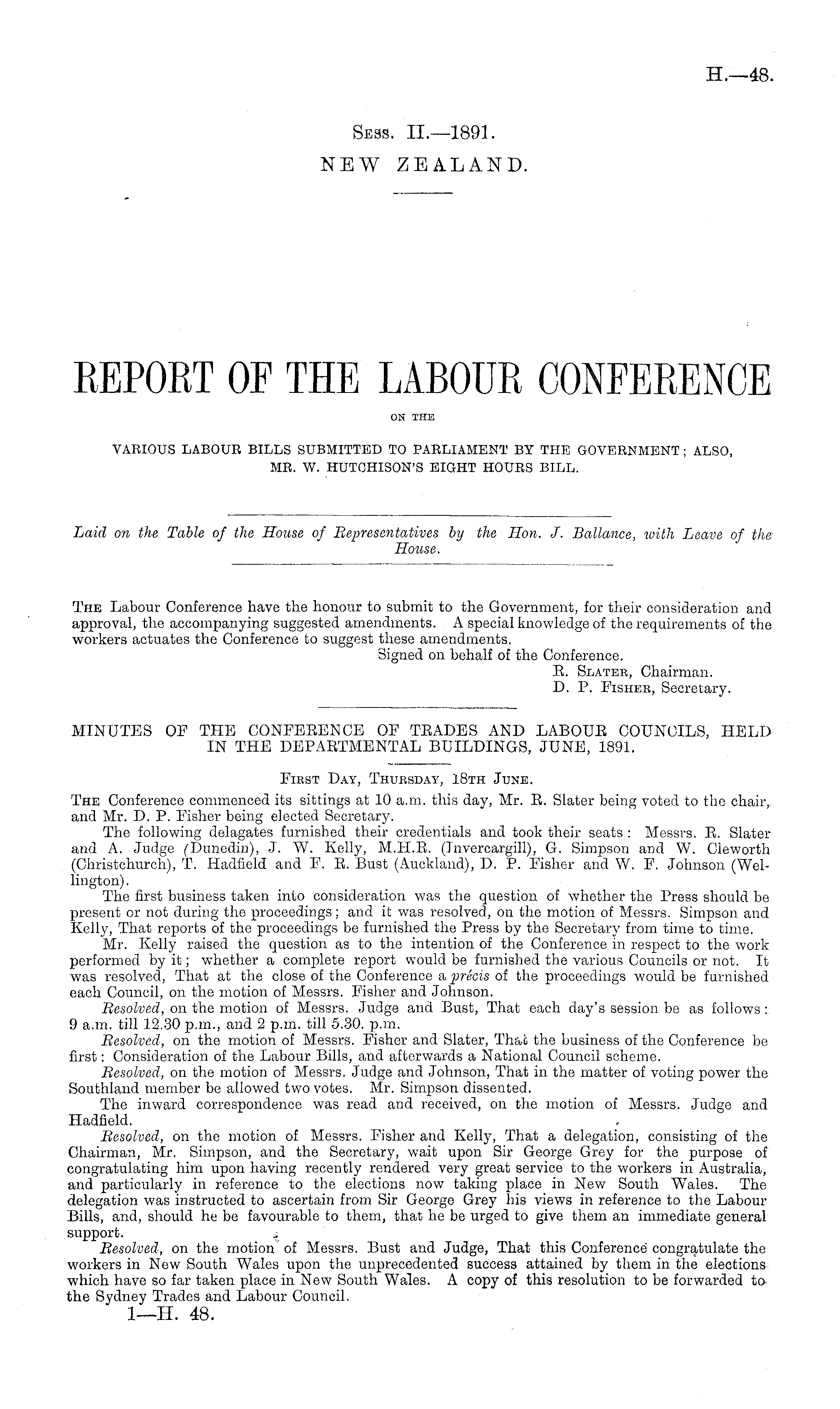 First Day, Thubsday, 18th June. The Conference commenced its sittings at 10 a.m. this day, Mr. E. Slater being voted to the chair, and Mr. D. P. Fisher being elected Secretary. The following delagates furnished their credentials and took their seats : Messrs. E. Slater and A. Judge (Dunedin), J. W. Kelly, M.H.E. (Jnvercargill), G. Simpson and W. Cieworth (Christchurch), T. Hadfield and F. E. Bust (Auckland), D. P. Fisher and W. F. Johnson (Wellington) . The first business taken into consideration was the question of whether the Press should be present or not during the proceedings; and it was resolved, on the motion of Messrs. Simpson and Kelly, That reports of the proceedings be furnished the Press by the Secretary from time to time. Mr. Kelly raised the question as to the intention of the Conference in respect to the work performed by it; whether a complete report would be furnished the various Councils or not. It was resolved, That at the close of the Conference a precis of the proceedings would be furnished each Council, on the motion of Messrs. Fisher and Johnson. Besolved, on the motion of Messrs. Judge and Bust, That each day's session be as follows: 9 a.m. till 12.30 p.m., and 2 p.m. till 5.30. p.m. Resolved, on the motion of Messrs. Fisher and Slater, That the business of the Conference be first: Consideration of the Labour Bills, and afterwards a National Council scheme. Besolved, on the motion of Messrs. Judge and Johnson, That in the matter of voting power the Southland member be allowed two votes. Mr. Simpson dissented. The inward correspondence was read and received, on the motion of Messrs. Judge and Hadfield. Besolved, on the motion of Messrs. Fisher and Kelly, That a delegation, consisting of the Chairman, Mr. Simpson, and the Secretary, wait upon Sir George Grey for the purpose of congratulating him upon having recently rendered very great service to the workers in Australia, and particularly in reference to the elections now taking place in New South Wales. The delegation was instructed to ascertain from Sir George Grey his views in reference to the Labour Bills, and, should he be favourable to them, that he be urged to give them an immediate general support. Besolved, on the motion of Messrs. Bust and Judge, That this Conference congratulate the workers in New South Wales upon the unprecedented success attained by them in the elections which have so far taken place in New South Wales. A copy of this resolution to be forwarded tothe Sydney Trades and Labour Council. I—H. 48.