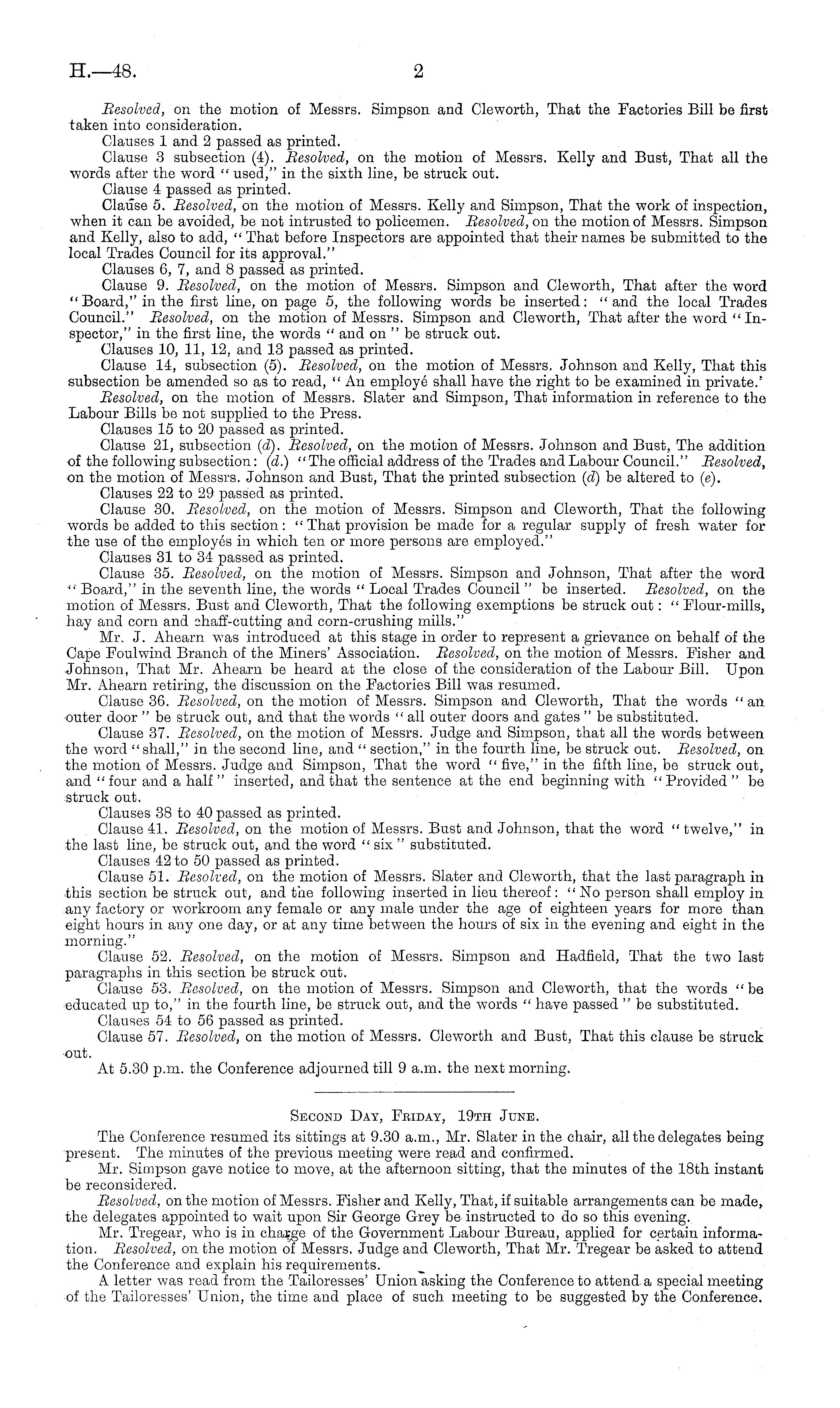 Besolved, on the motion of Messrs. Simpson and Cleworth, That the Factories Bill be first taken into consideration. Clauses 1 and 2 passed as printed. Clause 3 subsection (4). Besolved, on the motion of Messrs. Kelly and Bust, That all the words after the word " used," in the sixth line, be struck out. Clause 4 passed as printed. Clause 5. Besolved, on the motion of Messrs. Kelly and Simpson, That the work of inspection, when it can be avoided, be not intrusted to policemen. Besolved, on the motion of Messrs. Simpson and Kelly, also to add, " That before Inspectors are appointed that their names be submitted to the local Trades Council for its approval." Clauses 6, 7, and 8 passed as printed. Clause 9. Besolved, on the motion of Messrs. Simpson and Cleworth, That after the word "Board," in the first line, on page 5, the following words be inserted: "and the local Trades Council." Besolved, on the motion of Messrs. Simpson and Cleworth, That after the word " Inspector," in the first line, the words " and on " be struck out. Clauses 10, 11, 12, and 13 passed as printed. Clause 14, subsection (5). Besolved, on the motion of Messrs. Johnson and Kelly, That this subsection be amended so as to read, " An employe shall have the right to be examined in private.' Besolved, on the motion of Messrs. Slater and Simpson, That information in reference to the Labour Bills be not supplied to the Press. Clauses 15 to 20 passed as printed. Clause 21, subsection (d). Besolved, on the motion of Messrs. Johnson and Bust, The addition of the following subsection: (d.) "The official address of the Trades and Labour Council." Besolved, on the motion of Messrs. Johnson and Bust, That the printed subsection (d) be altered to (<?). Clauses 22 to 29 passed as printed. Clause 30. Besolved, on the motion of Messrs. Simpson and Cleworth, That the following words be added to this section: "That provision be made for a regular supply of fresh water for the use of the employes in which ten or more persons are employed." Clauses 31 to 34 passed as printed. Clause 35. Besolved, on the motion of Messrs. Simpson and Johnson, That after the word " Board," in the seventh line, the words " Local Trades Council " be inserted. Besolved, on the motion of Messrs. Bust and Cleworth, That the following exemptions be struck out : " Flour-mills, hay and corn and shaff-cutting and corn-crushing mills." Mr. J. Ahearn was introduced at this stage in order to represent a grievance on behalf of the Cape Foulwind Branch of the Miners' Association. Besolved, on the motion of Messrs. Fisher and Johnson, That Mr. Ahearn be heard at the close of the consideration of the Labour Bill. Upon Mr. Ahearn retiring, the discussion on the Factories Bill was resumed. Clause 36. Besolved, on the motion of Messrs. Simpson and Cleworth, That the words " an outer door " be struck out, and that the words " all outer doors and gates " be substituted. Clause 37. Besolved, on the motion of Messrs. Judge and Simpson, that all the words between the word "shall," in the second line, and " section," in the fourth line, be struck out. Besolved, on the motion of Messrs. Judge and Simpson, That the word " five," in the fifth line, be struck out, and "four and a half" inserted, and that the sentence at the end beginning with "Provided" be struck out. Clauses 38 to 40 passed as printed. Clause 41. Besolved, on the motion of Messrs. Bust and Johnson, that the word "twelve," in the last line, be struck out, and the word " six " substituted. Clauses 42 to 50 passed as printed. Clause 51. Besolved, on the motion of Messrs. Slater and Cleworth, that the last paragraph in this section be struck out, and the following inserted in lieu thereof : "No person shall employ in -any factory or workroom any female or any male under the age of eighteen years for more than eight hours in any one day, or at any time between the hours of six in the evening and eight in the morning." Clause 52. Besolved, on the motion of Messrs. Simpson and Hadfield, That the two last paragraphs in this section be struck out. Clause 53. Besolved, on the motion of Messrs. Simpson and Cleworth, that the words "be ■educated up to," in the fourth line, be struck out, and the words " have passed " be substituted. Clauses 54 to 56 passed as printed. Clause 57. Besolved, on the motion of Messrs. Cleworth and Bust, That this clause be struck ■out. At 5.30 p.m. the Conference adjourned till 9 a.m. the next morning.