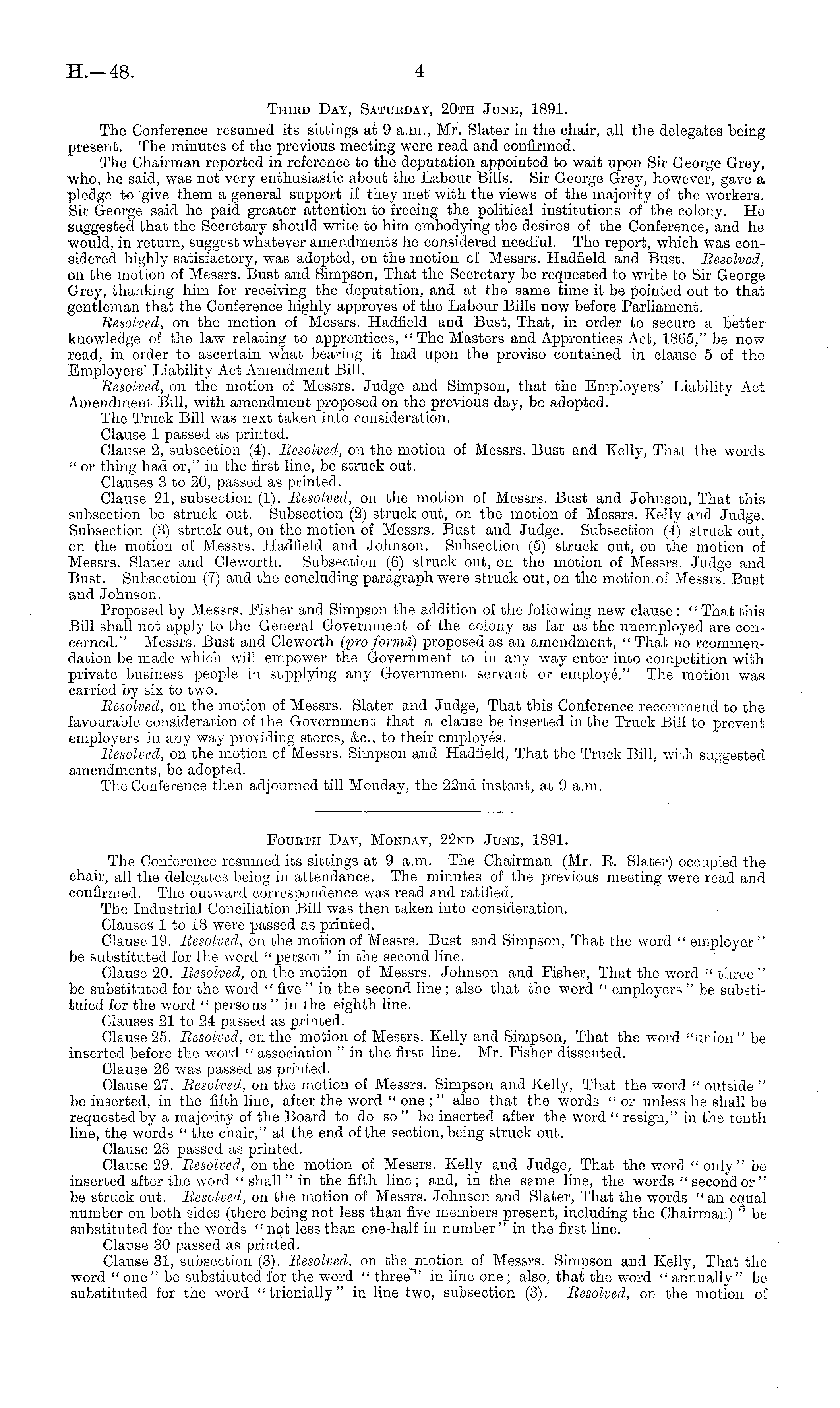 Fourth Day, Monday, 22nd June, 1891. The Conference resumed its sittings at 9 a.m. The Chairman (Mr. E. Slater) occupied the chair, all the delegates being in attendance. The minutes of the previous meeting were read and confirmed. The outward correspondence was read and ratified. The Industrial Conciliation Bill was then taken into consideration. Clauses 1 to 18 were passed as printed. Clause 19. Besolved, on the motion of Messrs. Bust and Simpson, That the word " employer" be substituted for the word "person" in the second line. Clause 20. Besolved, on the motion of Messrs. Johnson and Fisher, That the word " three " be substituted for the word " five "in the second line; also that the word " employers "be substituied for the word " persons " in the eighth line. Clauses 21 to 24 passed as printed. Clause 25. Besolved, on the motion of Messrs. Kelly and Simpson, That the word "union" be inserted before the word " association "in the first line. Mr. Fisher dissented. Clause 26 was passed as printed. Clause 27. Besolved, on the motion of Messrs. Simpson and Kelly, That the word " outside " be inserted, in the fifth line, after the word " one ; " also that the words " or unless he shall be requested by a majority of the Board to do so" be inserted after the word " resign," in the tenth line, the words " the chair," at the end of the section, being struck out. Clause 28 passed as printed. Clause 29. Besolved, on the motion of Messrs. Kelly and Judge, That the word " only " be inserted after the word " shall " in the fifth line; and, in the same line, the words " second or " be struck out. Besolved, on the motion of Messrs. Johnson and Slater, That the words "an equal number on both sides (there being not less than five members present, including the Chairman) " be substituted for the words " not less than one-half in number " in the first line. Clause 30 passed as printed. Clause 31, subsection (3). Besolved, on the motion of Messrs. Simpson and Kelly, That the word " one " be substituted for the word " three"" in line one ; also, that the word " annually " be substituted for the word " trienially" in line two, subsection (3). Besolved, on the motion of