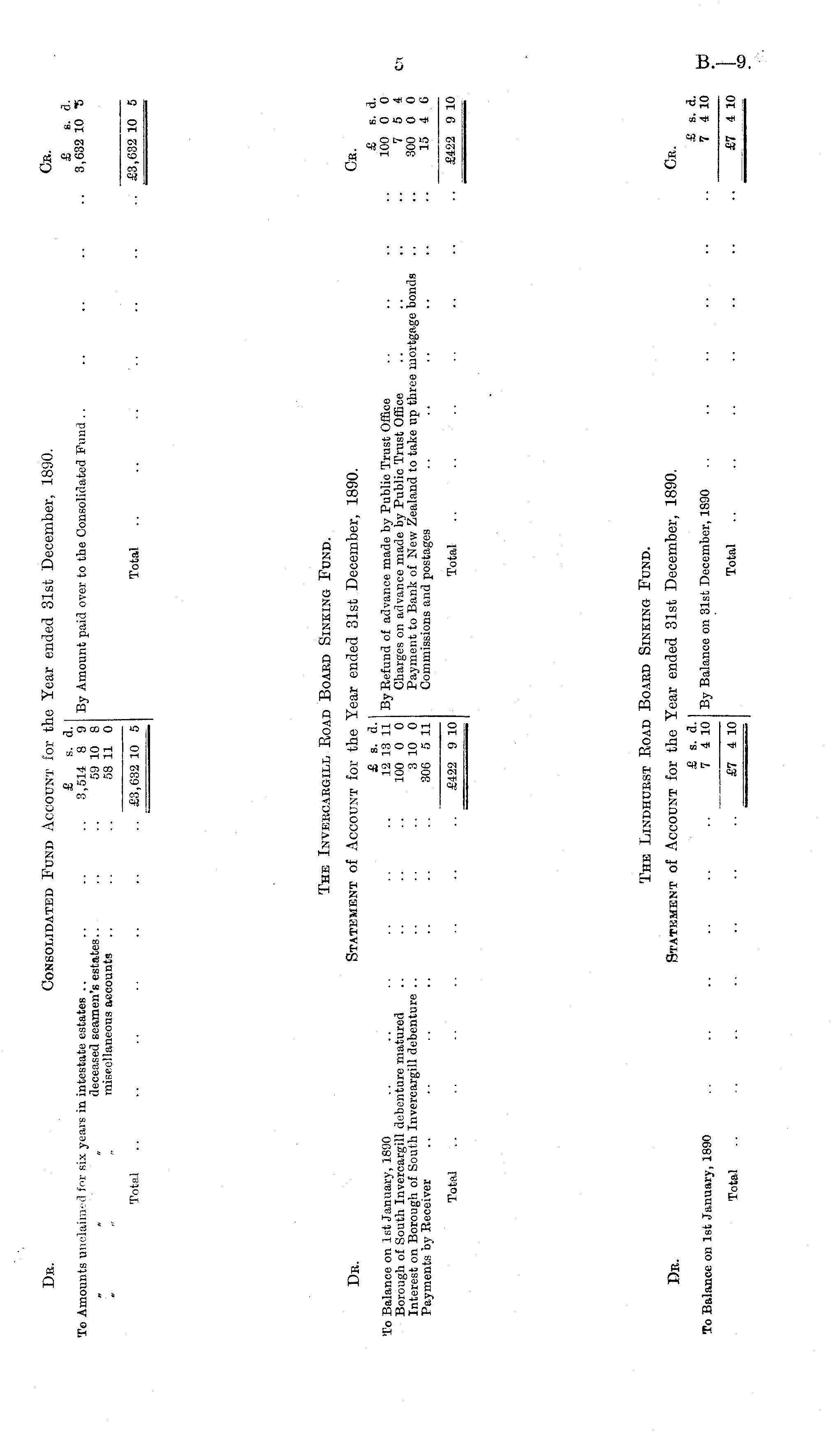 Dr. Consolidated Fund Account for the Year ended 31st December, 1890. Cr. £ s. d. £ b. d. To Amounts unclaimed for six years in intestate estates .. .. .. .. 3,514 89 By Amount paid over to the Consolidated Fund .. .. .. .. •• 8,632 10 °5 „ „ deceased seamen's estates.. .. .. 59 10 8 miscellaneous accounts .. .. .. 58 11 0 Total .. .. .. .. .. .. .. £3,632 10 5 Total .. .. .. '.. -. .. ■• £3,632 10 5 The Invercargill Road Board Sinking Eund. Dr. Statement of Account for the Year ended 31st December, 1890. Cr. £ s. d. £ s. d. To Balance on Ist January, 1890 .. .. .. .. .. .. 12 13 11 By Refund of advance made by Public Trust Office .. .. .. .. 100 0 0 Borough of South Invercargill debenture matured .. .. .. .. 100 0 0 Charges on advance made by Public Trust Office .. ~ .. .. 7 5 4 Interest on Borough of South Invercargill debenture .. .. .. .. 310 0 Payment to Bank of New Zealand to take up three mortgage bonds .. .. 300 0 0 Payments by Receiver .. .. .. .. .. .. .. 306 5 11 Commissions and postages .. .. .. .. • ■ . • 15 4 6 Total .. .. .. .. .. .. .. £422 910 Total .. .. .. .. .. .. .. £422 910 The Lindhurst Road Board Sinking Fund. Dr. Statement of Account for the Year ended 31st December, 1890, Cr. £ s. d. £ s. d. To Balance on Ist January, 1890 " .. .. .. .. .. .. 7 4 10 By Balance on 31st December, 1890 .. .. .. .. .. .. 7 4 10 Total .. .. . - .. .. • • ■ •£74 10 Total .. .. .. .. .. .. .. £7 410