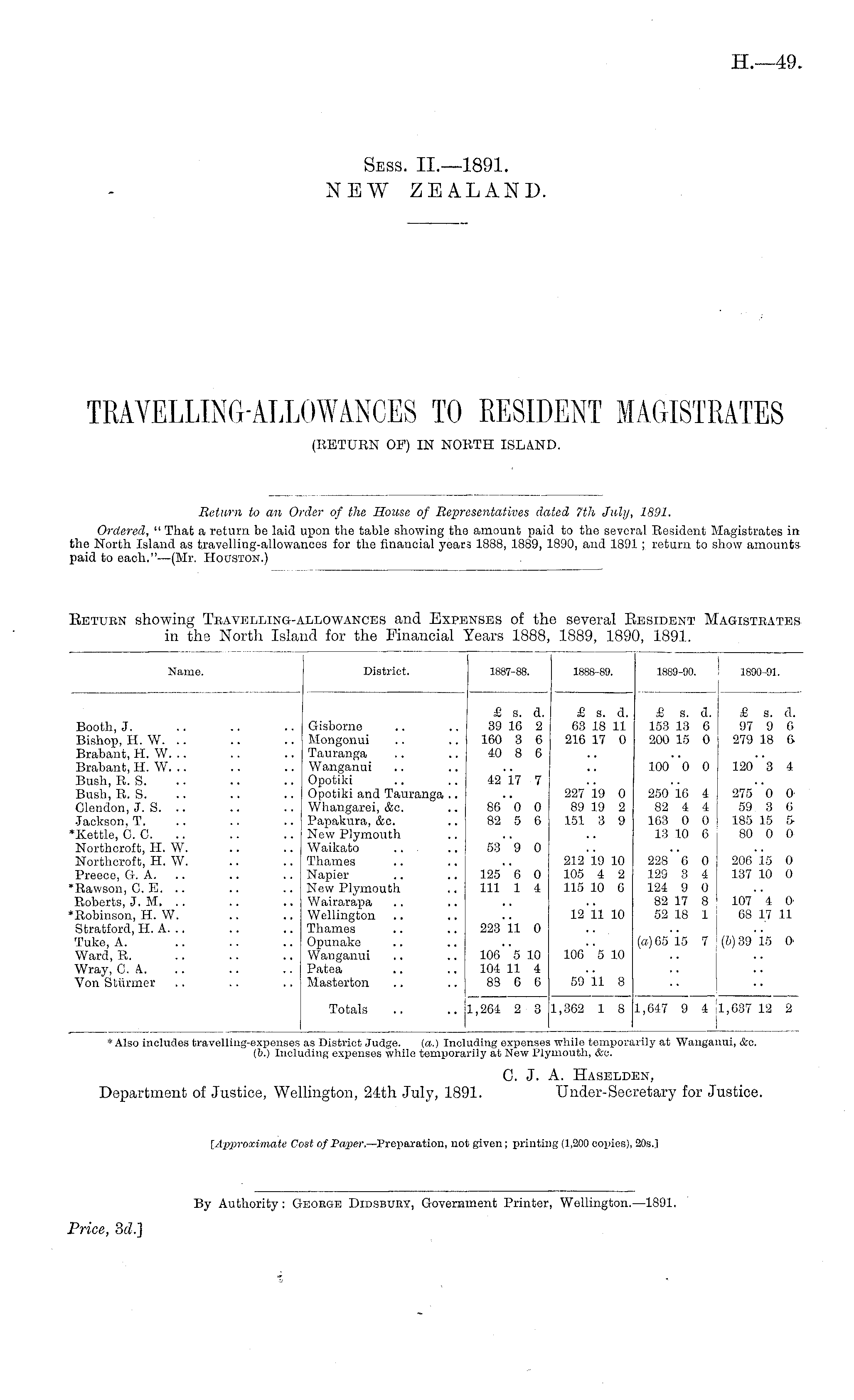 C. J. A. Hasblden, Department of Justice, Wellington, 24th July, 1891. Under-Secretary for Justice.