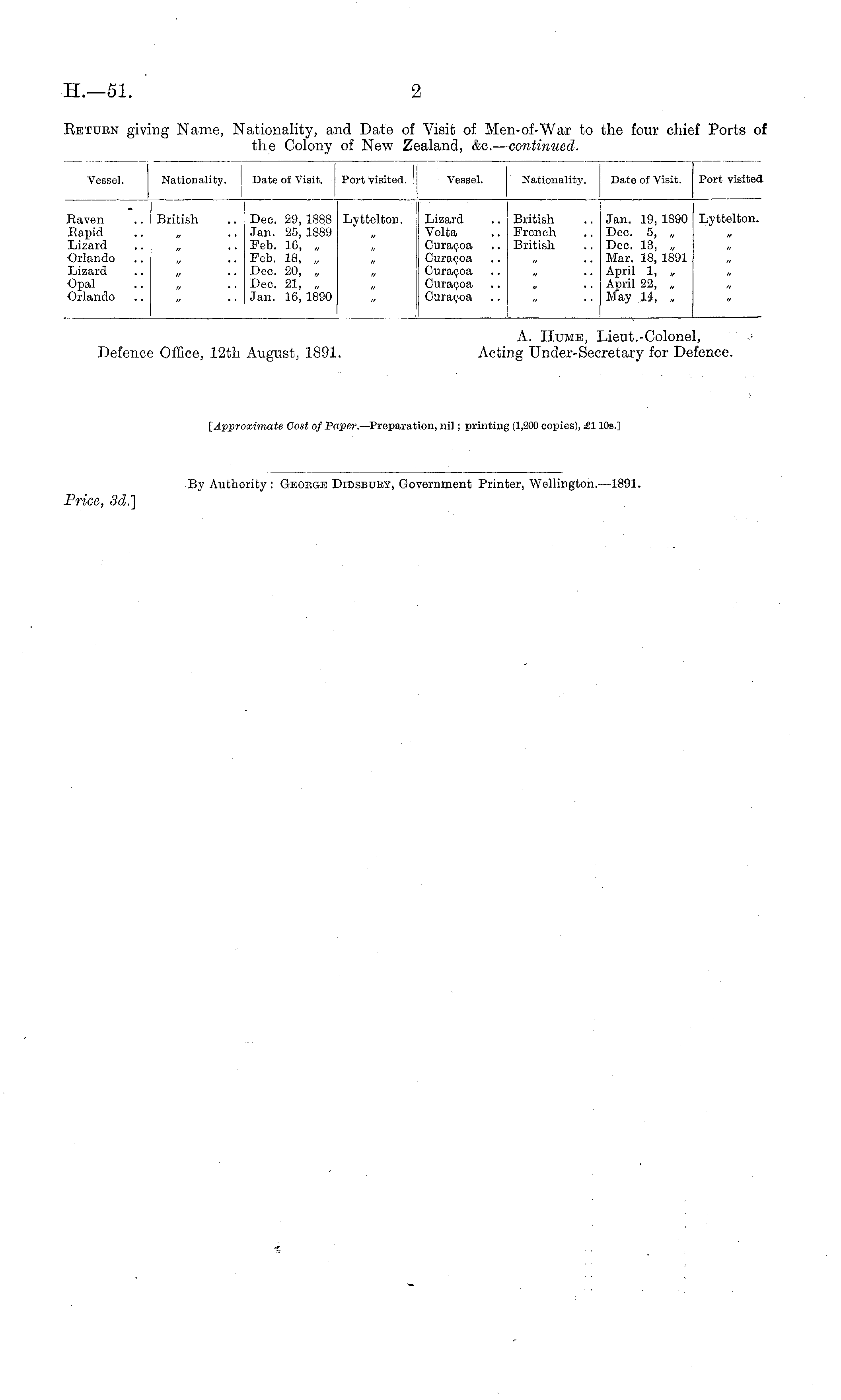 A. Hume, Lieut.-Colonel, Defence Office, 12th August, 1891. Acting Under-Secretary for Defence. [Approximate Cost of Paper.— Preparation, nil; printing (1,200 copies), £1 10s.]