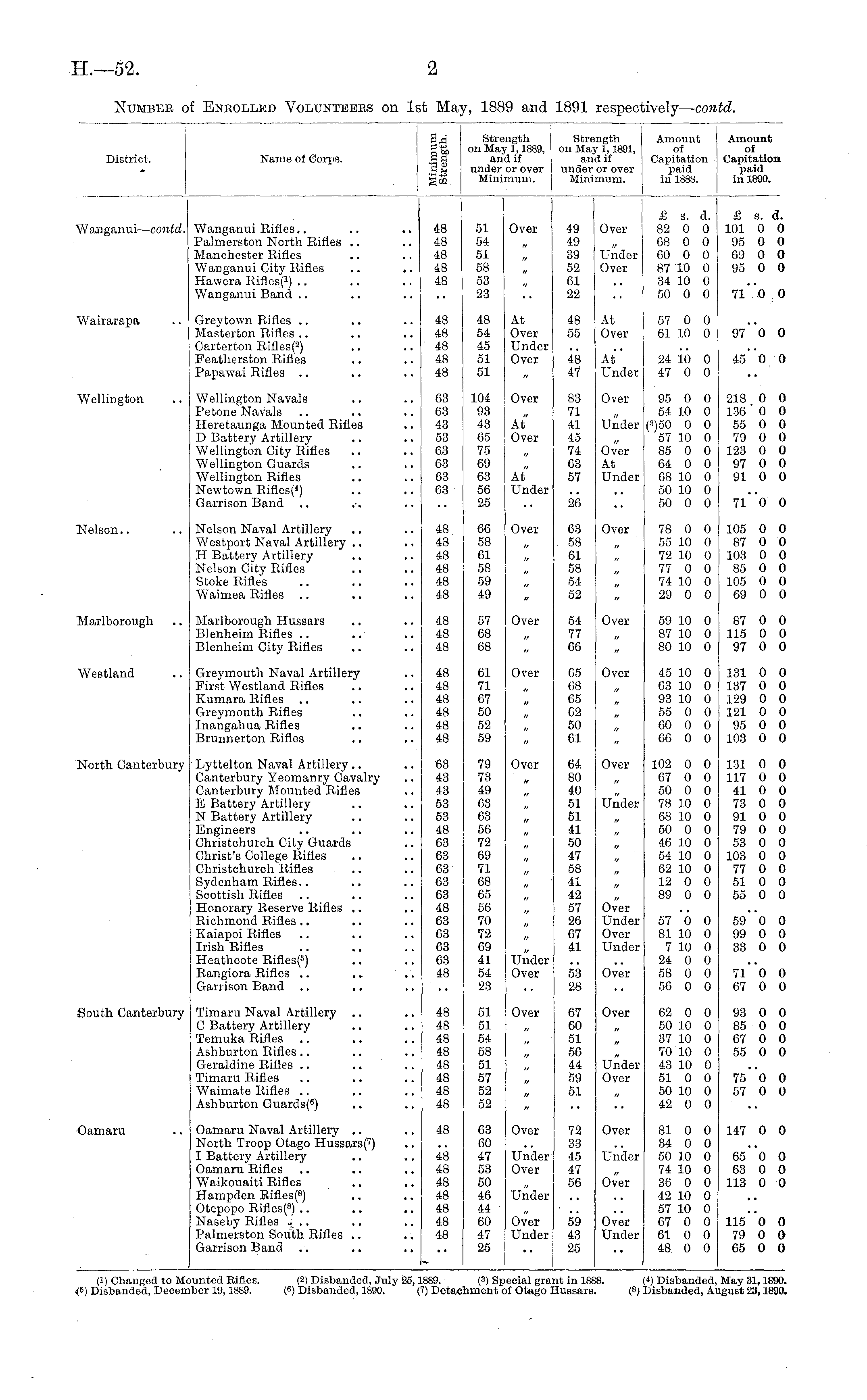 District. Name of Corps. is Sua Stre on Ma; an under Mini 3ngth y 1,1889, id if or over Linnni. Strength on May 1,1891, arid if under or over Minimum. Amount of Capitation paid in 1883. Amount of Capitation paid in 1890. Wanganui— contd. Wanganui Rifles.. Palmerston North Rifles .. Manchester Rifles Wanganui City Rifles Hawera Riflesf 1) Wanganui Band 48 48 48 48 48 51 54 51 58 53 23 Over 49 49 39 52 61 22 Over Under Over £ s. a. 82 0 0 08 0 0 00 0 0 87 10 0 34 10 0 50 0 0 £ s. d. 101 0 0 95 0 0 09 0 O 95 0 0 Wairarapa Greytown Rifles Masterton Rifles Carterton Rifles( z) Peatherston Rifles Papawai Rifles 48 48 48 48 48 48 54 45 51 51 At Over Under Over 48 55 At Over 57 0 0 61 10 0 71 0 0 97 0 0 Wellington 48 47 At" Under 24 10 0 47 0 0 45*'o 0 Wellington Navals Petone Navals Heretaunga Mounted Rifles D Battery Artillery Wellington City Rifles Wellington Guards Wellington Rifles Newtown Rifles( 4) Garrison Band 03 03 43 53 63 63 63 03 " 104 93 43 65 75 69 63 50 25 Over At" Over 83 71 41 45 74 03 57 Over UnderOver At Under95 0 0 54 10 0 (»)50 0 0 57 10 0 85 0 0 04 0 0 68 10 0 50 10 0 50 0 0 218 0 0 136 ' 0 0 55 0 0 79 0 0 123 0 0 97 0 0 91 0 0 At" Under 26 7l"0 0 Nelson.. Nelson Naval Artillery Westport Naval Artillery .. H Battery Artillery Nelson City Rifles Stoke Rifles Waimea Rifles 48 48 48 48 48 48 06 58 61 58 59 49 Over 63 58 61 58 54 52 Over 78 0 0 55 10 0 72 10 0 77 0 0 74 10 0 29 0 0 105 0 0 87 0 0 103 0 0 85 0 0 105 0 0 09 0 0 Marlborough Marlborough Hussars Blenheim Rifles Blenheim City Rifles 48 48 48 57 68 68 Over 54 77 60 Over 59 10 0 87 10 0 80 10 0 87 0 0 115 0 0 97 0 0 Westland Greymouth Naval Artillery First Westland Rifles Kumara Rifles Greymouth Rifles Inangahua Rifles Brunnerton Rifles 48 48 48 48 48 48 61 71 67 50 52 59 Over05 08 05 62 50 61 Over45 10 0 63 10 0 93 10 0 55 0 0 60 0 0 60 0 0 131 0 0 137 0 0 129 0 0 121 0 0 95 0 0 103 0 0 North Canterbury Lyttelton Naval Artillery .. Canterbury Yeomanry Cavalry Canterbury Mounted Rifles E Battery Artillery N Battery Artillery Engineers Christchurch City Guards Christ's College Rifles Christchurch Rifles Sydenham Rifles.. Scottish Rifles Honorary Reserve Rifles .. Richmond Rifles Kaiapoi Rifles Irish Rifles Heathcoto Rifles( 5) Rangiora Rifles Garrison Band 63 43 43 53 53 48 63 63 63 63 63 48 63 63 63 63 48 79 73 49 03 63 56 72 69 71 68 65 56 70 72 69 41 54 23 Over 64 80 40 51 51 41 50 47 58 41 42 57 26 67 41 Over Under 102 0 0 07 0 0 50 0 0 78 10 0 68 10 0 50 0 0 40 10 0 54 10 0 62 10 0 12 0 0 89 0 0 131 0 0 117 0 0 41 0 0 73 0 0 91 0 0 79 0 0 53 0 0 103 0 0 77 0 0 51 0 0 55 0 0 Over Under Over Under57 0 0 81 10 0 7 10 0 24 0 0 58 0 0 50 0 0 59 0 0 99 0 0 33 0 0 Under Over 53 28 Over 71 *0 0 07 0 0 South Canterbury Timaru Naval Artillery .. G Battery Artillery Temuka Rifles Ashburton Rifles Geraldine Rifles Timaru Rifles Waimate Rifles Ashburton Guards( 6) 48 48 48 48 48 48 48 48 51 51 54 58 51 57 52 52 Over 07 60 51 56 44 59 51 Over UnderOver 02 0 0 50 10 0 37 10 0 70 10 0 43 10 0 51 0 0 50 10 0 42 0 0 93 0 0 85 0 0 67 0 0 55 0 0 75**0 0 57 0 0 Oamaru Oamaru Naval Artillery .. North Troop Otago Hussars(') I Battery Artillery Oamaru Rifles Waikouaiti Rifles Hampden Rifles( e) Otepopo Rifles( 8) Naseby Rifles - .. Palmerston South Rifles .. Garrison Band 48 63 60 47 53 50 46 44 60 47 25 Over 72 33 45 47 56 Over 81 0 0 34 0 0 50 10 0 74 10 0 30 0 0 42 10 0 57 10 0 07 0 0 61 0 0 48 0 0 147 0 0 48 48 48 48 48 48 48 Under Over Under Under Over 65 0 0 63 0 0 113 0 0 Over Under 59 43 25 Over Under 115 0 0 79 0 O 65 0 0 (1) Changed to Mj ( 6) Disbanded, Decen junted Rifles, iber 19,1869. (2) Disbanded, July 25,1 (6) Disbanded, 1890. (' L889. 7) Detael OS: irnent tecial gra: rf Otago 1 it in 186 Lussars, i8. <«J [*) Disbanded, May 31,1890. Disbanded, August 23,1890.