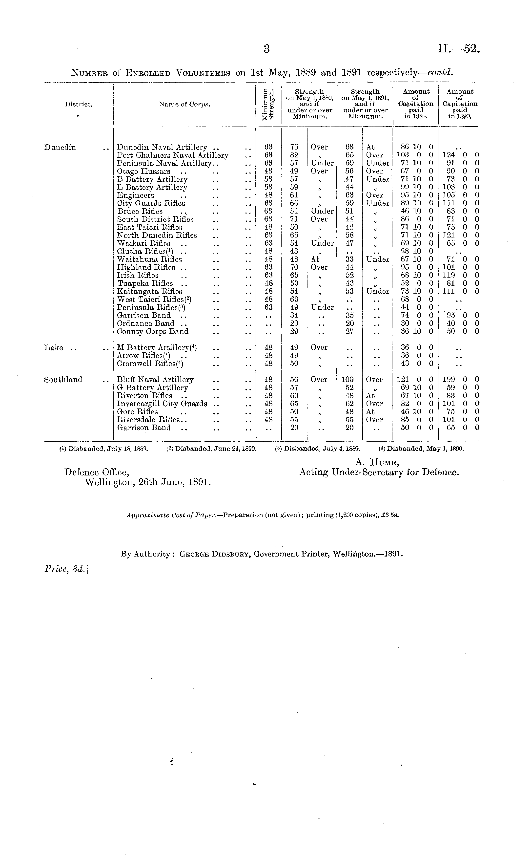 A. Hume, Defence Office, Acting Under-Secretary for Defence. Wellington, 26th June, 1891. Approximate Cost of Paper. —Preparation (not given); printing (1,200 copies), £3 ss.