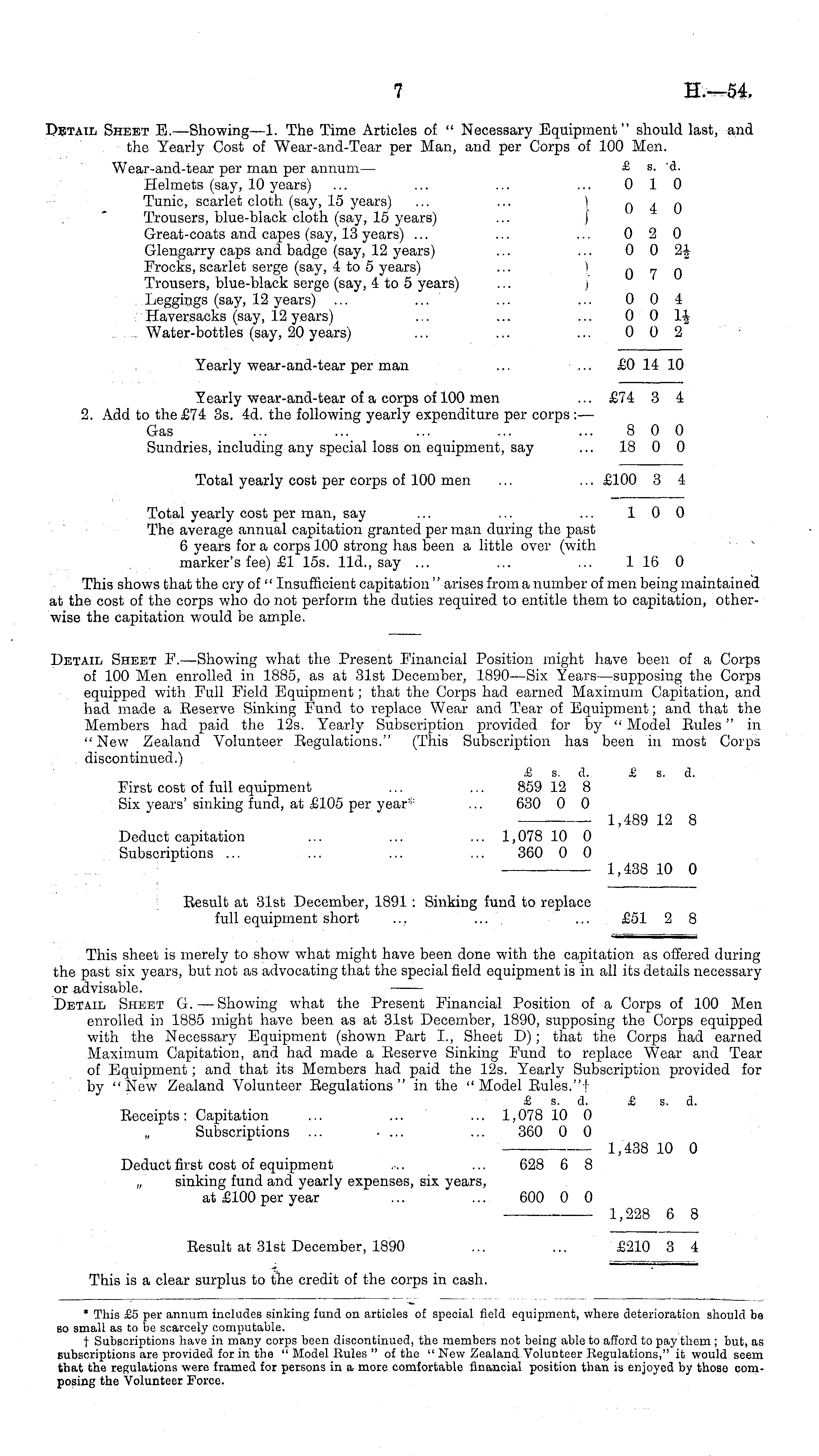 Detail Sheet F.—Showing what the Present Financial Position might have been of a Corps of 100 Men enrolled in 1885, as at 31st December, 1890 —Six Years —supposing the Corps equipped with Full Field Equipment; that the Corps had earned Maximum Capitation, and had made a Reserve Sinking Fund to replace Wear and Tear of Equipment; and that the Members had paid the 12s. Yearly Subscription provided for by " Model Rules" in "New Zealand Volunteer Regulations." (This Subscription has been hi most Corps discontinued.) & s. d. £ s. d. First cost of full equipment ... ... 859 12 8 Six years' sinking fund, at £105 per yearc ... 630 0 0 1,489 12 8 Deduct capitation ... ... ... 1,078 10 0 Subscriptions ... ... ... ... 360 0 0 1,438 10 0 Result at 31st December, 1891 : Sinking fund to replace full equipment short ... ... ... £51 2 8 This sheet is merely to show what might have been done with the capitation as offered during the past six years, but not as advocating that the special field equipment is in all its details necessary or advisable.