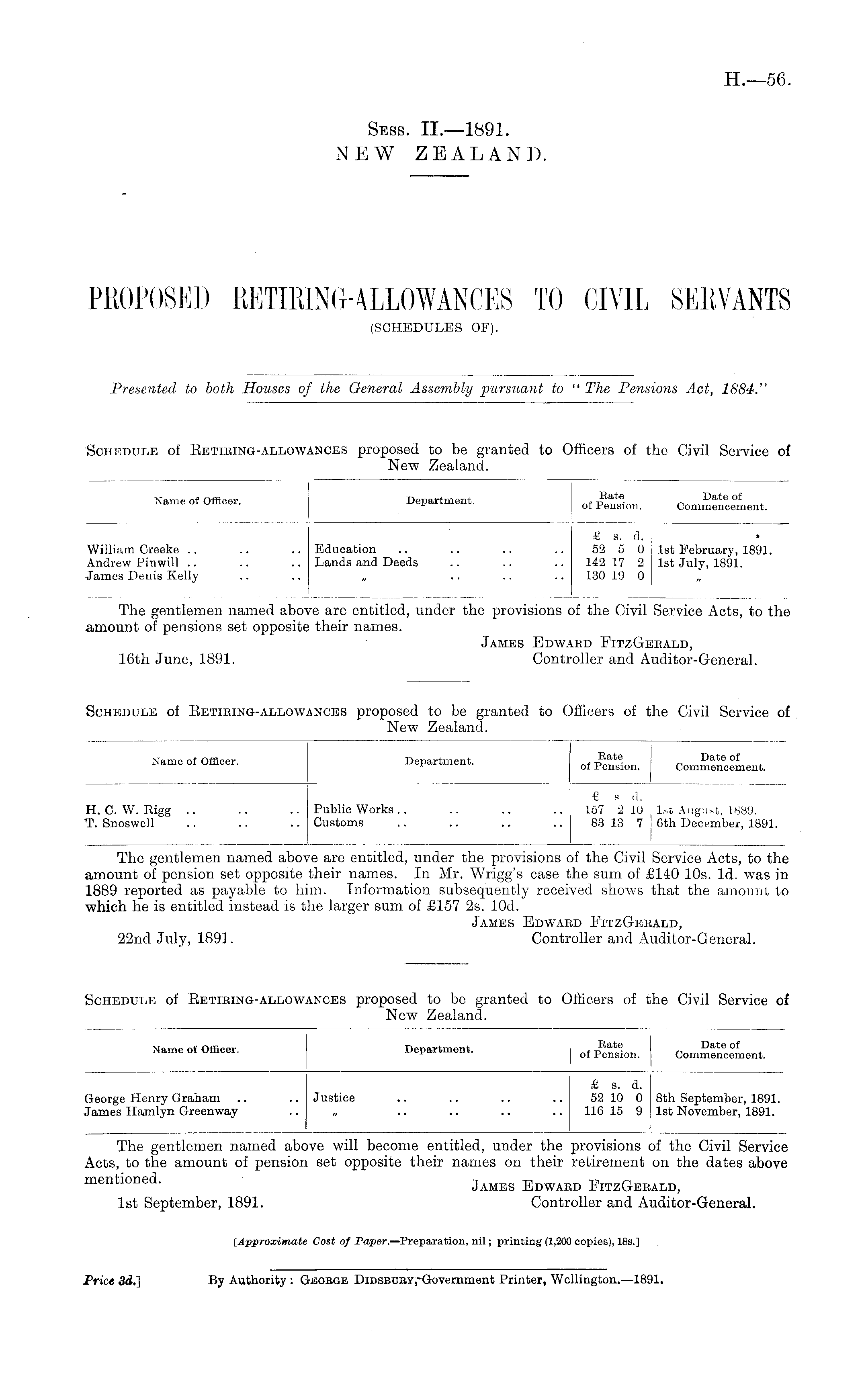 The gentlemen named above are entitled, under the provisions of the Civil Service Acts, to the amount of pension set opposite their names. In Mr. Wrigg's case the sum of £140 10s. Id. was in 1889 reported as payable to him. Information subsequently received shows that the amount to which he is entitled instead is the larger sum of £157 2s. lOd. James Bdwabd FitzGeeald, 22nd July, 1891. Controller and Auditor-General.