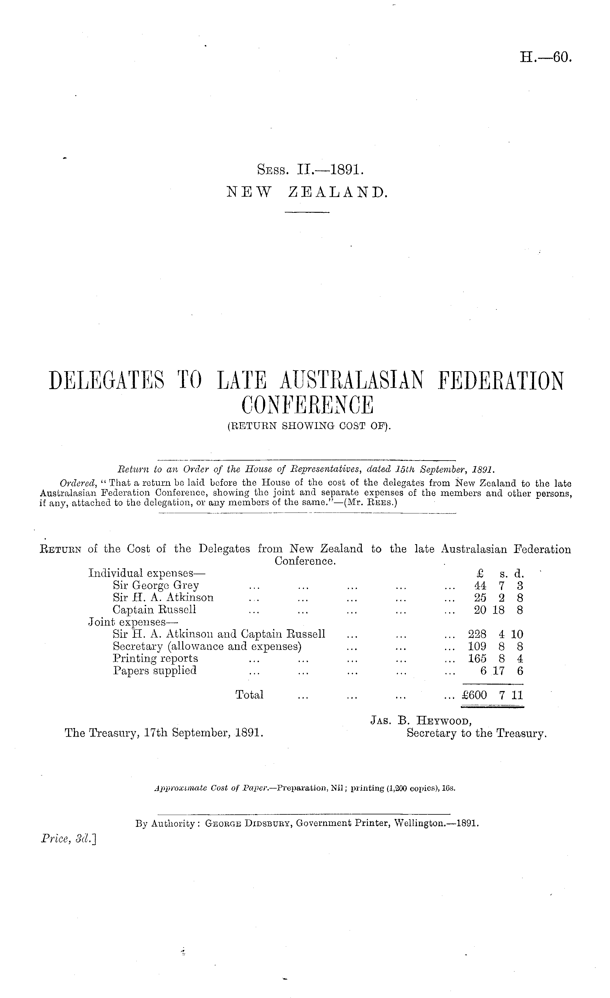 Eetuen of the Cost of the Delegates from New Zealand to the late Australasian Federation Conference. Individual expenses— £ a. d. Sir George Grey ... ... ... ... ... 44 7 3 Sir H. A. Atkinson ... ... ... ... ... 25 2 8 Captain Eussell ... ... ... ... ... 20 18 8 Joint expenses — Sir 11. A. Atkinson and Captain Eussell ... ... ... 228 410 Secretary (allowance and expenses) ... ... ... 109 8 8 Printing reports ... ... ... ... ... 165 8 4 Papers supplied ... ... ... ... ... 6 17 6 Total ... ... ... ... £600 7 11 Jas. B. Heywood, The Treasury, 17th September, 1891. Secretary to the Treasury. Approximate Cost of Paper. — Preparation, Nil; printing (1,200 copies), 16s.