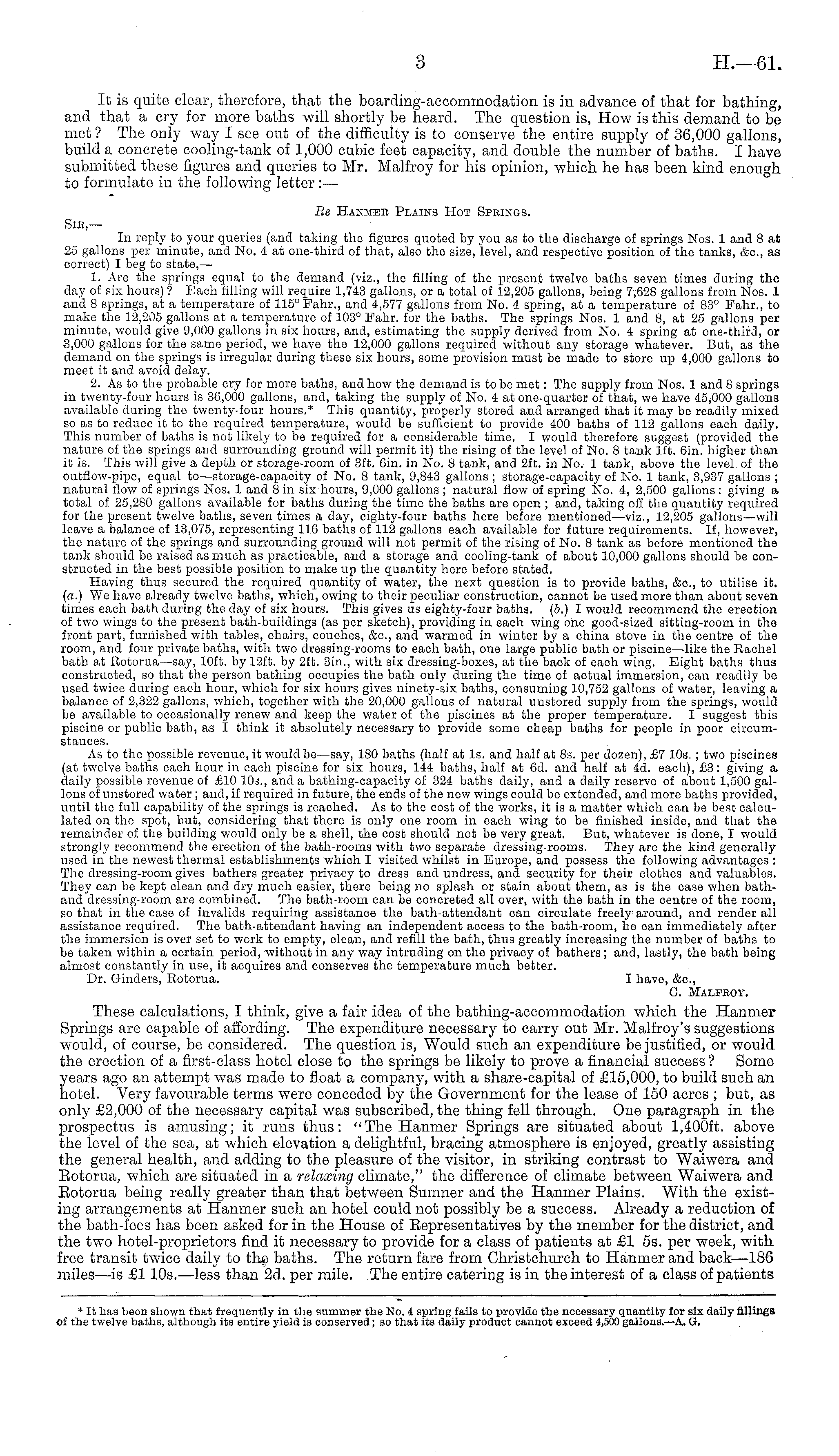 It is quite clear, therefore, that the boarding-accommodation is in advance of that for bathing, and that a cry for more baths will shortly be heard. The question is, How is this demand to be met? The only way I see out of the difficulty is to conserve the entire supply of 36,000 gallons, build a concrete cooling-tank of 1,000 cubic feet capacity, and double the number of baths. I have submitted these figures and queries to Mr. Malfroy for his opinion, which he has been kind enough to formulate in the following letter: — Re Hanmeb Plains Hot Springs. Sik,— In reply to your queries (and taking the figures quoted by you as to the discharge of springs Nos. 1 and 8 at 25 gallons per minute, and No. 4 at one-third of that, also the size, level, and respective position of the tanks, &c, as correct) I beg to state, — 1. Are the springs equal to the demand (viz., the filling of the present twelve baths seven times during the day of six hours) ? Each filling will require 1,743 gallons, or a total of 12,205 gallons, being 7,628 gallons from Nos. 1 and 8 springs, at a temperature of 115°Pahr., and 4,577 gallons from No. 4 spring, at a temperature of 83° Fahr., to make the 12,205 gallons at a temperature of 103° Fahr. for the baths. The springs Nos. 1 and 8, at 25 gallons per minute, would give 9,000 gallons in six hours, and, estimating the supply derived from No. 4 spring at one-third, or 3,000 gallons for the same period, we have the 12,000 gallons required without any storage whatever. But, as the demand on the springs is irregular during these six hours, some provision must be made to store up 4,000 gallons to meet it and avoid delay. 2. As to the probable cry for more baths, and how the demand is to be met: The supply from Nos. 1 and 8 springs in twenty-four hours is 36,000 gallons, and, taking the supply of No. 4 at one-quarter of that, we have 45,000 gallons available during the twenty-four hours.* This quantity, properly stored and arranged that it may be readily mixed so as to reduce it to the required temperature, would be sufficient to provide 400 baths of 112 gallons each daily. This number of baths is not likely to be required for a considerable time. I would therefore suggest (provided the nature of the springs and surrounding ground will permit it) the rising of the level of No. 8 tank lft. 6in. higher than it is. This will give a depth or storage-room of 3ft. 6in. in No. 8 tank, and 2ft. in No. 1 tank, above the level of the outflow-pipe, equal to—storage-capacity of No. 8 tank, 9,843 gallons ; storage-capacity of No. 1 tank, 3,937 gallons ; natural flow of springs Nos. 1 and 8 in six hours, 9,000 gallons ; natural flow of spring No. 4, 2,500 gallons : giving a total of 25,280 gallons available for baths during the time the baths are open ; and, taking off the quantity required for the present twelve baths, seven times a day, eighty-four baths hero before mentioned—viz., 12,205 gallons—will leave a balance of 13,075, representing 116 baths of 112 gallons each available for future requirements. If, however, the nature of the springs and surrounding ground will not permit of the rising of No. 8 tank as before mentioned the tank should be raised as much as practicable, and a storage and cooling-tank of about 10,000 gallons should be constructed in the best possible position to make up the quantity here before stated. Having thus secured the required quantity of water, the next question is to provide baths, &c, to utilise it. (a.) We have already twelve baths, which, owing to their peculiar construction, cannot be used more than about seven times each bath during the day of six hours. This gives us eighty-four baths, (b.) I would recommend the erection of two wings to the present bath-buildings (as per sketch), providing in each wing one good-sized sitting-room in the front part, furnished with tables, chairs, couches, &c, and warmed in winter by a china stove in the centre of the room, and four private baths, with two dressing-rooms to each bath, one large public bath or piscine—like the Eachel bath at Eotorua —say, 10ft. by 12ft. by 2ft. 3in., with six dressing-boxes, at the back of each wing. Eight baths thus constructed, so that the person bathing occupies the bath only during the time of actual immersion, can readily be used twice during each hour, which for six hours gives ninety-six baths, consuming 10,752 gallons of water, leaving a balance of 2,322 gallons, which, together with the 20,000 gallons of natural unstored supply from the springs, would be available to occasionally renew and keep the water of the piscines at the proper temperature. I suggest this piscine or public bath, as I think it absolutely necessary to provide some cheap baths for people in poor circumstances. As to the possible revenue, it would be —say, 180 baths (half at Is. and half at Ss. per dozen), £7 10s. ; two piscines (at twelve baths each hour in each piscine for six hours, 144 baths, half at 6d. and half at 4d. each), £3: giving a daily possible revenue of £10 10s., and a bathing-capacity of 324 baths daily, and a daily reserve of about 1,500 gallons of unstored water; and, if required in future, the ends of the new wings could be extended, and more baths provided, until the full capability of the springs is reached. As to the cost of the works, it is a matter which can be best calculated on the spot, but, considering that there is only one room in each wing to bo finished inside, and that the remainder of the building would only be a shell, the cost should not be very great. But, whatever is done, I would strongly recommend the erection of the bath-rooms with two separate dressing-rooms. They are the kind generally used in the newest thermal establishments which I visited whilst in Europe, and possess the following advantages : The dressing-room gives bathers greater privacy to dross and undress, and security for their clothes and valuables. They can be kept clean and dry much