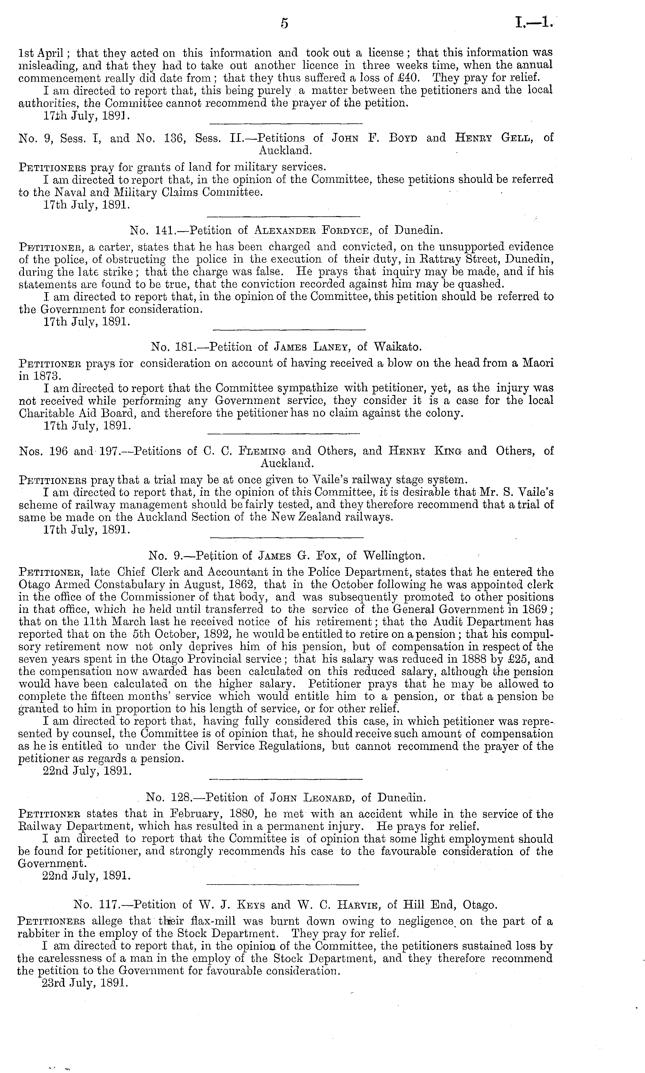 No. 9.—Petition of James G. Fox, of Wellington. Petitionee, late Chief Clerk and Accountant in the Police Department, states that he entered the Otago Armed Constabulary in August, 1862, that in the October following he was appointed clerk in the office of the Commissioner of that body, and was subsequently promoted to other positions in that office, which he held until transferred to the service of the General Government in 1869 ; that on the 11th March last he received notice of his retirement; that the Audit Department has reported that on the sth October, 1892, he would be entitled to retire on a pension ; that his compulsory retirement now not only deprives him of his pension, but of compensation in respect of the seven years spent in the Otago Provincial service; that his salary was reduced in 1888 by £25, and the compensation now awarded has been calculated on this reduced salary, although the pension would have been calculated on the higher salary. Petitioner prays that he may be allowed to complete the fifteen months' service which would entitle him to a pension, or that a pension be granted to him in proportion to his length of service, or for other relief. I am directed to report that, having fully considered this case, in which petitioner was represented by counsel, the Committee is of opinion that, he should receive such amount of compensation as he is entitled to under the Civil Service Eegulations, but cannot recommend the prayer of the petitioner as regards a pension. 22nd July, 1891.