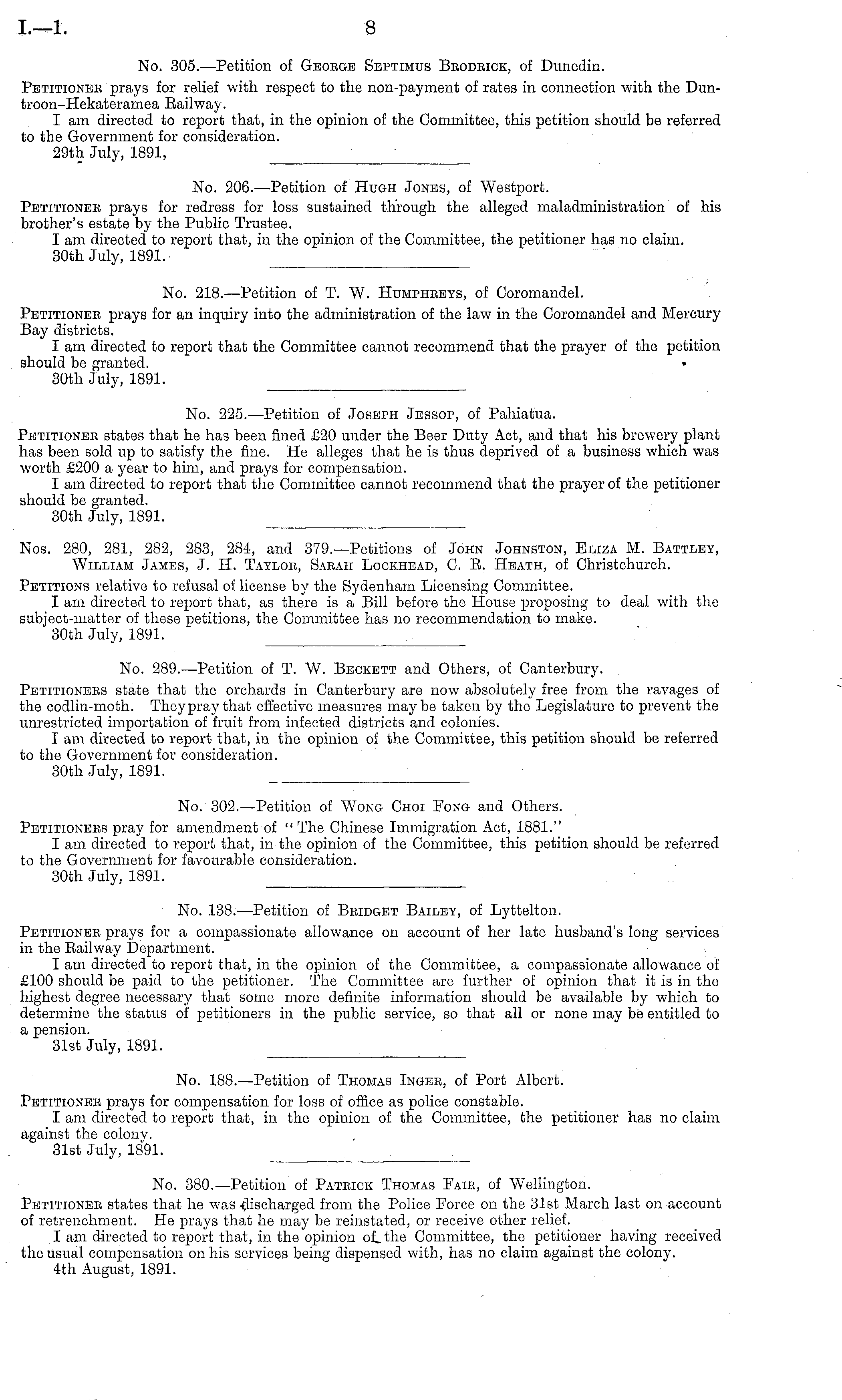 No. 305.—Petition of George Septimus Brodrick, of Dunedin. Petitioner prays for relief with respect to the non-payment of rates in connection with the Dun-troon-Hekateramea Eailway. I am directed to report that, in the opinion of the Committee, this petition should be referred to the Government for consideration. 29th July, 1891,