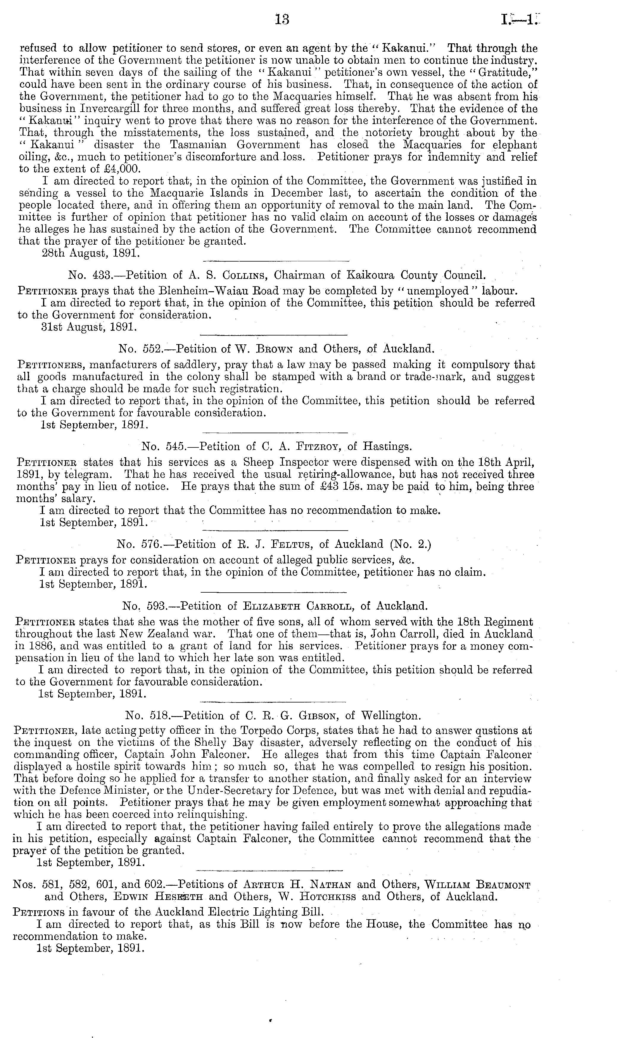 refused to allow petitioner to send stores, or even an agent by the " Kakanui." That through the interference of the Government the petitioner is now unable to obtain men to continue the industry. That within seven days of the sailing of the " Kakanui " petitioner's own vessel, the " Gratitude," could have been sent in the ordinary course of his business. That, in consequence of the action of the Government, the petitioner had to go to the Macquaries himself. That he was absent from his business in Invercargill for three months, and suffered great loss thereby. That the evidence of the " Kakanui" inquiry went to prove that there was no reason for the interference of the Government. That, through the misstatements, the loss sustained, and the notoriety brought about by the " Kakanui " disaster the Tasrnanian Government has closed the Macquaries for elephant oiling, &c, much to petitioner's discomforture and loss. Petitioner prays for indemnity and relief to the extent of £4,000. I am directed to report that, in the opinion of the Committee, the Government was justified in sending a vessel to the Macquarie Islands in December last, to ascertain the condition of the people located there, and in offering them an opportunity of removal to the main land. The Committee is further of opinion that petitioner has no valid claim on account of the losses or damages he alleges he has sustained by the action of the Government. The Committee cannot recommend that the prayer of the petitioner be granted. 28th August, 1891.
