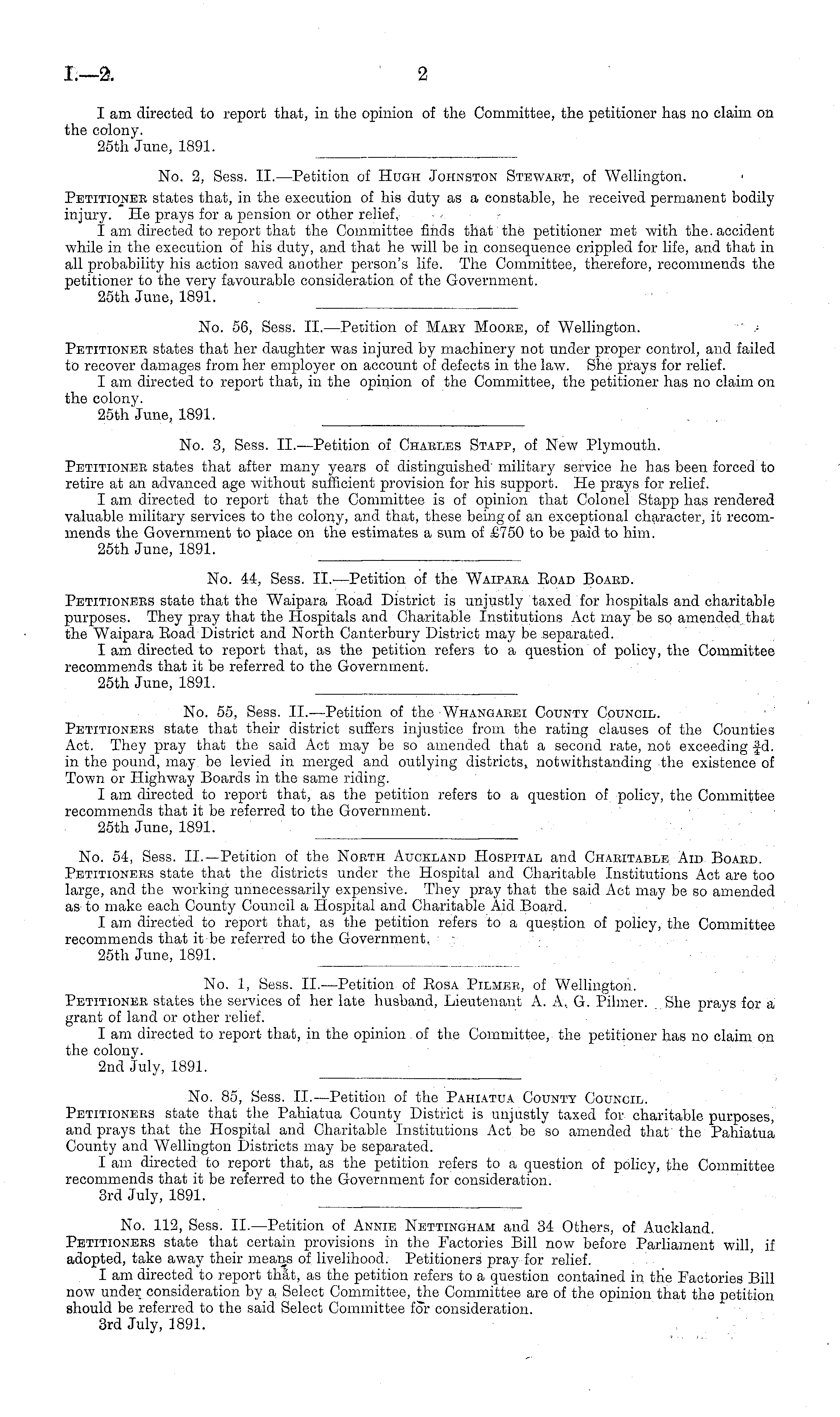 No. 112, Sess. II. —Petition of Annie Nettingham and 34 Others, of Auckland. Petitionees state that certain provisions in the Factories Bill now before Parliament will, if adopted, take away their means of livelihood. Petitioners pray for relief. I am directed to report that, as the petition refers to a question contained in the Factories Bill now under consideration by a Select Committee, the Committee are of the opinion that the petition should be referred to the said Select Committee for consideration. 3rd July, 1891.