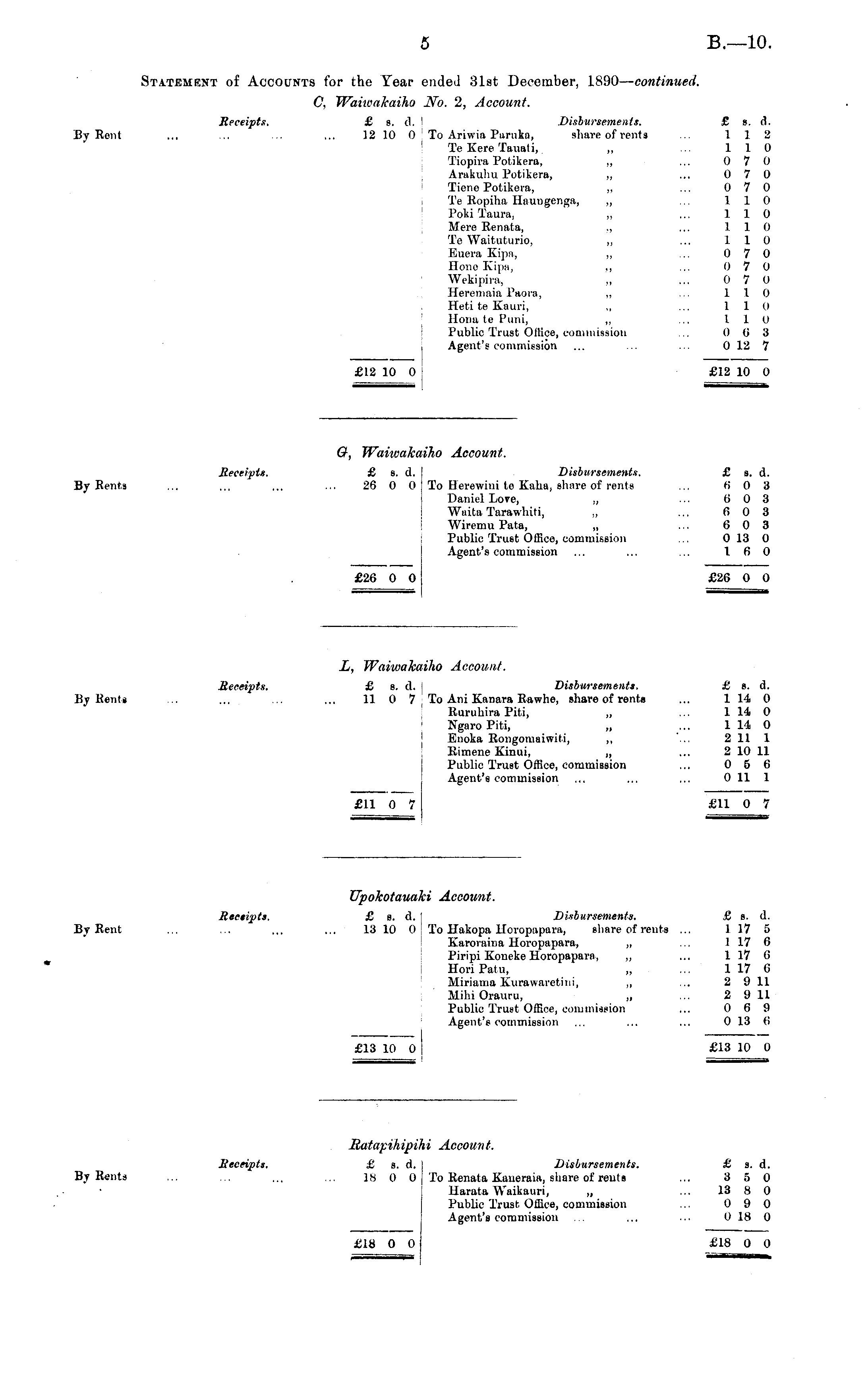 Upokotauaki Account. Receipts. £ s. d. j Disbursements. £ s. d. By Rent ... ... ... ... 13 10 OTo Hakopa Horopapara, share of rents ... 117 5 Karoraina Horopapara, „ ... 1 17 6 Piripi Koneke Horopapara, ~ ... 1 17 6 HoriPatu, „ ... 1 17 6 Miriama Kurawaretini, ~ ... 2 9 11 MihiOrauru, „ ... 2 9 11 Public Trust Office, commission ... 0 6 9 Agent's commission ... ... ... 013 6 £13 10 0 £13 10 0