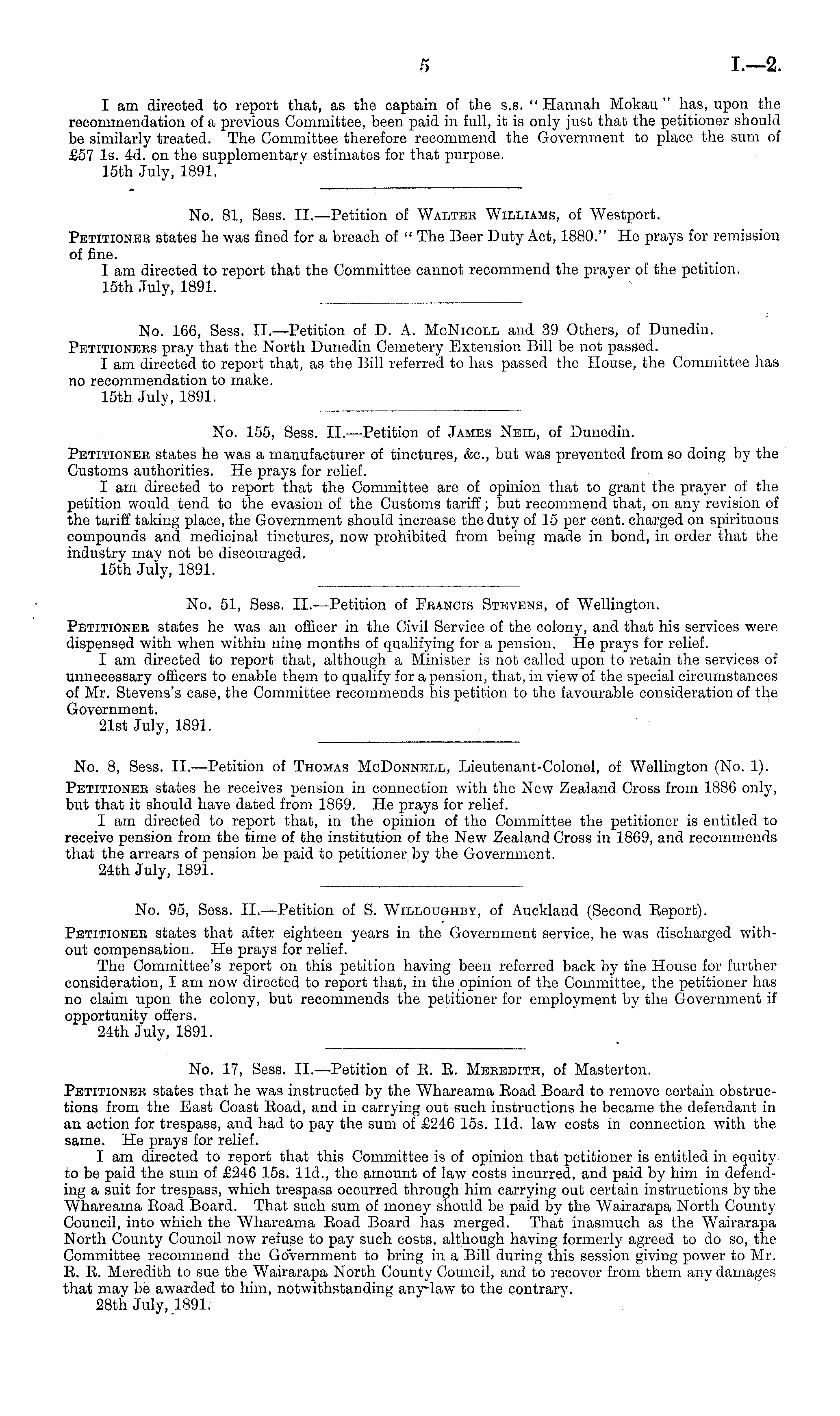 No. 8, Sess. ll.—Petition of Thomas McDonnell, Lieutenant-Colonel, of Wellington (No. 1). Petitionee states he receives pension in connection with the New Zealand Cross from 1886 only, but that it should have dated from 1869. He prays for relief. I am directed to report that, in the opinion of the Committee the petitioner is entitled to receive pension from the time of the institution of the New Zealand Cross in 1869, and recommends that the arrears of pension be paid to petitioner by the Government. 24th July, 1891.