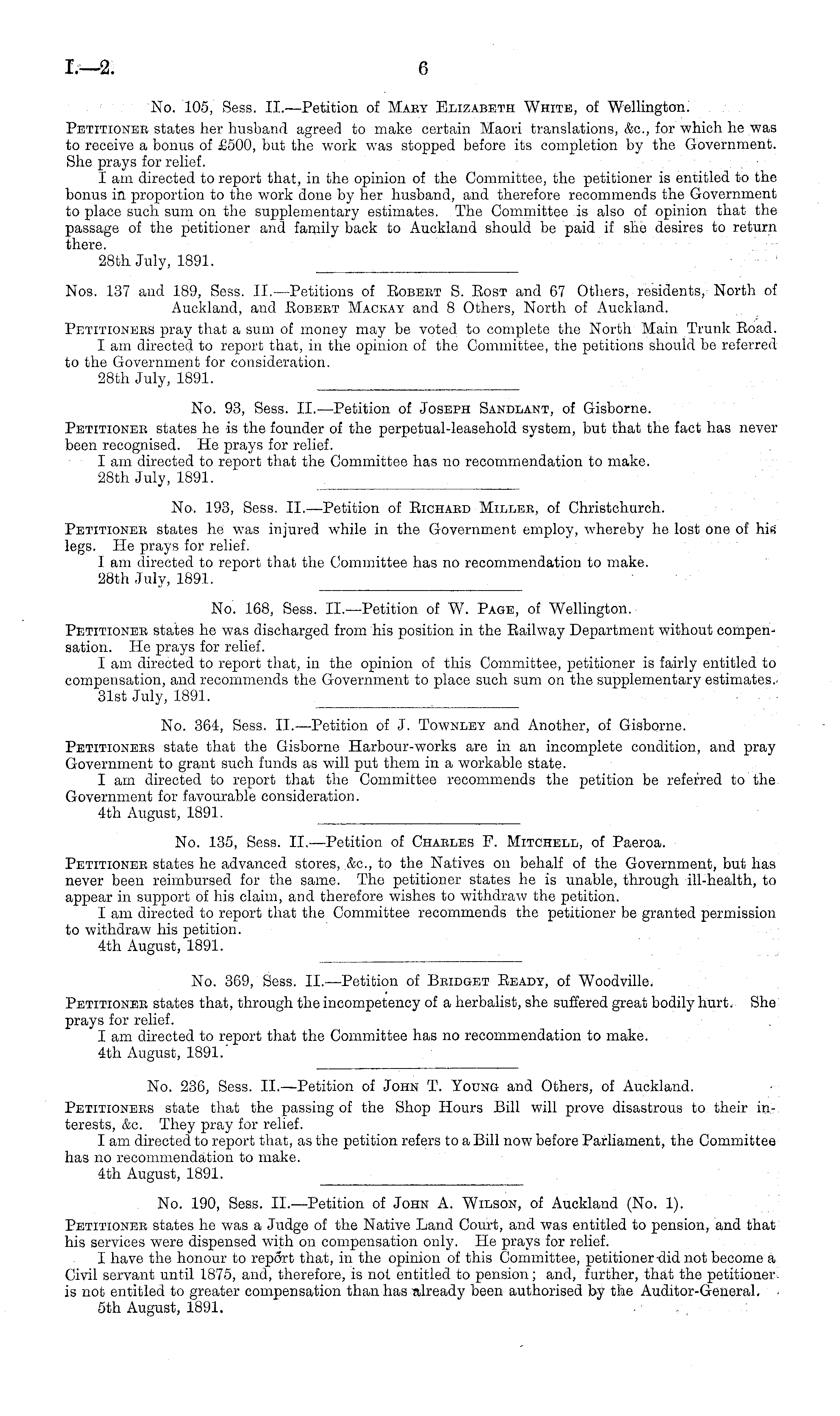 No. 236, Sess. ll.—Petition of John T. Young and Others, of Auckland. Petitionees state that the passing of the Shop Hours Bill will prove disastrous to their interests, &c. They pray for relief. I am directed to report that, as the petition refers to a Bill now before Parliament, the Committee has no recommendation to make. 4th August, 1891.