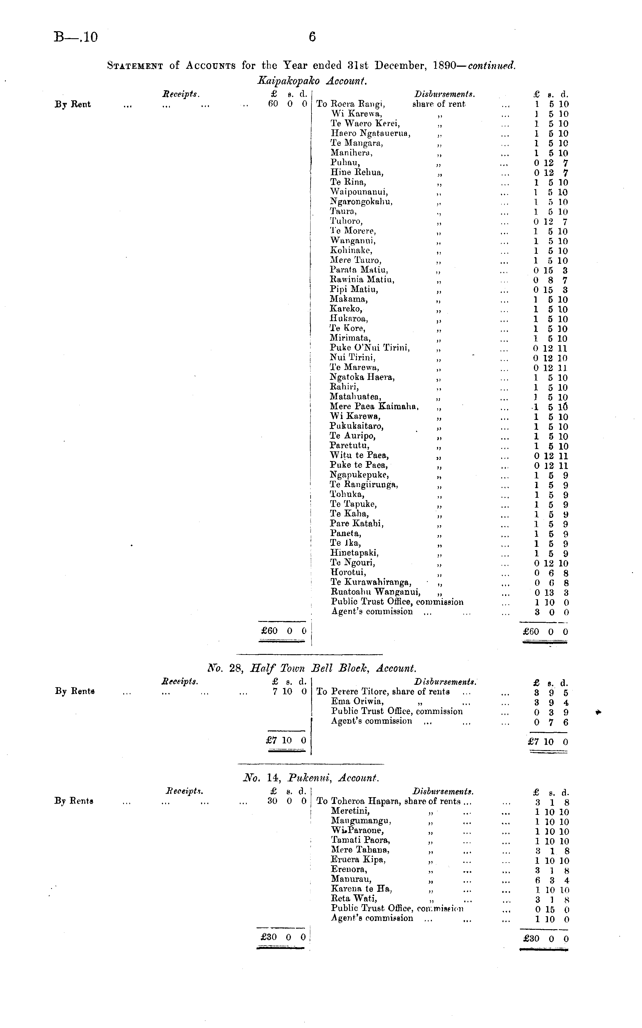 No. 28, Half Town Bell Block, Account. Receipts. £ s. d. Disbursements. £ 6 . J. By Rent* ... ... ... ... 710 0 To Perere Titore, share of rents ... ... 3 9 5 Ema Oriwia, ~ ... ... 3 9 4 Public Trust Office, commission ... 0 3 9 Agent's commission ... ~, ... 0 7 6 £7 10 0 £7 10 0