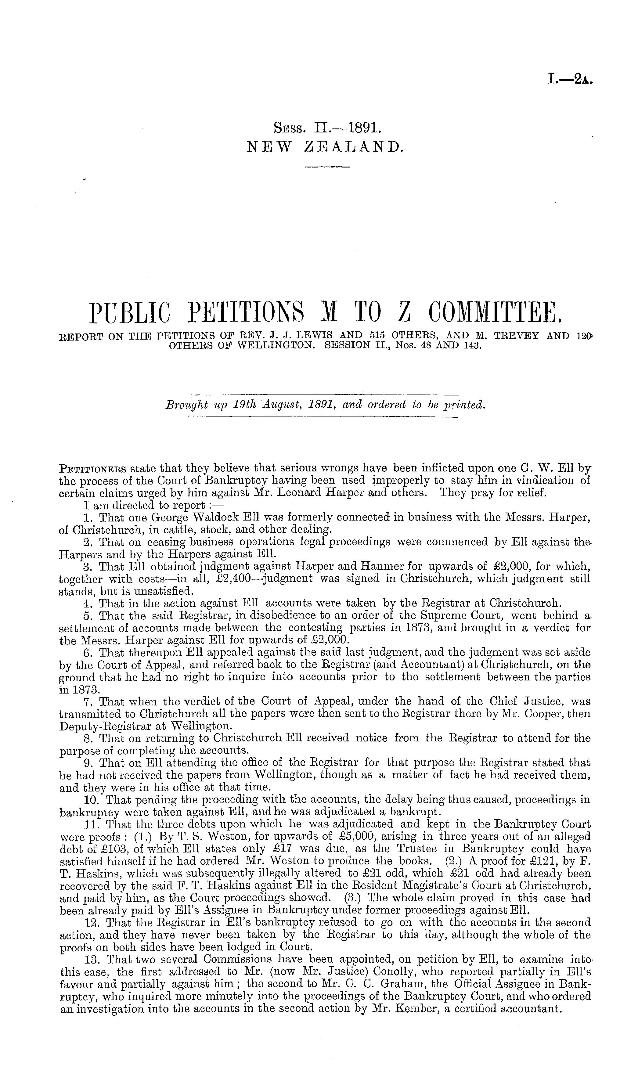 Petitioneks state that they believe that serious wrongs have been inflicted upon one G. W. Ell by the process of the Court of Bankruptcy having been used improperly to stay him in vindication of certain claims urged by him against Mr. Leonard Harper and others. They pray for relief. I am directed to report: — 1. That one George Waldock Ell was formerly connected in business with the Messrs. Harper,, of Christchurch, in cattle, stock, and other dealing. 2. That on ceasing business operations legal proceedings were commenced by Ell against the Harpers and by the Harpers against Ell. 3. That Ell obtained judgment against Harper and Hanmer for upwards of £2,000, for which,, together with costs—in all, £2,400 —judgment was signed in Christchurch, which judgment still stands, but is unsatisfied. 4. That in the action against Ell accounts were taken by the Eegistrar at Christchurch. 5. That the said Eegistrar, in disobedience to an order of the Supreme Court, went behind a settlement of accounts made between the contesting parties in 1873, and brought in a verdict for the Messrs. Harper against Ell for upwards of £2,000. 6. That thereupon Ell appealed against the said last judgment, and the judgment was set aside by the Court of Appeal, and referred back to the Eegistrar (and Accountant) at Christchurch, on the ground that he had no right to inquire into accounts prior to the settlement between the parties in 1873. 7. That when the verdict of the Court of Appeal, under the hand of the Chief Justice, was transmitted to Christchurch all the papers were then sent to the Eegistrar there by Mr. Cooper, then Deputy-Begistrar at Wellington. 8. That on returning to Christchurch Ell received notice from the Eegistrar to attend for the purpose of completing the accounts. 9. That on Ell attending the office of the Eegistrar for that purpose the Eegistrar stated that he had not received the papers from Wellington, though as a matter of fact he had received them, and they were in his office at that time. 10. That pending the proceeding with the accounts, the delay being thus caused, proceedings in bankruptcy were taken against Ell, and he was adjudicated a bankrupt. 11. That the three debts upon which he was adjudicated and kept in the Bankruptcy Court were proofs : (1.) By T. S. Weston, for upwards of £5,000, arising in three years out of an alleged debt of £103, of which Ell states only £17 was due, as the Trustee in Bankruptcy could have satisfied himself if he had ordered Mr. Weston to produce the books. (2.) A proof for £121, by P. T. Haskins, which was subsequently illegally altered to £21 odd, which £21 odd had already been recovered by the said F. T. Haskins against Ell in the Eesident Magistrate's Court at Christchureh, and paid by him, as the Court proceedings showed. (3.) The whole claim proved in this case had been already paid by Ell's Assignee in Bankruptcy under former proceedings against Ell. 12. That the Eegistrar in Ell's bankruptcy refused to go on with the accounts in the second action, and they have never been taken by the Eegistrar to this day, although the whole of the proofs on both sides have been lodged in Court. 13. That two several Commissions have been appointed, on petition by Ell, to examine into this case, the first addressed to Mr. (now Mr. Justice) Conolly, who reported partially in Ell's favour and partially against him ; the second to Mr. C. C. Graham, the Official Assignee in Bankruptcy, who inquired more minutely into the proceedings of the Bankruptcy Court, and who ordered an investigation into the accounts in the second action by Mr. Kember, a certified accountant.