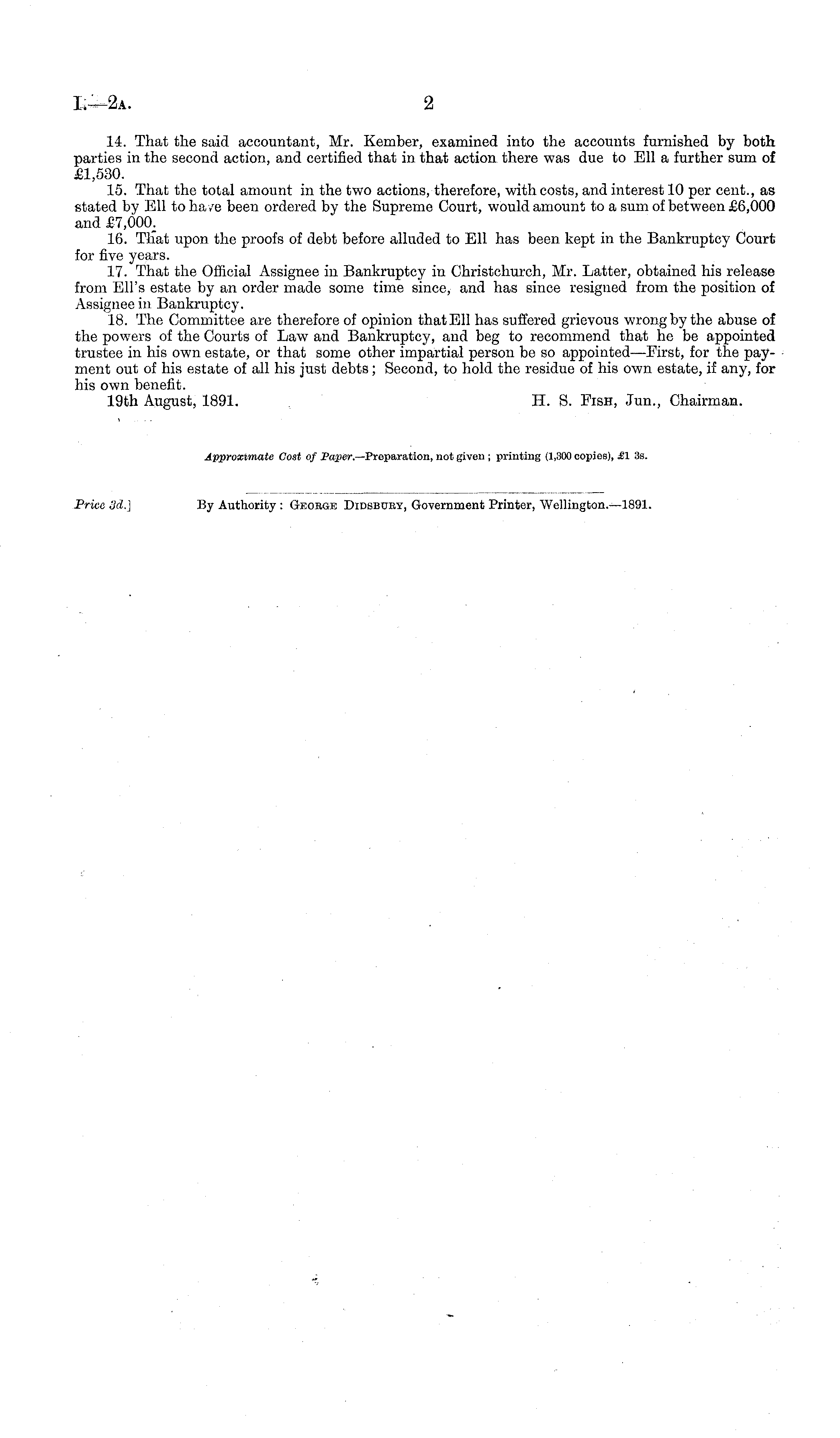 14. That the said accountant, Mr. Kember, examined into the accounts furnished by both parties in the second action, and certified that in that action there was due to Ell a further sum of £1,530. 15. That the total amount in the two actions, therefore, with costs, and interest 10 per cent., as stated by 3311 to have been ordered by the Supreme Court, would amount to a sum of between £6,000 and £7,000^ 16. That upon the proofs of debt before alluded to Ell has been kept in the Bankruptcy Court for five years. 17. That the Official Assignee in Bankruptcy in Christchurch, Mr. Latter, obtained his release from Ell's estate by an order made some time since, and has since resigned from the position of Assignee in Bankruptcy. 18. The Committee are therefore of opinion that Ell has suffered grievous wrong by the abuse of the powers of the Courts of Law and Bankruptcy, and beg to recommend that he be appointed trustee in his own estate, or that some other impartial person be so appointed —First, for the payment out of his estate of all his just debts; Second, to hold the residue of his own estate, if any, for his own benefit. 19th August, 1891. H. S. Fish, Jun., Chairman. Approximate Cost of Paper.— Preparation, not given ; printing (1,300 copies), £1 3s.