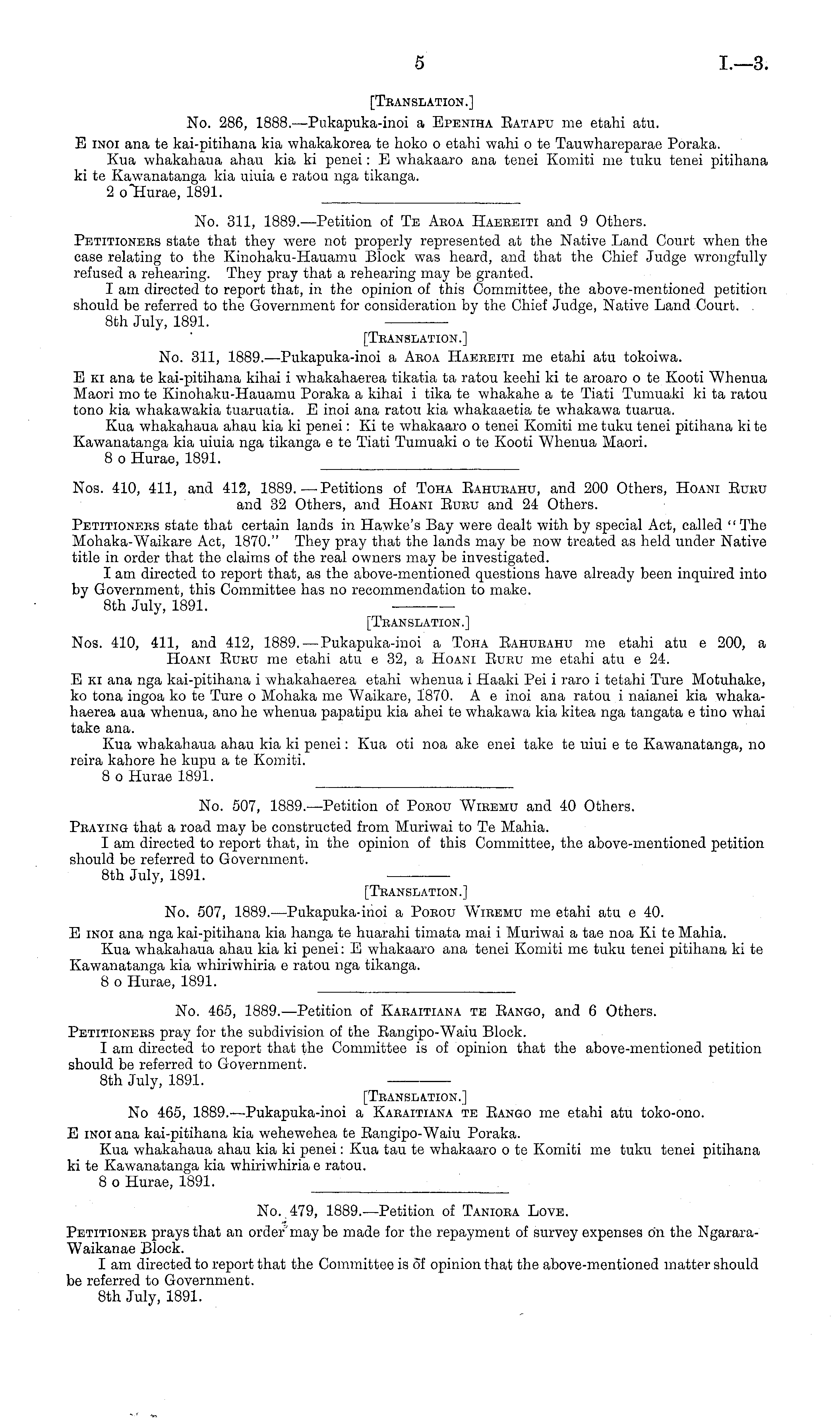 [Translation.] Nos. 410, 411, and 412, 1889.—Pukapuka-inoi a Toha Eahurahu me etahi atu c 200, a Hoani Euru me etahi atu c 32, a Hoani Euru me etahi atu c 24. E ki ana nga kai-pitihana i whakahaerea etahi whenua i Haaki Pei i raro i tetahi Ture Motuhake, ko tona ingoa ko te Ture o Mohaka me Waikare, 1870. A c inoi ana ratou i naianei kia whakahaerea aua whenua, ano he whenua papatipu kia ahei te whakawa kia kitea nga tangata c tino whai take ana. Kua wbakahaua ahau kia ki penei: Kua oti noa ake enei take te uiui etc Kawanatanga, no reira kahore he kupu a te Komiti. 8 o Hurae 1891.