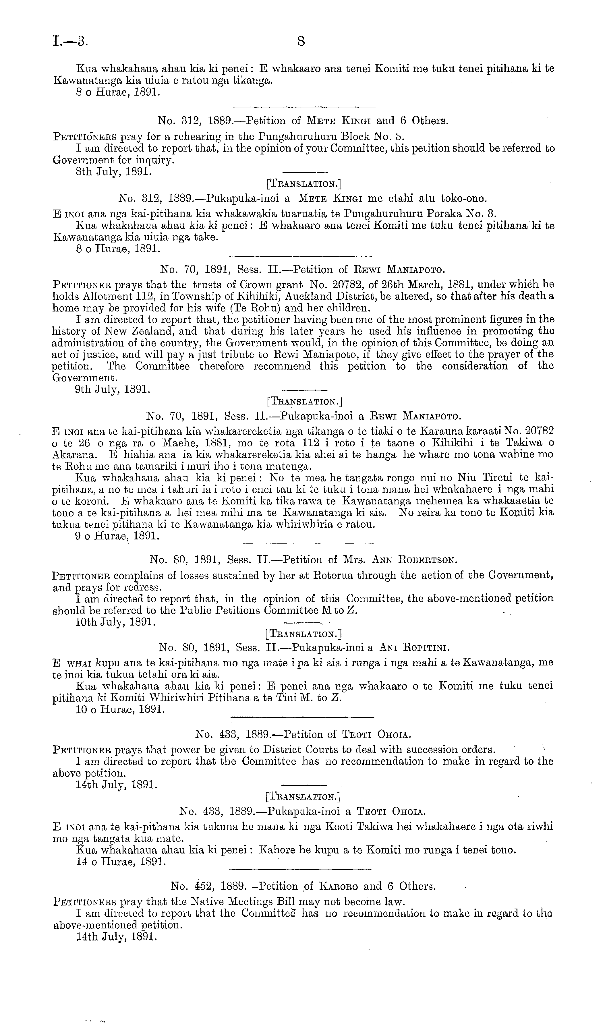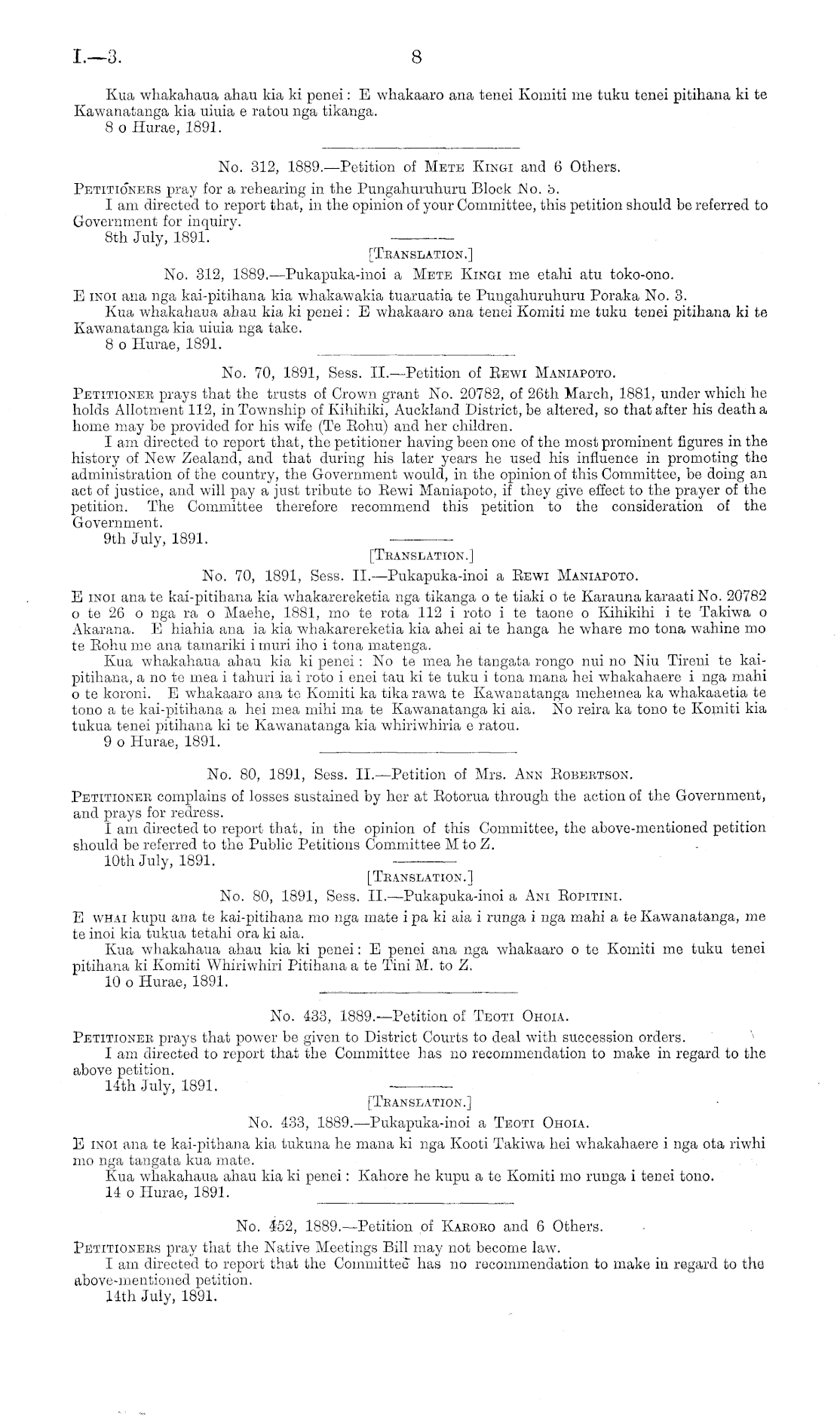 [Tbanslation.] No. 312, 1889.—Pukapuka-inoi a Mete Kingi me etahi atu toko-ono. E inoi ana nga kai-pitihana kia whakawakia tuaruatia te Pungahuruhuru Poraka No. 3. Kua whakahaua ahau kia ki penei: E whakaaro ana tenei Komiti me tuku tenei pitihana kite Kawanatanga kia uiuia nga take. 8 o Hurae, 1891.