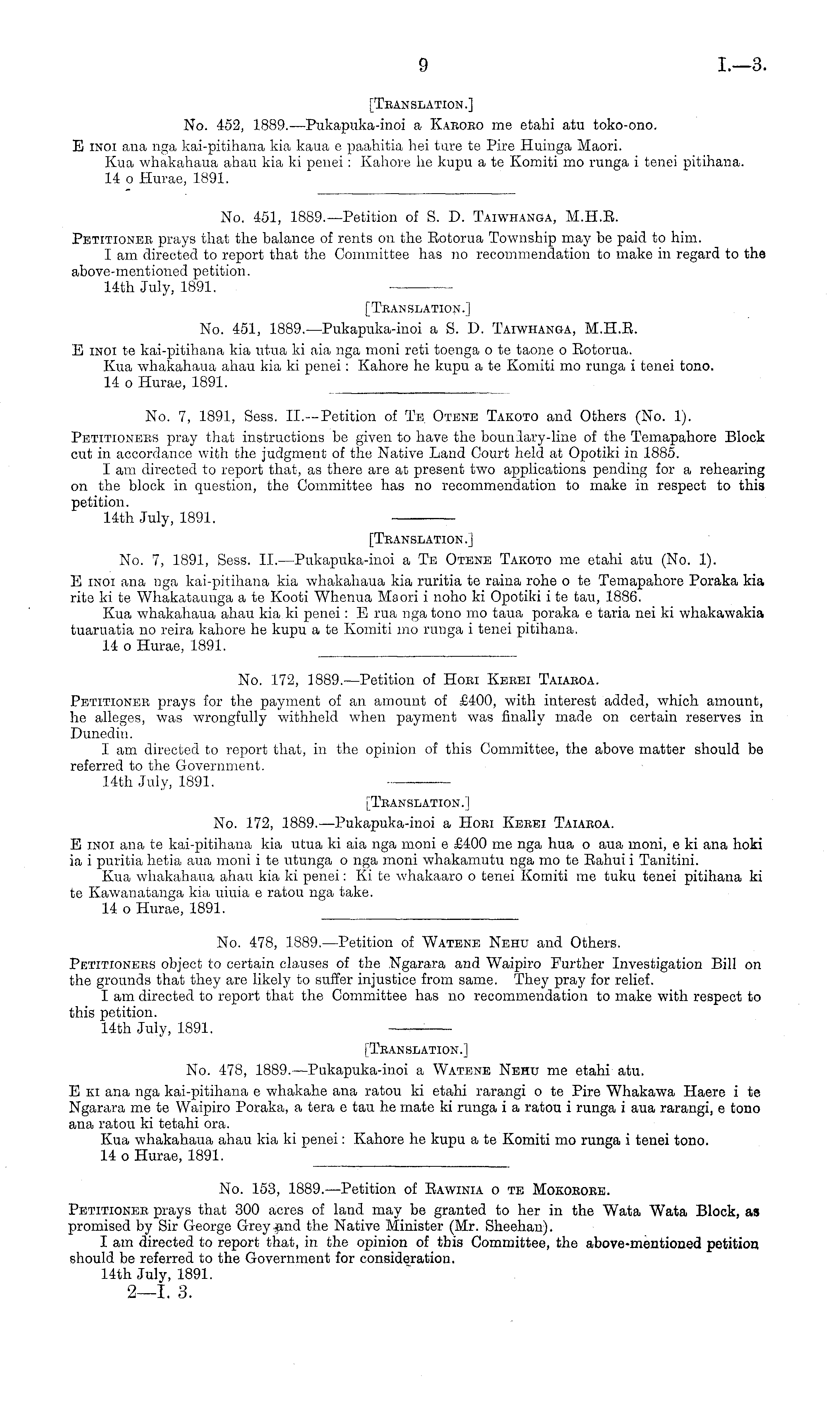 14th July, 1891. [Translation.] No. 172, 1889.—Pukapuka-inoi a Hobi Kebei Taiaboa. E inoi ana te kai-pitiharia kia utua ki aia nga moni c £400 me nga hua o aua moni, c ki ana hoki ia i puritia hetia aua moni i te utunga o nga moni whakamutu nga mo te Eahui i Tanitini. Kua whakahaua ahau kia ki penei: Xi te whakaaro o tenei Komiti me tuku tenei pitihana ki te Kawanatanga kia uiuia c ratou nga take. 14 o Hurae, 1891.