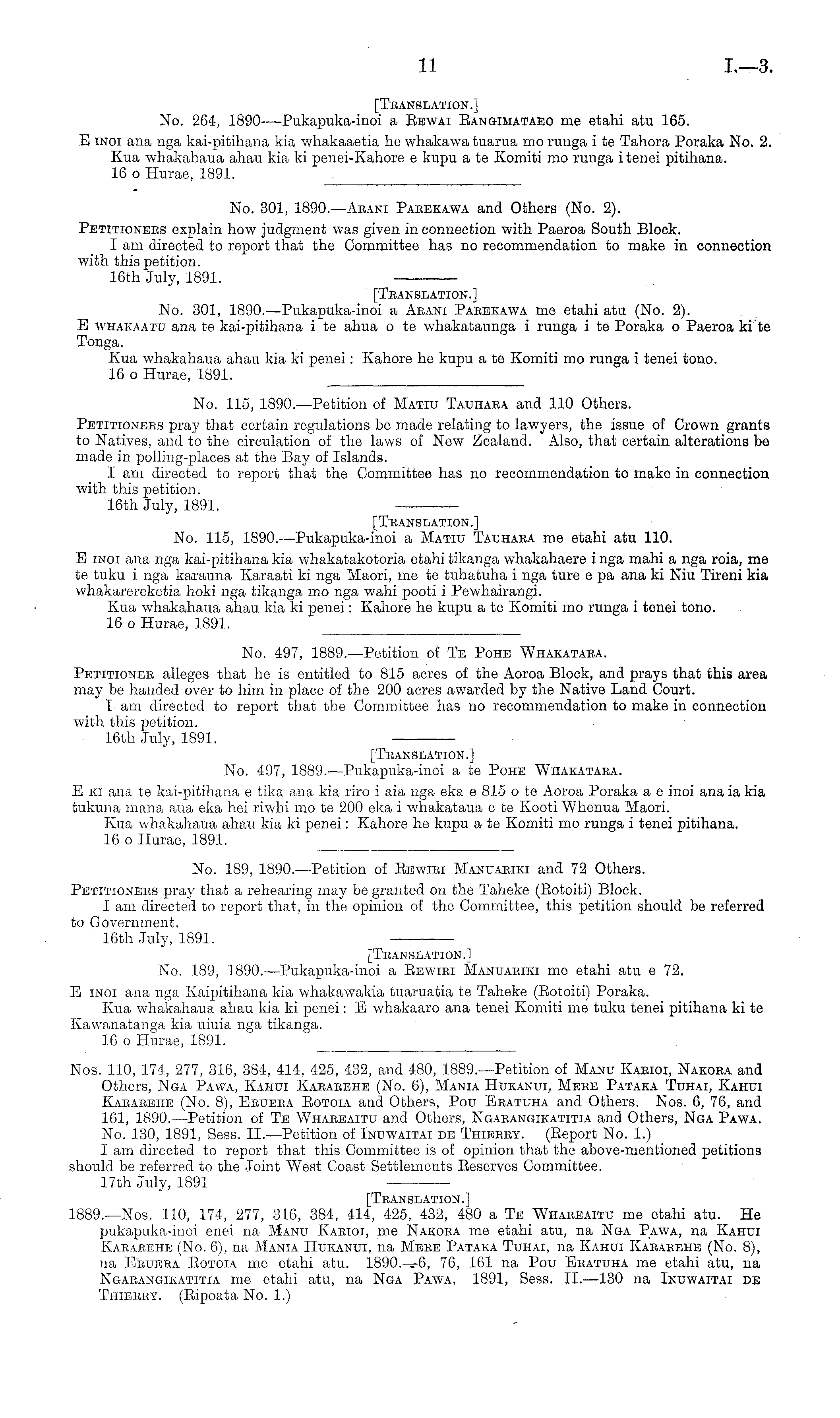 16th July, 1891. [Translation.] No. 301, 1890.—Pukapuka-inoi a Aeani Paeekawa me etahi atu (No. 2). E whakaatu ana te kai-pitihana i te ahua o te whakataunga i runga i te Poraka o Paeroa kite Tonga. Kua whakahaua ahau kia ki penei: Kahore he kupu ate Komiti mo runga i tenei tono. 16 o Hurae, 1891.