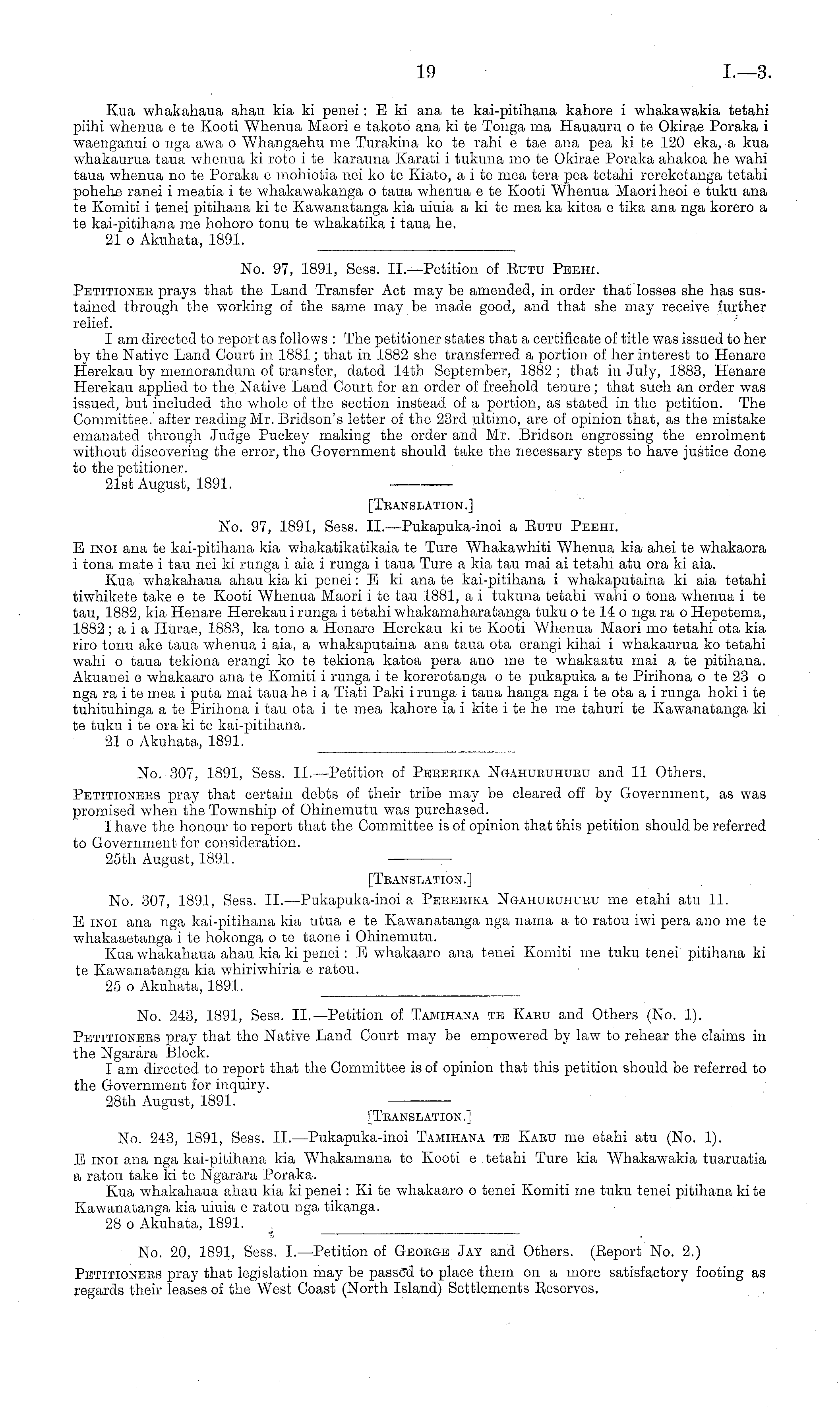 21st August, 1891. [Translation.] No. 97, 1891, Sess. ll.—Pukapuka-inoi a Eutu Peehi. E inoi ana te kai-pitihana kia whakatikatikaia te Ture Whakawhiti Whenua kia ahei te whakaora i tona mate i tau nei ki runga i aia i runga i taua Ture a kia tau mai ai tetahi atu ora ki aia. Kua whakahaua ahau kia ki penei: E ki ana te kai-pitihana i whakaputaina ki aia tetahi tiwhikete take c te Kooti Whenua Maori, i te tau 1881, a i tukuna tetahi wahi o tona whenua i te tau, 1882, kia Henare Herekau i runga i tetahi whakamaharatanga tuku o te 14 o nga ra o Hepetema, 1882; ai a Hurae, 1883, ka tono a Henare Herekau kite Kooti Whenua Maori mo tetahi ota kia riro tonu ake taua whenua i aia, a whakaputaina ana taua ota erangi kihai i whakaurua ko tetahi wahi o taua tekiona erangi ko te tekiona katoa pera ano me te whakaatu mai a te pitihana. Akuanei c whakaaro ana te Komiti i runga i te korerotanga o te pukapuka a te Pirihona o te 23 o nga ra i te mea i puta mai taua he i a Tiati Paki i runga i tana hanga nga i te ota a i runga hold i te tuhituhinga a te Pirihona i tau ota i te mea kahore ia i kite i te he me tahuri te Kawanatanga ki te tuku i te ora kite kai-pitihana. 21 o Akuhata, 1891.
