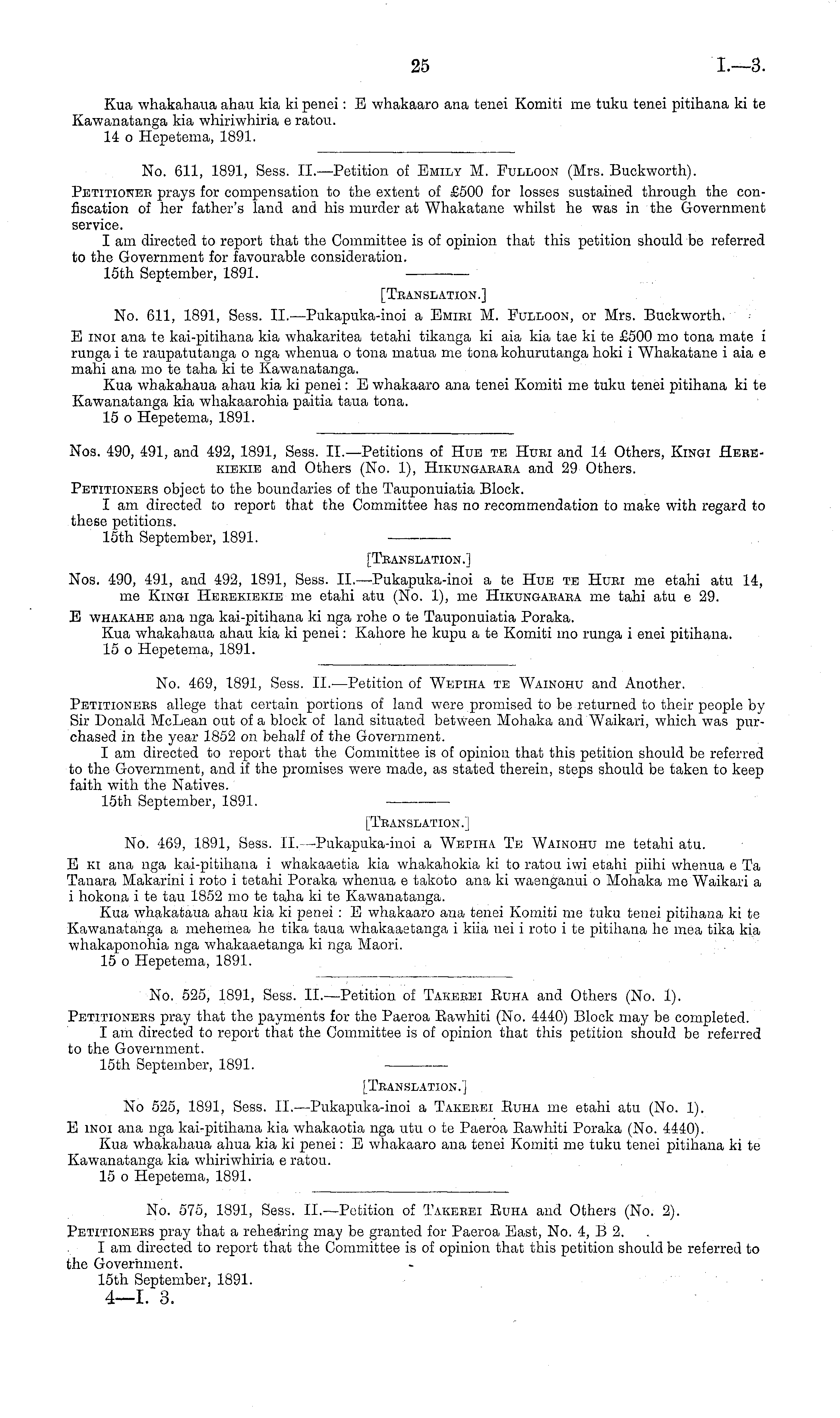 [Translation.] No. 469, 1891, Sess. ll.—Pukapuka-inoi a Wbpiha Te Wainohu me tetahi atu. E ki ana nga kai-pitihana i whakaaetia kia whakahokia ki to ratou iwi etahi piihi whenua c Ta Tanara Makarini i roto i tetahi Poraka whenua c takoto ana ki waenganui o Mohaka me Waikari a i hokona i te tau 1852 mo te taha kite Kawanatanga. Kua whakataua ahau kia ki peuei : E whakaaro ana tenei Komiti me tuku tenei pitihana kite Kawanatanga a mehemea he tika taua whakaaetanga i kiia nei i roto i te pitihana he mea tika kia whakaponohia nga whakaaetanga ki nga Maori. 15 o Hepetema, 1891.