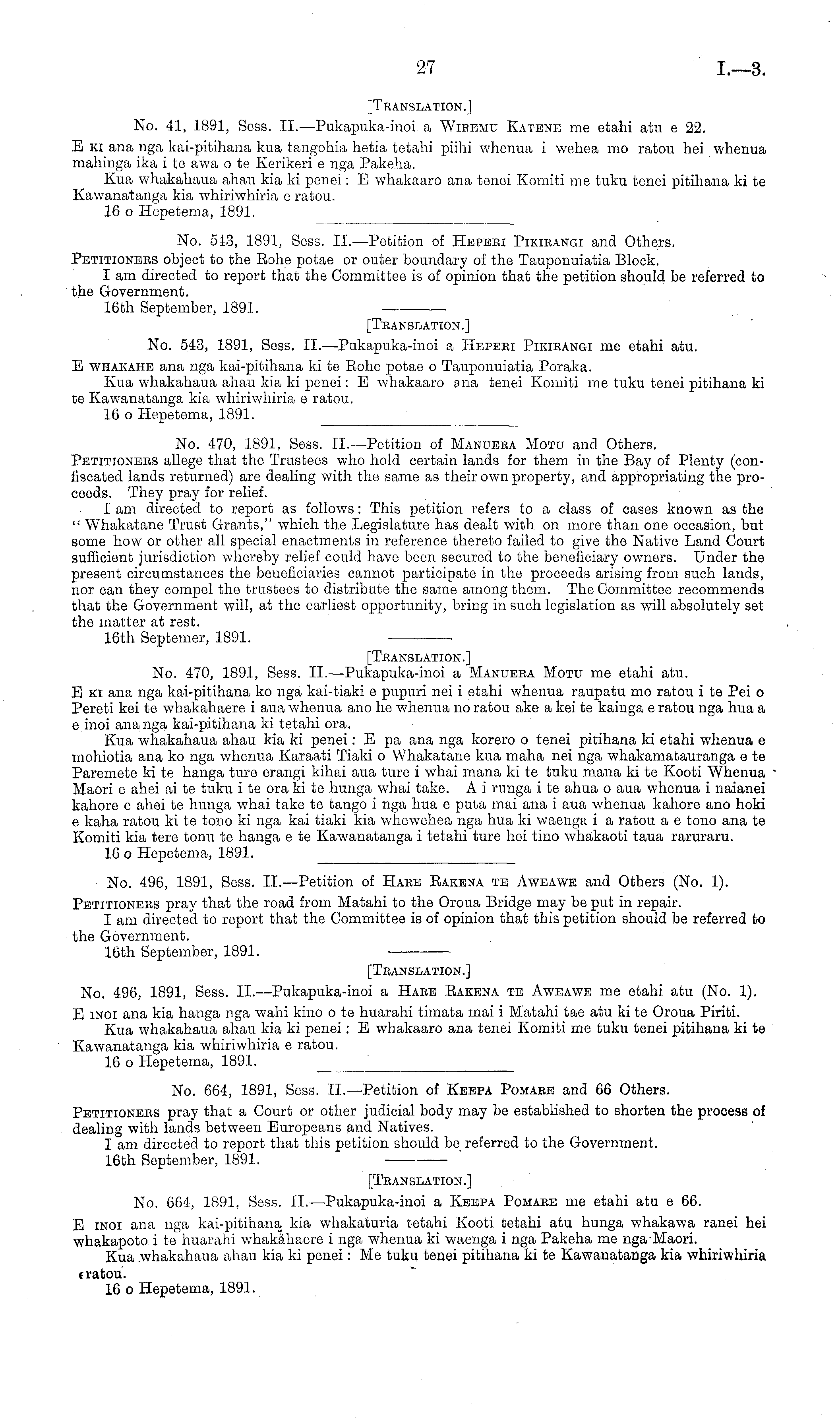 [Translation.] No. 470, 1891, Sess. II. —Pukapuka-inoi a Manuera Motu me etahi atu. E ki ana nga kai-pitihana ko nga kai-tiaki c pupuri nei i etahi whenua raupatu mo ratou i te Pei o Pereti kei te whakahaere i aua whenua ano he whenua no ratou ake a kei te kainga c ratou nga hua a c inoi ana nga kai-pitihana ki tetahi ora. Kua whakahaua ahau kia ki penei: E pa ana nga korero o tenei pitihana ki etahi whenua c mohiotia ana ko nga whenua Karaati Tiaki o Whakatane kua maha nei nga whakamatauranga c te Paremete kite hanga ture erangi kihai aua ture i whai mana kite tuku mana kite Kooti Whenua Maori c ahei ai te tuku ite ora kite hunga whai take. A i runga ite ahua o aua whenua i naianei kahore c ahei te hunga whai take te tango i nga hua c puta mai ana i aua whenua kahore ano hoki c kaha ratou kite tono ki nga kai tiaki kia whewehea nga hua ki waenga i a ratou a c tono ana te Komiti kia tere tonu te hanga c te Kawanatanga i tetahi ture hei tino whakaoti taua raruraru. 16 o Hepetema, 1891.