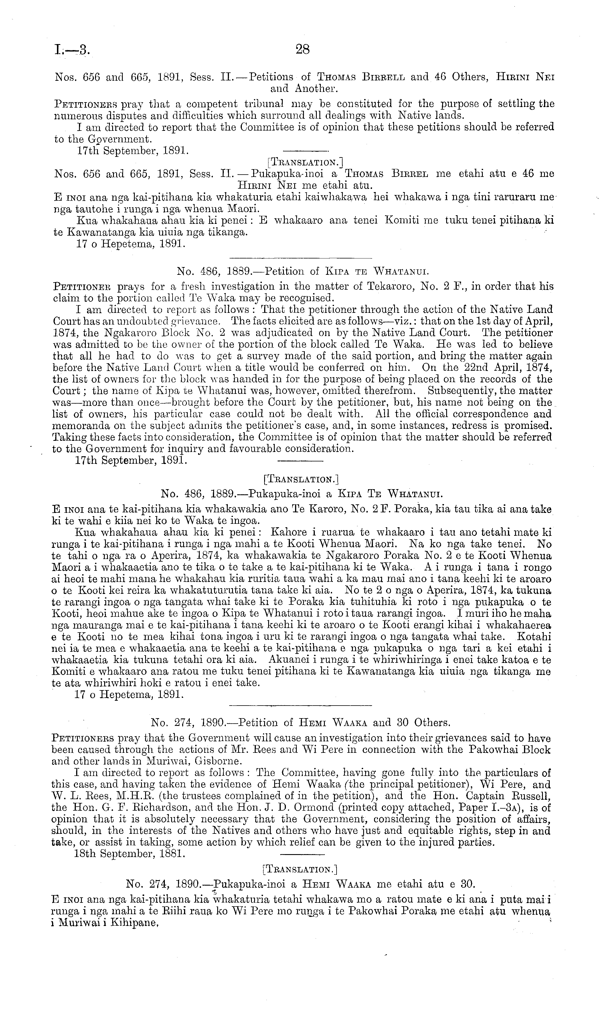 17th September, 1891. [Translation.] Nos. 656 and 665, 1891, Sess. II. —Pukapuka-inoi a Thomas Birrel me etahi atu c 46 me Hirini Nei me etahi atu. B inoi ana nga kai-pitihana kia whakaturia etahi kaiwhakawa liei whakawa i nga tini raruraru me nga tautohe i runga i nga whenua Maori. Kua whakahaua ahau kia ki penei: E whakaaro ana tenei Komiti me tuku tenei pitihana ki te Kawanatanga kia uiuia nga tikanga. 17 o Hepetema, 1891.