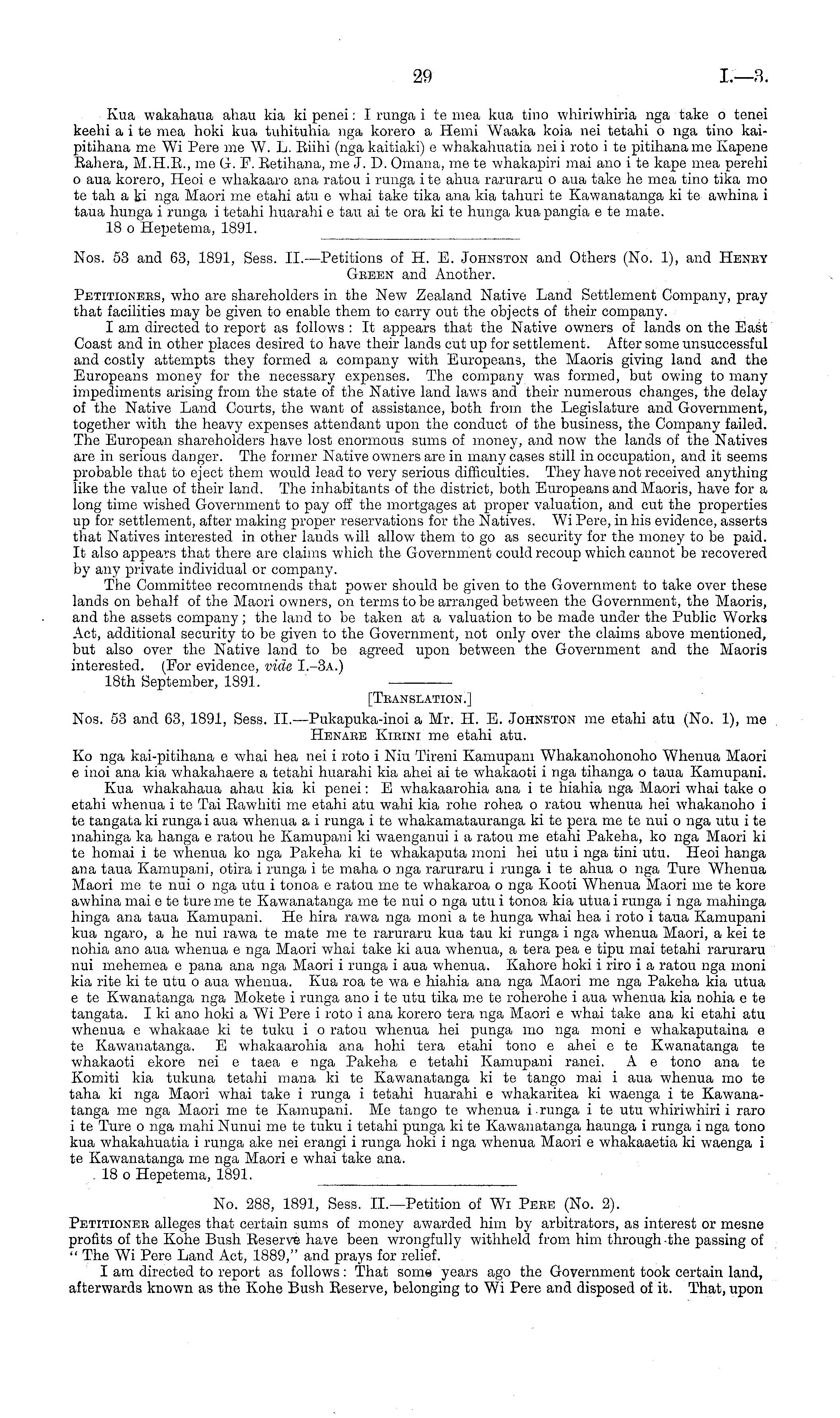 [Translation.] Nos. 53 and 63, 1891, Sess. ll.—Pukapuka-inoi a Mr. H. E. Johnston me etahi atu (No. 1), me Henabe Kibini me etahi atu. Ko nga kai-pitihana c whai hea nei i roto i Niu Tireni Kamupam Whakanohonoho Wheuua Maori c inoi ana kia whakahaere a tetahi huarahi kia ahei ai te whakaoti i nga tihanga o taua Kamupani. Kua whakahaua ahau kia ki penei: E whakaarohia ana ite hiahia nga Maori whai take o etahi whenua i to Tai Eawhiti me etahi atu wahi kia rohe rohea o ratou whenua hei whakanoho i te tangata ki runga i aua whenua a i runga i te whakamatauranga kite pera me te nui o nga utu i te mahinga ka hanga c ratou he Kamupani ki waenganui i a ratou me etahi Pakeha, ko nga Maori ki te homai ite whenua ko nga Pakeha kite whakaputa moni hei utu i nga tini utu. Heoi hanga ana taua Kamupani, otira i runga i te maha o nga raruraru i runga i te ahua o nga Ture Whenua Maori me te nui o nga utu i tonoa c ratou me te whakaroa o nga Kooti Whenua Maori me te kore awhina mai c te ture me te Kawanatanga me te nui o nga utu i tonoa kia utua i runga i nga mahinga hinga ana taua Kamupani. He hira rawa nga moni ate hunga whai hea i roto i taua Kamupani kua ngaro, a he nui rawa te mate me te raruraru kua tau ki runga i nga whenua Maori, a kei ta nohia ano aua whenua c nga Maori whai take ki aua whenua, a tera pea c tipu mai tetahi raruraru nui mehemea c pana ana nga Maori i runga i aua whenua. Kahore hoki i riro i a ratou nga moni kia rite kite utu o aua whenua. Kua roa te wa c hiahia ana nga Maori me nga Pakeha kia utua c te Kwanatanga nga Mokete i runga ano i te utu tika me te roherohe i aua whenua kia nohia c te tangata. Iki ano hoki aWi Pere i roto i ana korero tera nga Maori c whai take ana ki etahi atu whenua c whakaae kite tuku i o ratou whenua hei punga mo nga moni c whakaputaina c te Kawanatanga. E whakaarohia ana hohi tera etahi tono c ahei c te Kwanatanga te whakaoti ekore nei c taea c nga Pakeha c tetahi Kamupani ranei. A c tono ana te Komiti kia tukuna tetahi mana kite Kawanatanga kite tango mai i aua whenua mo te taha ki nga Maori w yhai take i runga i tetahi huarahi c whakaritea ki waenga i te Kawanatanga me nga Maori me te Kamupani. Me tango te whenua i runga i te utu whiriwhiri i raro i te Ture o nga mahi Nunui me te tuku i tetahi punga kite Kawanatanga haunga i runga i nga tono kua whakahuatia i runga ake nei erangi i runga hoki i nga whenua Maori c whakaaetia ki waenga i te Kawanatanga me nga Maori c whai take ana. . 18 o Hepetema, 1891.