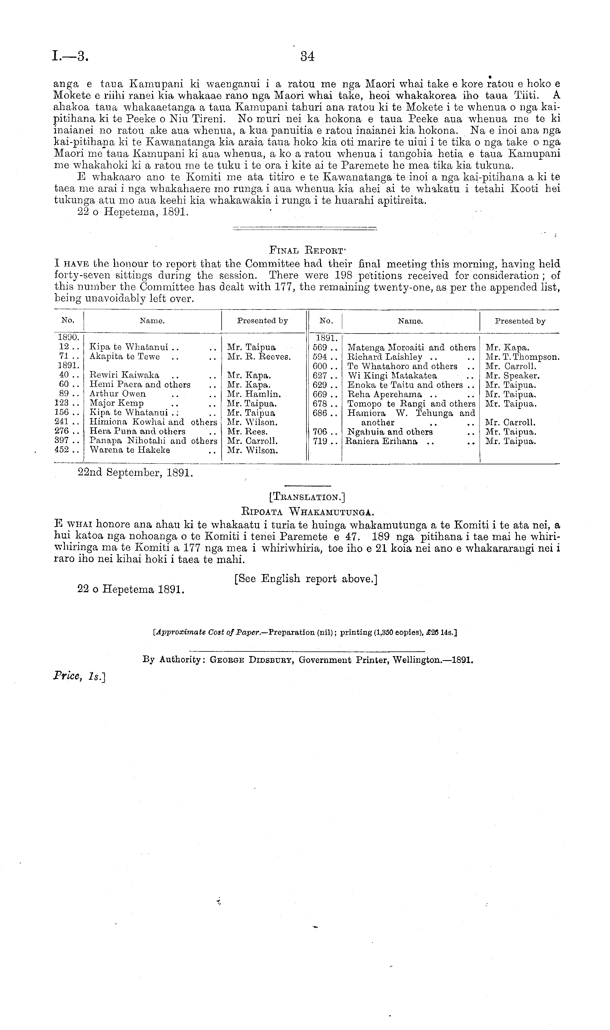 [Translation.] Bipoata Whakamutunga. E whai honore ana ahau kite whakaatu i turia te huinga whakamutunga a te Komiti i te ata nei, a hui katoa nga nohoanga ote Komiti i tenei Paremete c 47. 189 nga pitihana i tae mai he whiriwhiringa ma te Komiti a 177 nga mea i whiriwhiria, toe iho c 21 koia nei ano c whakararangi nei i raro iho nei kihai hoki i taea te mahi. [See English report above.] 22 o Hepetema 1891. [Approximate Cost of Paper.— Preparation (nil); printing (1,350 copies), £26 Ids.]