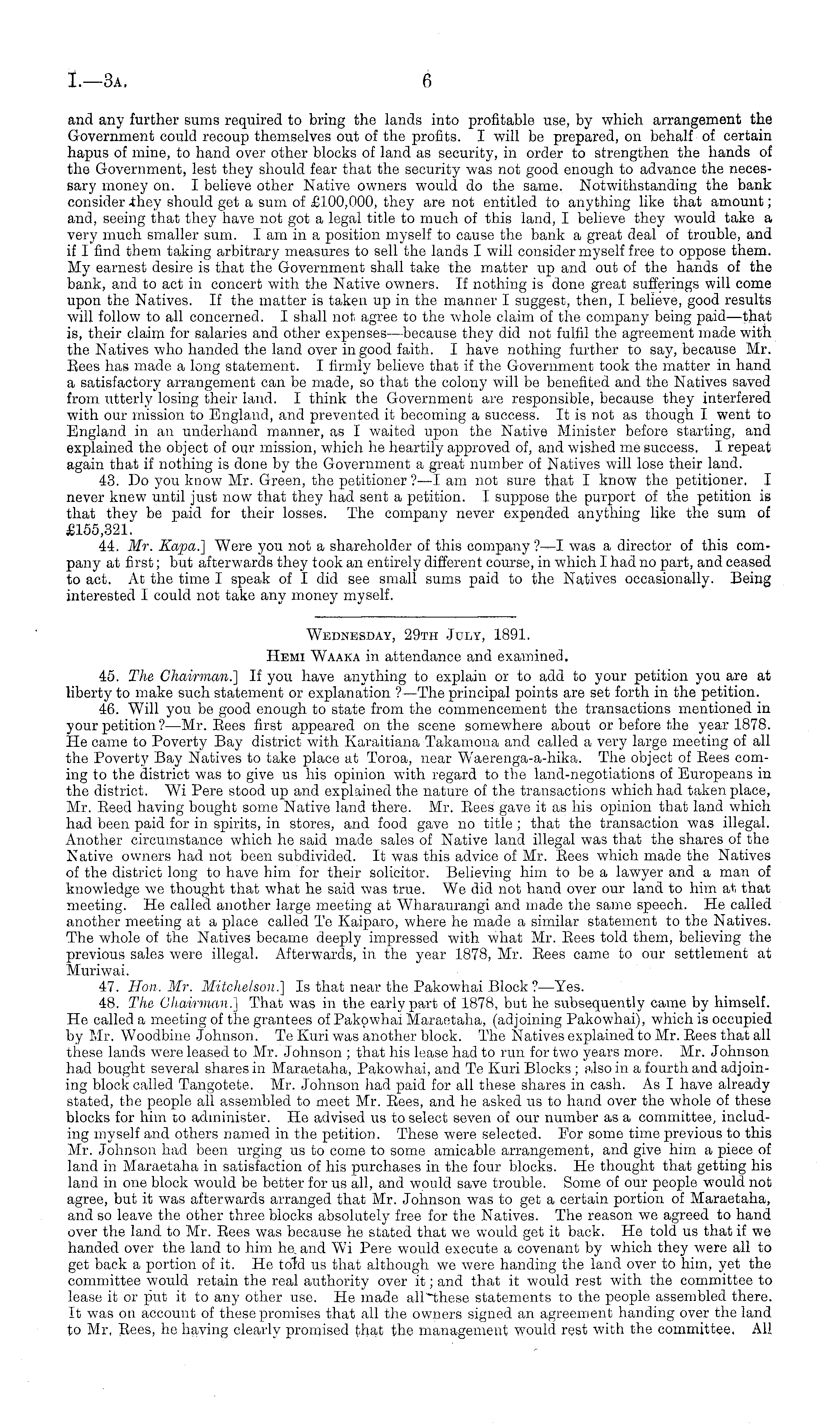 and any further sums required to bring the lands into profitable use, by which arrangement the Government could recoup themselves out of the profits. I will be prepared, on behalf of certain hapus of mine, to hand over other blocks of land as security, in order to strengthen the hands of the Government, lest they should fear that the security was not good enough to advance the necessary money on. I believe other Native owners would do the same. Notwithstanding the bank consider .they should get a sum of £100,000, they are not entitled to anything like that amount; and, seeing that they have not got a legal title to much of this land, I believe they would take a very much snaaller sum. lamin a position myself to cause the bank a great deal of trouble, and if I find them taking arbitrary measures to sell the lands I will consider myself free to oppose them. My earnest desire is that the Government shall take the matter up and out of the hands of the bank, and to act in concert with the Native owners. If nothing is done great sufferings will come upon the Natives. If the matter is taken up in the manner I suggest, then, I believe, good results will follow to all concerned. I shall not agree to the whole claim of the company being paid—that is, their claim for salaries and other expenses—because they did not fulfil the agreement made with the Natives who handed the land over in good faith. I have nothing further to say, because Mr. Eees has made a long statement. I firmly believe that if the Government took the matter in hand a satisfactory arrangement can be made, so that the colony will be benefited and the Natives saved from utterly losing their land. I think the Government are responsible, because they interfered with our mission to England, and prevented it becoming a success. It is not as though I went to England in an underhand manner, as I waited upon the Native Minister before starting, and explained the object of our mission, which he heartily approved of, and wished me success. I repeat again that if nothing is done by the Government a great number of Natives will lose their land. 43. Do you know Mr. Green, the petitioner ? —I am not sure that I know the petitioner, I never knew until just now that they had sent a petition. I suppose the purport of the petition is that they be paid for their losses. The company never expended anything like the sum of £155,321. 44. Mr. Kapa.] Were you not a shareholder of this company ?—I was a director of this company at first; but afterwards they took an entirely different course, in which I had no part, and ceased to act. At the time I speak of I did see small sums paid to the Natives occasionally. Being interested I could not take any money myself.