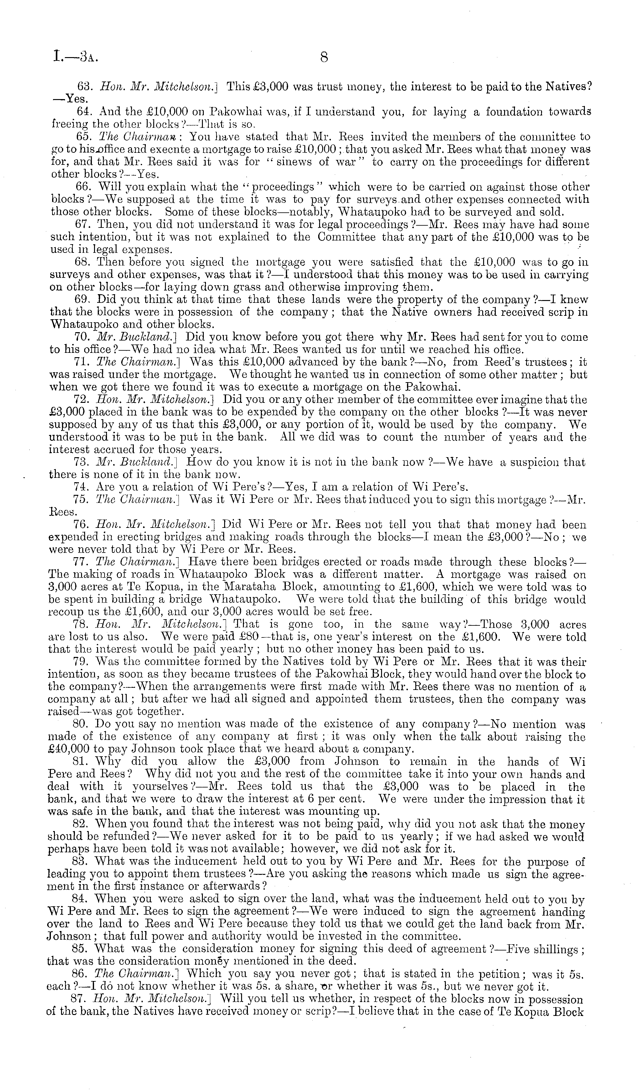 63. Hon. Mr. Mitchclson.] This £3,000 was trust money, the interest to be paid to the Natives? —Yes. 64. And the £10,000 on Pakcwhai was, if I understand you, for laying a foundation towards freeing the other blocks?— That is so. 65. The Chairman : You have stated that Mr. Rees invited the members of the committee to go to hisjDffice and execute a mortgage to raise £10,000 ; that you asked Mr. Eees what that money was for, and that Mr. Eees said it was for " sinews of war" to carry on the proceedings for different other blocks?— Yes. 66. Will you explain what the "proceedings" which were to be carried on against those other blocks?—We supposed at the time it was to pay for surveys and other expenses connected with those other blocks. Some of these blocks —notably, Whataupoko had to be surveyed and sold. 67. Then, you did not understand it was for legal proceedings ?—Mr. Eees may have had some such intention, but it was not explained to the Committee that any part of the £10,000 was to be used in legal expenses. 68. Then before you signed the mortgage you were satisfied that the £10,000 was to go in surveys and other expenses, was that it ?—I understood that this money was to be used in carrying on other blocks—for laying down grass and otherwise improving them. 69. Did you think at that time that these lands were the property of the company ?—I knew that the blocks were in possession of the company ; that the Native owners had received scrip in Whataupoko and other blocks. 70. Mr. BucMand.] Did you know before you got there why Mr. Eees had sent for you to come to his office ?—We had no idea what Mr. Eees wanted us for until we reached his office. 71. The Chairman.] Was this £10,000 advanced by the bank?—No, from Eeed's trustees; it was raised under the mortgage. We thought he w xanted us in connection of some other matter ; but when we got there we found it was to execute a mortgage on the Pakowhai. 72. Hon. Mr. MitcJtelson.] Did you or any other member of the committee ever imagine that the £3,000 placed in the bank was to be expended by the company on the other blocks ?—lt was never supposed by any of us that this £3,000, or any portion of it, would be used by the company. We understood it was to be put in the bank. All we did was to count the number of years and the interest accrued for those years. 73. Mr. Buchland.} How 7 do you know it is not in the bank now ?—We have a suspicion that there is none of it in the bank now. 74. Are you a relation of Wi Pere's?—Yes, I am a relation of Wi Pere's. 75. The Chairman.] Was it Wi Pere or Mr. Eees that induced you to sign this mortgage '.' —Mr. Eees. 76. Hon. Mr. MitcJielson ,.] Did Wi Pere or Mr. Eees not tell you that that money had been expended in erecting bridges and making roads through the blocks —1 mean the £3,000 ?—No ;we were never told that by Wi Pere or Mr. Eees. 77. The Chairman.] Have there been bridges erected or roads made through these blocks?— The making of roads in Whataupoko Block was a different matter. A mortgage was raised on 3,000 acres at Te Kopua, in the Marataha Block, amounting to £1,600, which we were told was to be spent in building a bridge Whataupoko. We were told that the building of this bridge would recoup us the £1,600, and our 3,000 acres would be set free. 78. Hon. Mr. Mitchclson.'] That is gone too, in the same way? —Those 3,000 acres are lost to us also. We were paid £80 —that is, one year's interest on the £1,600. We were told that the interest would be paid yearly ; but no other money has been paid to us. 79. Was the committee formed by the Natives told by Wi Pere or Mr. Eees that it was their intention, as soon as they became trustees of the Pakowhai Block, they would hand over the block to the company?— When the arrangements were first made with Mr. Eees there was no mention of a company at all; but after we had all signed and appointed them trustees, then the company was raised —was got together. 80. Do you say no mention was made of the existence of any company ? —No mention was made of the existence of any company at first ; it was only when the talk about raising the £40,000 to pay Johnson took place that we heard about a company. 81. Why did you allow the £3,000 from Johnson to remain in the hands of Wi Pere and Eees ? Why did not you and the rest of the committee take it into your own hands and deal with it yourselves ?—Mr. Eees told us that the £3,000 was to be placed in the bank, and that we were to draw the interest at 6 per cent. We were under the impression that it was safe in the bank, and that the interest was mounting up. 82. When you found that the interest was not being paid, why did you not ask that the money should be refunded?—We never asked for it to be paid to us yearly; if we had asked we would perhaps have been told it was not available; however, we did not ask for it. 83. What was the inducement held out to you by Wi Pere and Mr. Eees for the purpose of leading you to appoint them trustees ?—Are you asking the reasons which made us sign the agreement in the first instance or afterwards ? 84. When you were asked to sign over the land, what was the inducement held out to you by Wi Pere and Mr. Eees to sign the agreement ?—We were induced to sign the agreement handing over the land to Eees and Wi Pere because they told us that we could get the land back from Mr. Johnson; that full power and authority would be invested in the committee. 85. What was the consideration money for signing this deed of agreement ? —Five shillings ; that was the consideration money mentioned in the deed. 86. The Chairman.] Which you say you never got; that is stated in the petition; was it ss. each ?—I do not know whether it was ss. a share, ni whether it was 55., but we never got it. 87. Hon. Mr. Mitchdson.] Will you tell us whether, in respect of the blocks now in possession of the bank, the Natives have received money or scri
