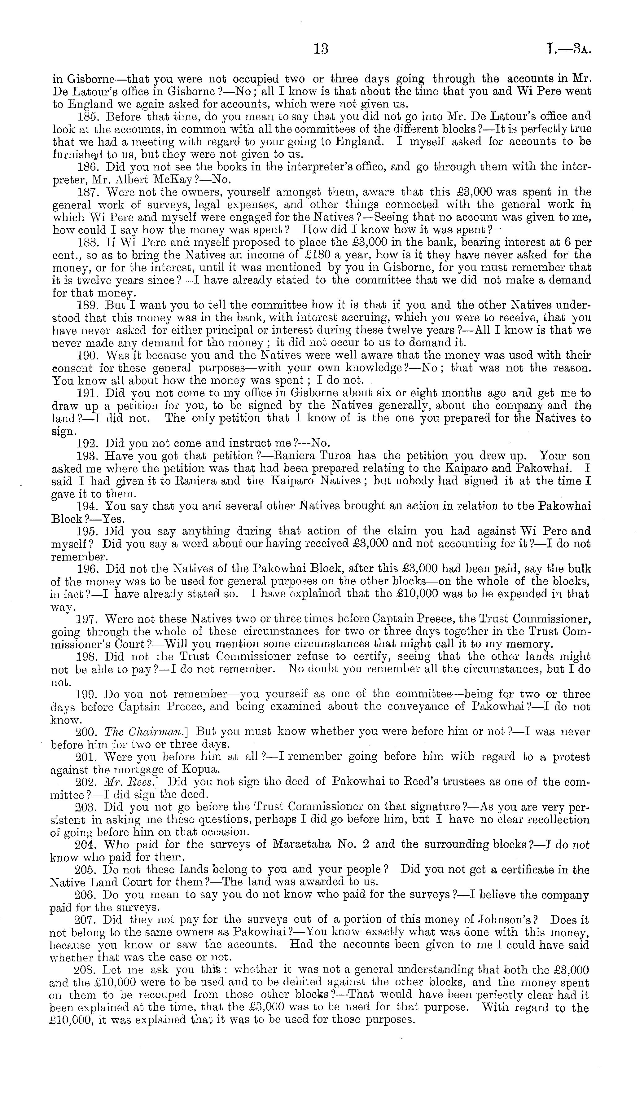 in Gisborne —that you were not occupied two or three days going through the accounts in Mr. De Latour's office in Gisborne ? —No; all I know is that about the time that you and Wi Pere went to England we again asked for accounts, which were not given us. 185. Before that time, do you mean to say that you did not go into Mr. De Latour's office and look at the accounts, in common with all the committees of the different blocks ?—lt is perfectly true that we had a meeting with regard to your going to England. I myself asked for accounts to be furnished to us, but they were not given to us. 186. Did you not see the books in the interpreter's office, and go through them with the interpreter, Mr. Albert McKay?—No. 187. Were not the owners, yourself amongst them, aware that this £3,000 was spent in the general work of surveys, legal expenses, and other things connected with the general work in which Wi Pere and myself were engaged for the Natives ? —Seeing that no account was given to me, how could I say how the money was spent ? How did I know how it was spent ? 188. If Wi Pere and myself proposed to place the £3,000 in the bank, bearing interest at 6 per cent., so as to bring the Natives an income of £180 a year, how is it they have never asked for the money, or for the interest, until it was mentioned by you in Gisborne, for you must remember that it is twelve years since ?—I have already stated to the committee that we did not make a demand for that money. 189. But I want you to tell the committee how it is that if you and the other Natives understood that this money was in the bank, with interest accruing, which you were to receive, that you have never asked for either principal or interest during these twelve years ?—All I know is that we never made any demand for the money ; it did not occur to us to demand it. 190. Was it because you and the Natives were well aware that the money was used with their consent for these general purposes—with your own knowledge ? —No; that was not the reason. You know all about how the money was spent; Ido not. 191. Did you not come to my office in Gisborne about six or eight months ago and get me to draw up a petition for you, to be signed by the Natives generally, about the company and the land ? —I did not. The only petition that I know of is the one you prepared for the Natives to sign. 192. Did you not come and instruct me?— No. 193. Have you got that petition ?—Baniera Turoa has the petition you drew up. Your son asked me where the petition was that had been prepared relating to the Kaiparo and Pakowhai. I said I had given it to Eaniera and the Kaiparo Natives ; but nobody had signed it at the time I gave it to them. 194. You say that you and several other Natives brought an action in relation to the Pakowhai Block?— Yes. 195. Did you say anything during that action of the claim you had against Wi Pere and myself ? Did you say a word about our having received £3,000 and not accounting for it ? —I do not remember. 196. Did not the Natives of the Pakowhai Block, after this £3,000 had been paid, say the bulk of the money was to be used for general purposes on the other blocks—on the whole of the blocks, in fact ? —I have already stated so. I have explained that the £10,000 was to be expended in that way. 197. Were not these Natives two or three times before Captain Preece, the Trust Commissioner, going through the whole of these circumstances for two or three days together in the Trust Commissioner's Court? —W Till you mention some circumstances that might call it to my memory. 198. Did not the Trust Commissioner refuse to certify, seeing that the other lands might not be able to pay?—l do not remember. No doubt you remember all the circumstances, but Ido not. 199. Do you not remember—you yourself as one of the committee—being for two or three days before Captain Preece, and being examined about the conveyance of Pakowhai?—l do not know. 200. The Chairman.] But you must know whether you were before him or not ?—I was never before him for two or three days. 201. Were you before him at all? —I remember going before him with regard to a protest against the mortgage of Kopua. 202. Mr. Bees.) Did you not sign the deed of Pakowhai to Eeed's trustees as one of the committee? —I did sign the deed. 203. Did you not go before the Trust Commissioner on that signature?—As you are very persistent in asking me these questions, perhaps I did go before him, but I have no clear recollection of going before him on that occasion. 204. Who paid for the surveys of Maraetaha No. 2 and the surrounding blocks ? —I do not know who paid for them. 205. Do not these lands belong to you and your people ? Did you not get a certificate in the Native Land Court for them?— The land was awarded to us. 206. Do you mean to say you do not know who paid for the surveys ? —I believe the company paid for the surveys. 207. Did they not pay for the surveys out of a portion of this money of Johnson's? Does it not belong to the same owners as Pakowhai? —You know exactly what was done with this money, because you know or saw the accounts. Had the accounts been given to me I could have said whether that was the case or not. 208. Let me ask you this : whether it was not a general understanding that both the £3,000 and the £10,000 were to be used and to be debited against the other blocks, and the money spent on them to be recouped from those other blocks ?—That would have been perfectly clear had it been explained at the time, that the £3,000 was to be used for that purpose. With regard to the £10,000, it was explained that it was to be used for those purposes.