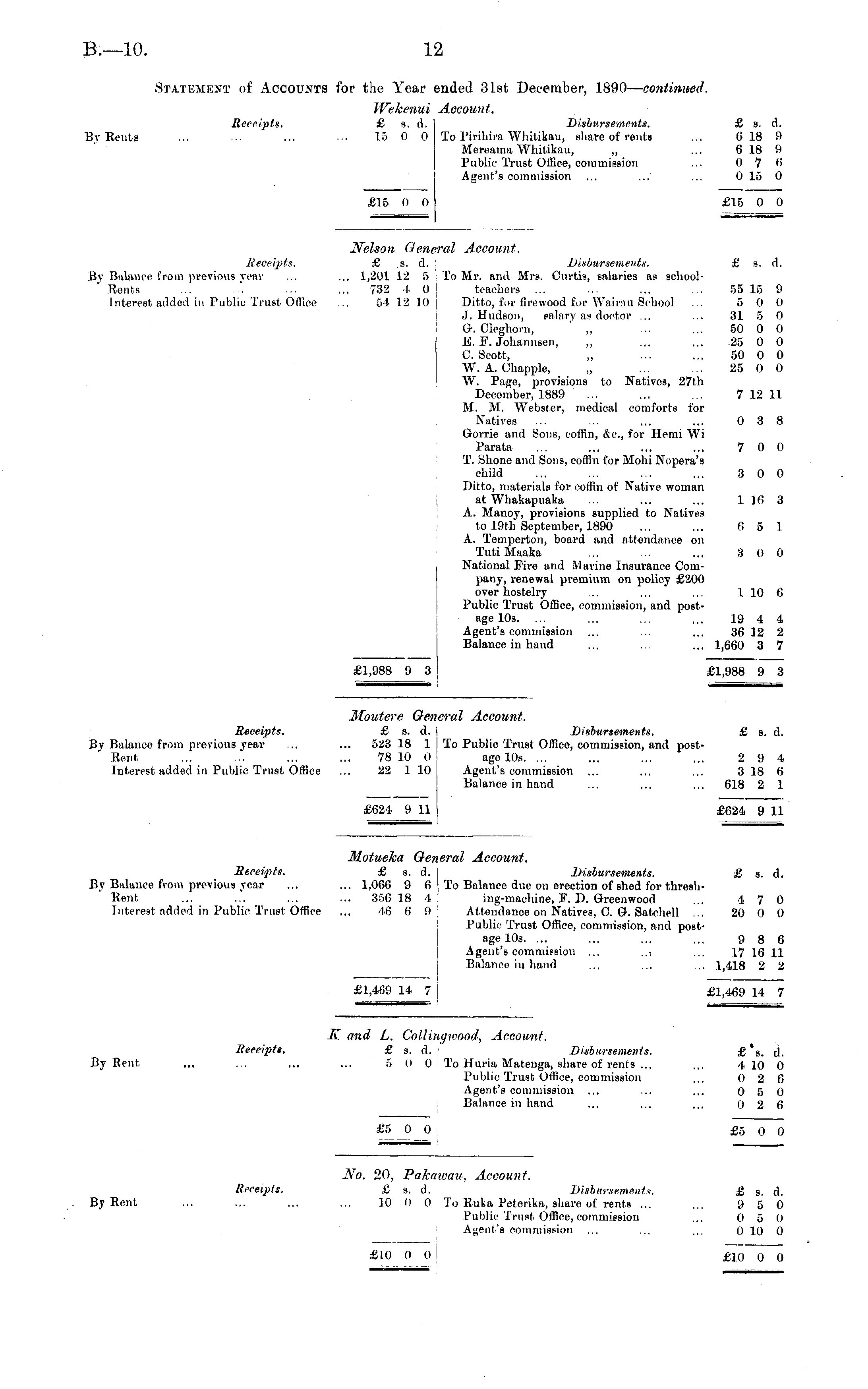 No. 20, Pakawau, Account. Recetpts. £ s. d. Disbursements. £ 8 . d. By Rent ... ... ... ... 10 0 0 To Ruka Peterika, share of rents ... ... 9 5 0 Public Trust Office, commission ... 0 5 0 Agent's commission ... ... ... 0 10 0 £10 0 0 ; £ 10 0 0