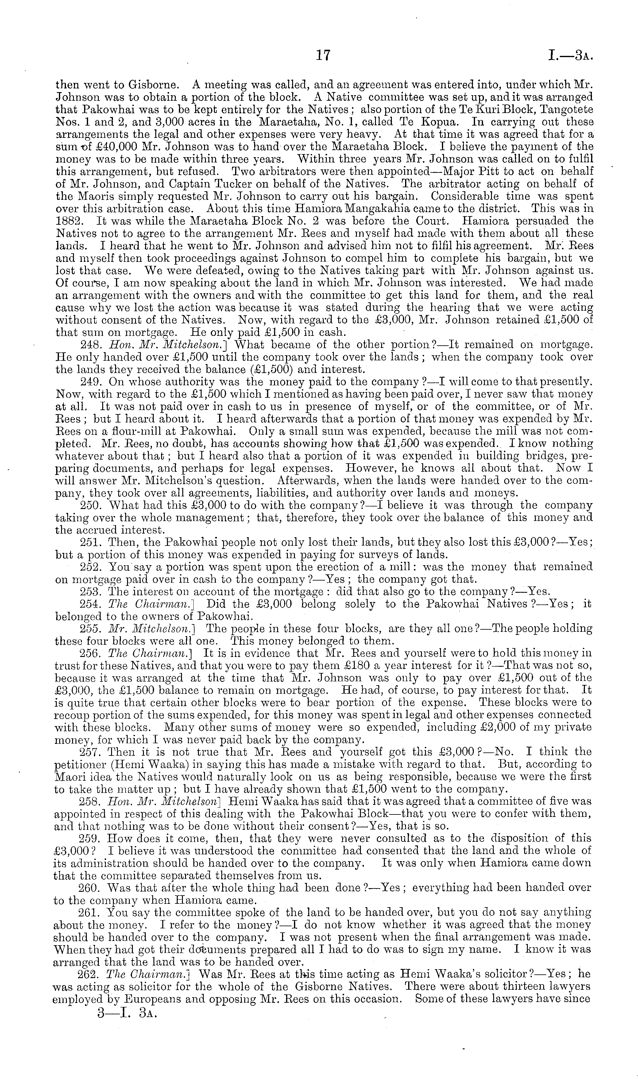 then went to Gisborne. A meeting was called, and an agreement was entered into, under which Mr. Johnson was to obtain a portion of the block. A Native committee was set up, and it was arranged that Pakowhai was to be kept entirely for the Natives ; also portion of the TeKuri Block, Tangotete Nos. 1 and 2, and 3,000 acres in the Maraetaha, No. 1, called Te Kopua. In carrying out these arrangements the legal and other expenses were very heavy. At that time it was agreed that for a sum -of £40,000 Mr. Johnson was to hand over the Maraetaha Block. I believe the payment of the money was to be made within three years. Within three years Mr. Johnson was called on to fulfil this arrangement, but refused. Two arbitrators were then appointed —Major Pitt to act on behalf of Mr. Johnson, and Captain Tucker on behalf of the Natives. The arbitrator acting on behalf of the Maoris simply requested Mr. Johnson to carry out his bargain. Considerable time was spent over this arbitration case. About this time Hamiora Mangakahia came to the district. This was in 1882. It was while the Maraetaha Block No. 2 was before the Court. Hamiora persuaded the Natives not to agree to the arrangement Mr. Eees and myself had made with them about all these lands. I heard that he went to Mr. Johnson and advised him not to filfil his agreement. Mr. Eees and myself then took proceedings against Johnson to compel him to complete his bargain, but we lost that case. We were defeated, owing to the Natives taking part with Mr. Johnson against us. Of course, lam now speaking about the land in which Mr. Johnson was interested. We had made an arrangement with the owners and with the committee to get this land for them, and the real cause why we lost the action was because it was stated during the hearing that we were acting without consent of the Natives. Now, with regard to the £3,000, Mr. Johnson retained £1,500 of that sum on mortgage. He only paid £1,500 in cash. 248. Hon. Mr. Mitohelson.'j What became of the other portion?—lt remained on mortgage. He only handed over £1,500 until the company took over the lands ; when the company took over the lands they received the balance (£1,500) and interest. 249. On whose authority was the money paid to the company ?—I will come to that presently. Now, with regard to the £1,500 which I mentioned as having been paid over, I never saw that money at all. It was not paid over in cash to us in presence of myself, or of the committee, or of Mr. Eees ; but I heard about it. I heard afterwards that a portion of that money was expended by Mr. Eees on a flour-mill at Pakowhai. Only a small sum was expended, because the mill was not completed. Mr. Eees, no doubt, has accounts showing how that £1,500 was expended. I know nothing whatever about that; but I heard also that a portion of it was expended in building bridges, preparing documents, and perhaps for legal expenses. However, he knows all about that. Now I will answer Mr. Mitchelson's question. Afterwards, when the lands were handed over to the company, they took over all agreements, liabilities, and authority over lands and moneys. 250. What had this £3,000 to do with the company ?—I believe it was through the company taking over the whole management; that, therefore, they took over the balance of this money and the accrued interest. 251. Then, the Pakowhai people not only lost their lands, but they also lost this £3,000 ?—Yes; but a portion of this money was expended in paying for surveys of lands. 252. You say a portion was spent upon the erection of a mill: was the money that remained on mortgage paid over in cash to the company ?—Yes ; the company got that. 253. The interest on account of the mortgage : did that also go to the company?— Yes. 254. The Chairman.] Did the £3,000 belong solely to the Pakowhai Natives ? —Yes; it belonged to the owners of Pakowhai. 255. Mr. Mitchelson.] The people in these four blocks, are they all one ? —The people holding these four blocks were all one. This money belonged to them. 256. The Chairman.} It is in evidence that Mr. Eees and yourself were to hold this money in trust for these Natives, and that you were to pay them £180 a year interest for it ?—That was not so, because it was arranged at the time that Mr. Johnson was only to pay over £1,500 out of the £3,000, the £1,500 balance to remain on mortgage. He had, of course, to pay interest for that. It is quite true that certain other blocks were to bear portion of the expense. These blocks were to recoup portion of the sums expended, for this money was spent in legal and other expenses connected with these blocks. Many other sums of money were so expended, including £2,000 of my private money, for which I was never paid back by the company. 257. Then it is not true that Mr. Eees and yourself got this £3,000 ?—No. I think the petitioner (Hemi Waaka) in saying this has made a mistake with regard to that. But, according to Maori idea the Natives would naturally look on us as being responsible, because we were the first to take the matter up ; but I have already shown that £1,500 went to the company. 258. Hon. Mr. Mitchelson] Hemi Waaka has said that it was agreed that a committee of five was appointed in respect of this dealing with the Pakowhai Block—that you were to confer with them, and that nothing was to be done without their consent ? —Yes, that is so. 259. How does it come, then, that they were never consulted as to the disposition of this £3,000 ? I believe it was understood the committee had consented that the land and the whole of its administration should be handed over to the company. It was only when Hamiora came down that the committee separated themselves from us. 260. Was that after the whole thing had been done ?—Yes ; everything had been handed over to the company when Hamiora came. 261. You say the committee spoke of the land to be handed over, but you do not say anything about the money. I r