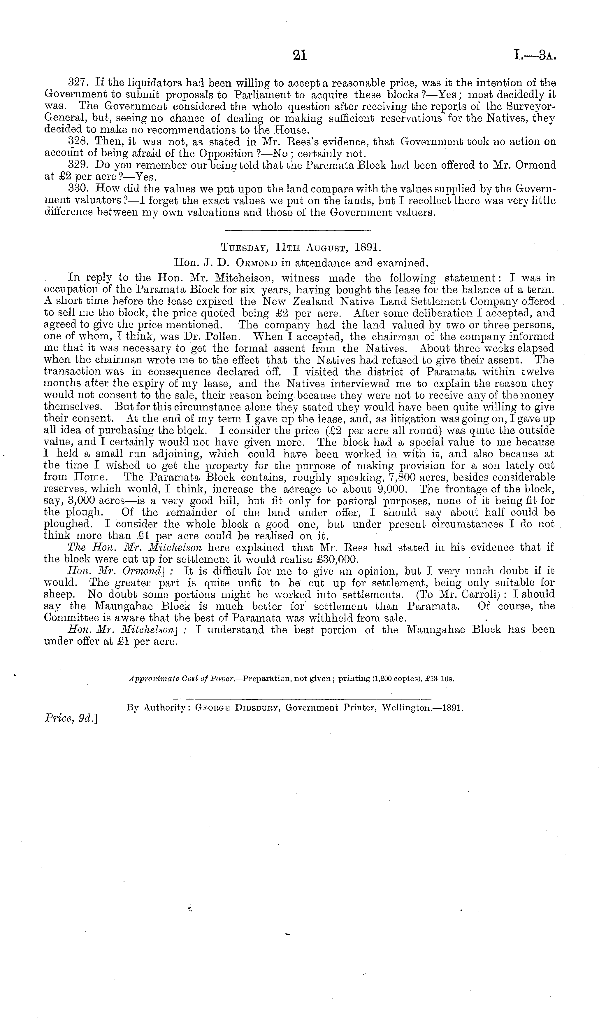 Tuesday, 11th August, 1891. Hon. J. D. Oemond in attendance and examined. In reply to the Hon. Mr. Mitchelson, -witness made the following statement: I was in occupation of the Paramata Block for six years, having bought the lease for the balance of a term. A short time before the lease expired the New Zealand Native Land Settlement Company offered to sell me the block, the price quoted being £2 per acre. After some deliberation I accepted, and agreed to give the price mentioned. The company had the land valued by two or three persons, one of whom, I think, was .Dr. Pollen. When I accepted, the chairman of the company informed me that it was necessary to get the formal assent from the Natives. About three weeks elapsed when the chairman wrote me to the effect that the Natives had refused to give their assent. The transaction was in consequence declared off. I visited the district of Paramata within twelve months after the expiry of my lease, and the Natives interviewed me to explain the reason they would not consent to the sale, their reason being, because they were not to receive any of the money themselves. But for this circumstance alone they stated they would have been quite willing to give their consent. At the end of my term I gave up the lease, and, as litigation was going on, I gave up all idea of purchasing the block. I consider the price (£2 per acre all round) was quite the outside value, and I certainly would not have given more. The block had a special value to me because I held a small run adjoining, which could have been worked in with it, and also because at the time I wished to get the property for the purpose of making provision for a son lately out from Home. The Paramata Block contains, roughly speaking, 7,800 acres, besides considerable reserves, which would, I think, increase the acreage to about 9,000. The frontage of the block, say, 3,000 acres—is a very good hill, but fit only for pastoral purposes, none of it being fit for the plough. Of the remainder of the land under offer, I should say about half could be ploughed. I consider the whole block a good one, but under present circumstances I do not think more than £1 per acre could be realised on it. The Hon. Mr. Mitchelson here explained that Mr. Eees had stated in his evidence that if the block were cut up for settlement it would realise £30,000. Hon. Mr. Ormoml] : It is difficult for me to give an opinion, but I very much doubt if it would. The greater part is quite unfit to be cut up for settlement, being only suitable for sheep. No doubt some portions might be worked into settlements. (To Mr. Carroll; : I should say the Maungahae Block is much better for' settlement than Paramata. Of course, the Committee is aware that the best of Paramata was withheld from sale. Hon. Mr. Mitchelson] : I understand the best portion of the Maungahae Block has been under offer at £1 per acre. Approximate Cost of Paper. —Preparation, not given ; printing (1,200 copies), £Ut 10s.