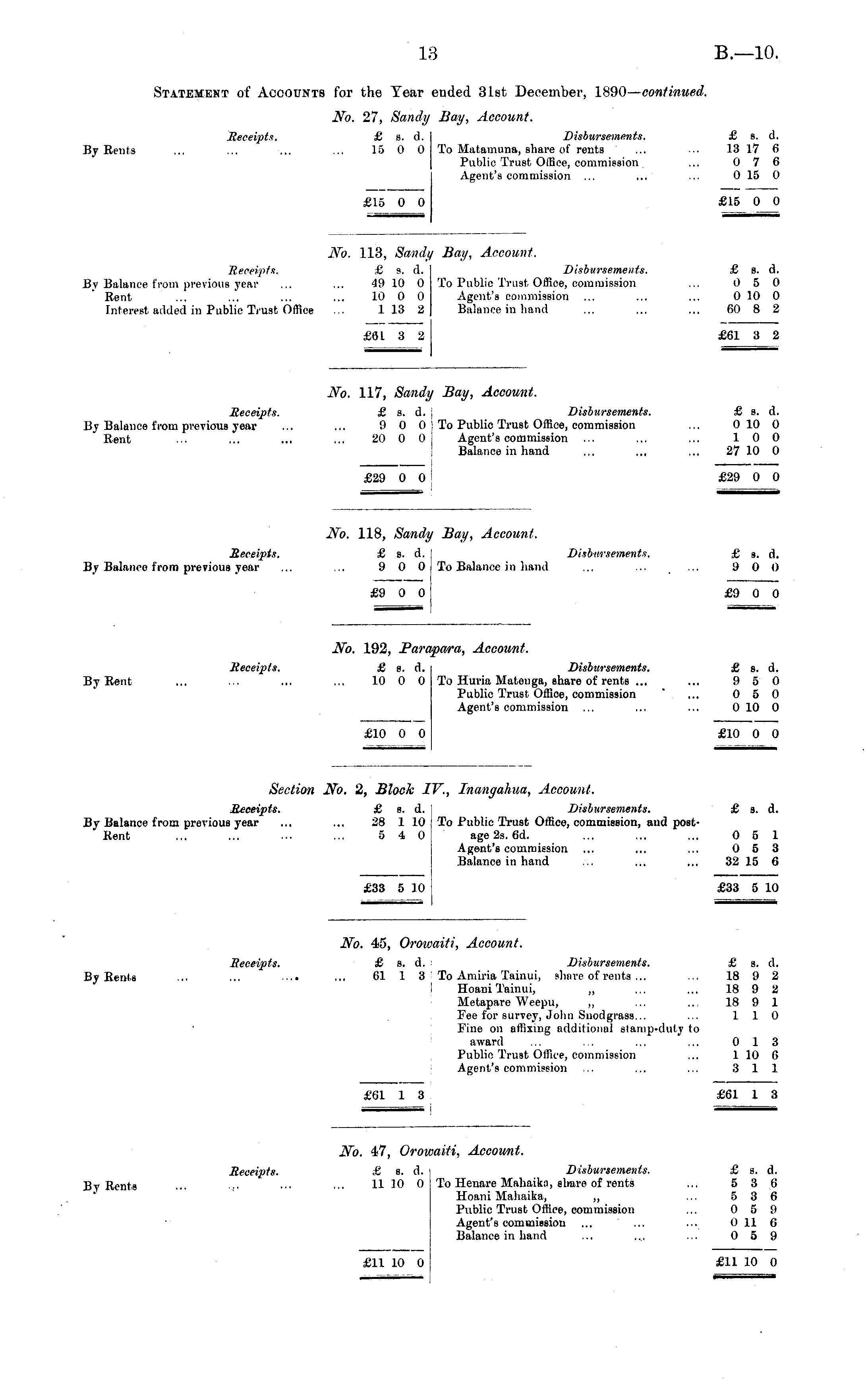 Statement of Accounts for the Year ended 31st December, 1890 — continued. No. 27, Sandy Bay, Account. Receipts. £ s. d. Disbursements. £ s. d. By Rents ... ... ... ... 15 0 0 To Matamuna, share of rents ... ... 13 17 6 Public Trust Office, commission ... 0 7 6 Agent's commission ... ... ... 0 15 0 £15 0 0 £15 0 0