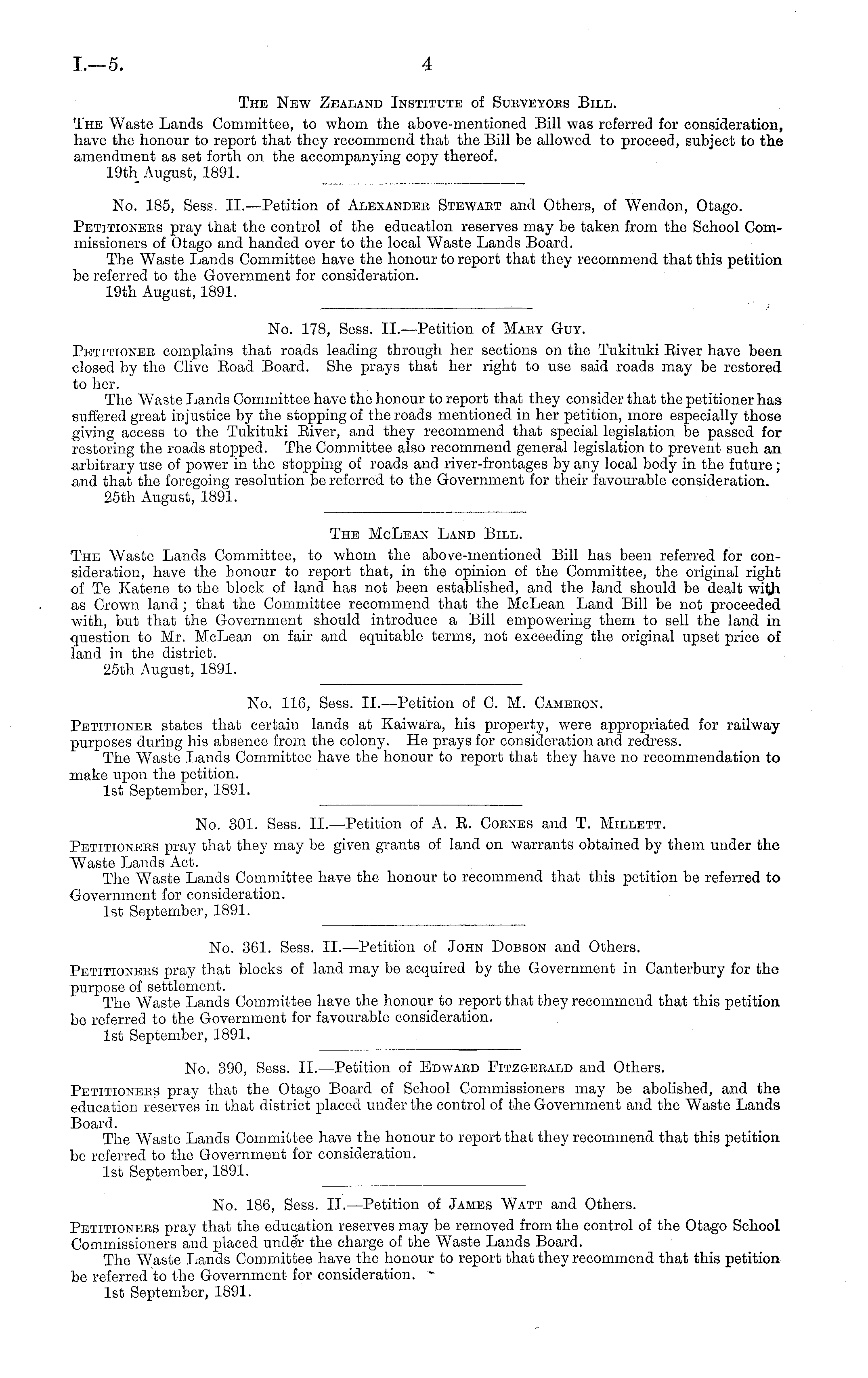 No. 116, Sess. ll.—Petition of C. M. Cameron. Petitioner states that certain lands at Kaiwara, his property, were appropriated for railway purposes during his absence from the colony. He prays for consideration and redress. The Waste Lands Committee have the honour to report that they have no recommendation to make upon the petition. Ist September, 1891.