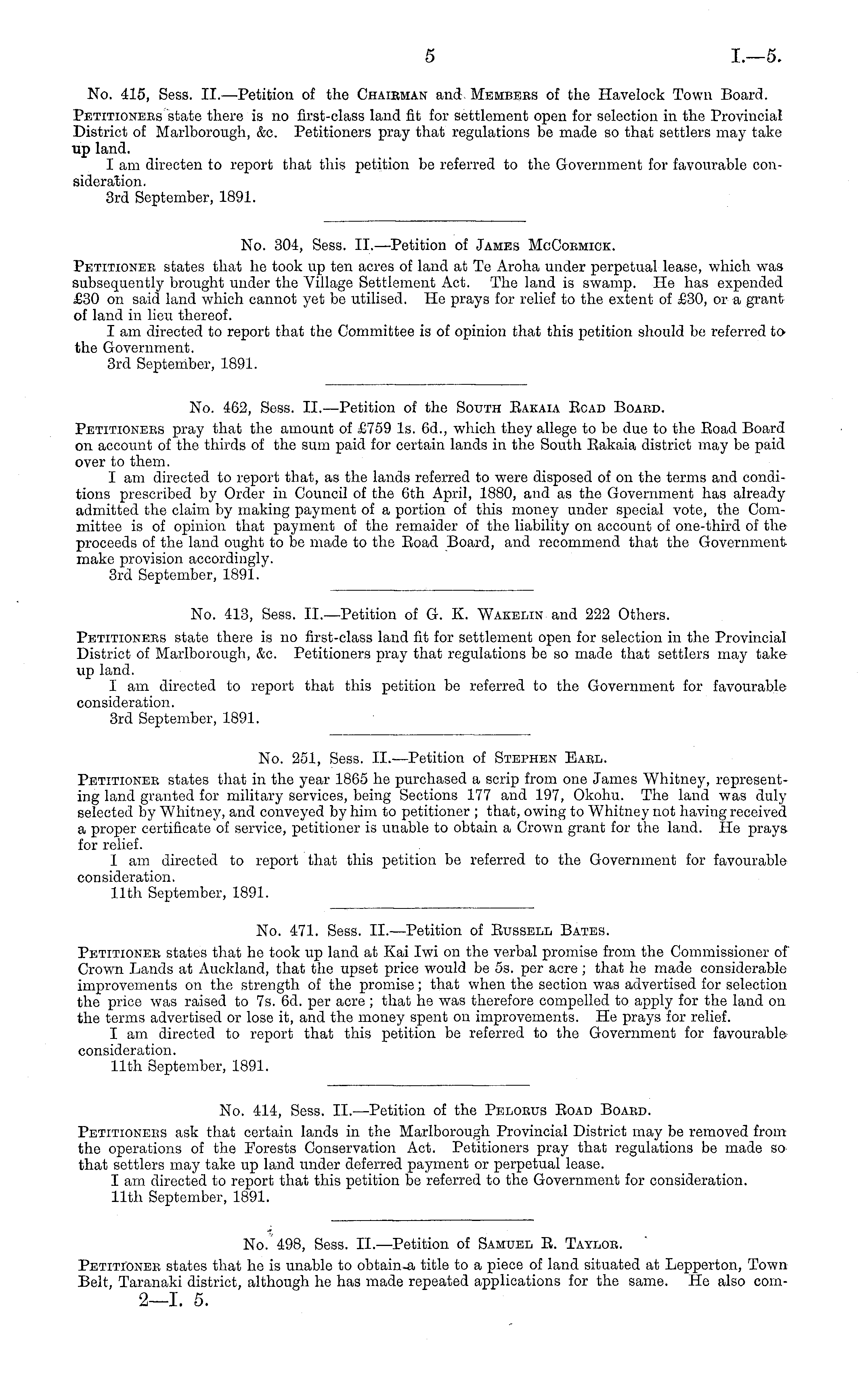 No. 413, Sess. ll.—Petition of G. K. Wakelin and 222 Others. Petitioners state there is no first-class land fit for settlement open for selection in the Provincial District of Marlborough, &c. Petitioners pray that regulations be so made that settlers may take up land. I am directed to report that this petition be referred to the Government for favourable consideration. 3rd September, 1891.