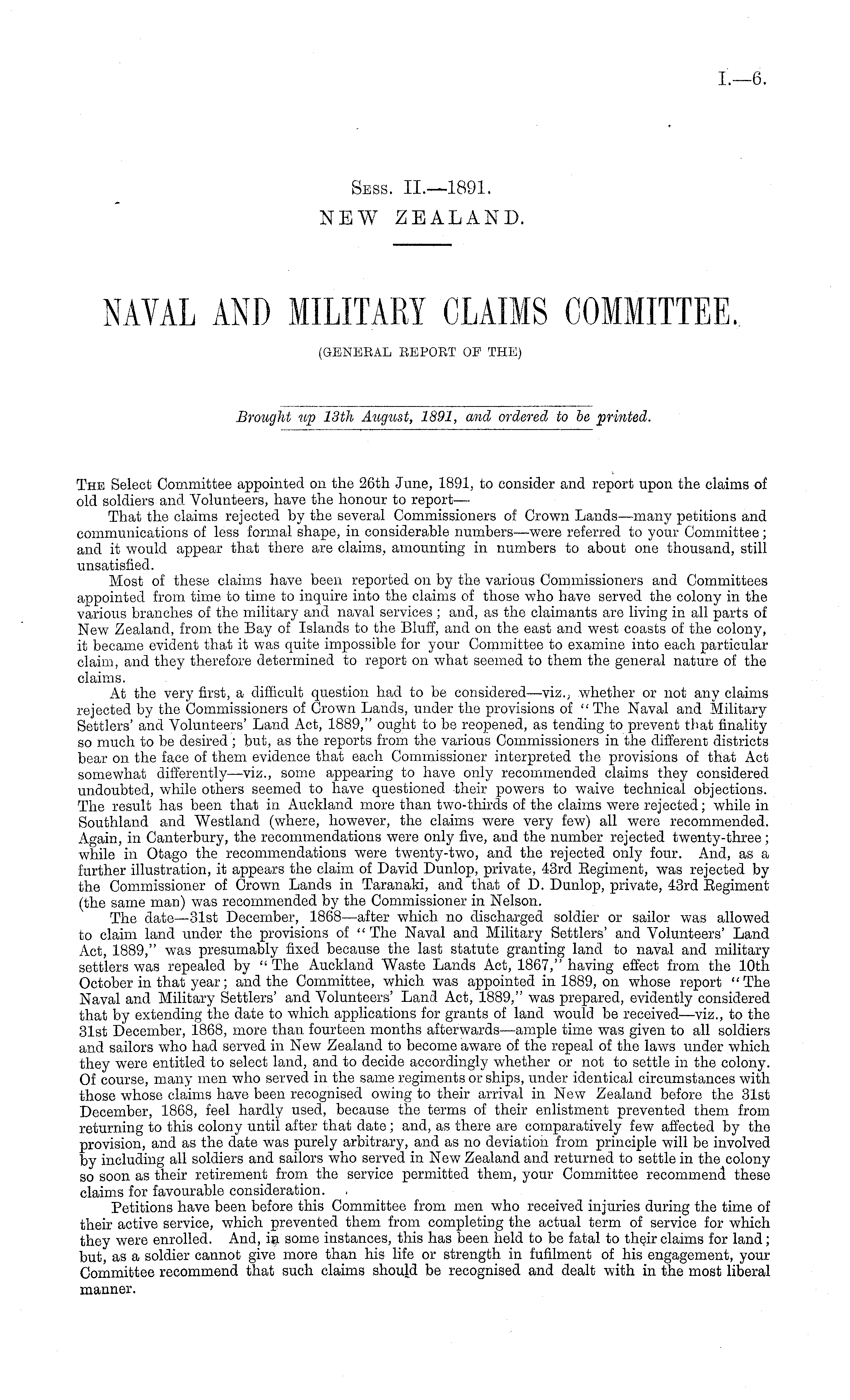The Select Committee appointed on the 26th June, 1891, to consider and report upon the claims of old soldiers and Volunteers, have the honour to report— That the claims rejected by the several Commissioners of Crown Lands—many petitions and communications of less formal shape, in considerable numbers—were referred to your Committee; and it would appear that there are claims, amounting in numbers to about one thousand, still unsatisfied. Most of these claims have been reported on by the various Commissioners and Committees appointed from time to time to inquire into the claims of those who have served the colony in the various branches of the military and naval services ; and, as the claimants are living in all parts of New Zealand, from the Bay of Islands to the Bluff, and on the east and west coasts of the colony, it became evident that it was quite impossible for your Committee to examine into each particular claim, and they therefore determined to report on what seemed to them the general nature of the claims. At the very first, a difficult question had to be considered—viz., whether or not any claims rejected by the Commissioners of Crown Lands, under the provisions of " The Naval and Military Settlers' and Volunteers' Land Act, 1889," ought to be reopened, as tending to prevent that finality so much to be desired ; but, as the reports from the various Commissioners in the different districts bear on the face of them evidence that each Commissioner interpreted the provisions of that Act somewhat differently—viz., some appearing to have only recommended claims they considered undoubted, while others seemed to have questioned their powers to waive technical objections. The result has been that in Auckland more than two-thirds of the claims were rejected; while in Southland and Westland (where, however, the claims were very few) all were recommended. Again, in Canterbury, the recommendations were only five, and the number rejected twenty-three ; while in Otago the recommendations were twenty-two, and the rejected only four. And, as a further illustration, it appears the claim of David Dunlop, private, 43rd Eegiment, was rejected by the Commissioner of Crown Lands in Taranaki, and that of D. Dunlop, private, 43rd Eegiment (the same man) was recommended by the Commissioner in Nelson. The date—3lst December, 1868—after which no discharged soldier or sailor was allowed to claim land under the provisions of "The Naval and Military Settlers' and Volunteers' Land Act, 1889," was presumably fixed because the last statute granting land to naval and military settlers was repealed by " The Auckland Waste Lands Act, 1867," having effect from the 10th October in that year; and the Committee, which was appointed in 1889, on whose report "The Naval and Military Settlers' and Volunteers' Land Act, 1889," was prepared, evidently considered that by extending the date to which applications for grants of land would be received—viz., to the 31st December, 1868, more than fourteen months afterwards—ample time was given to all soldiers and sailors who had served in New Zealand to become aware of the repeal of the laws under which they were entitled to select land, and to decide accordingly whether or not to settle in the colony. Of course, many men who served in the same regiments or ships, under identical circumstances with those whose claims have been recognised owing to their arrival in New Zealand before the 31st December, 1868, feel hardly used, because the terms of their enlistment prevented them from returning to this colony until after that date; and, as there are comparatively few affected by the provision, and as the date was purely arbitrary, and as no deviation from principle will be involved by including all soldiers and sailors who served in New Zealand and returned to settle in the colony so soon as their retirement from the service permitted them, your Committee recommend these claims for favourable consideration. Petitions have been before this Committee from men who received injuries during the time of their active service, which prevented them from completing the actual term of service for which they were enrolled. And ; in some instances, this has been held to be fatal to their claims for land; but, as a soldier cannot give more than his life or strength in fufilment of his engagement, your Committee recommend that such claims should be recognised and dealt with in the most liberal manner.