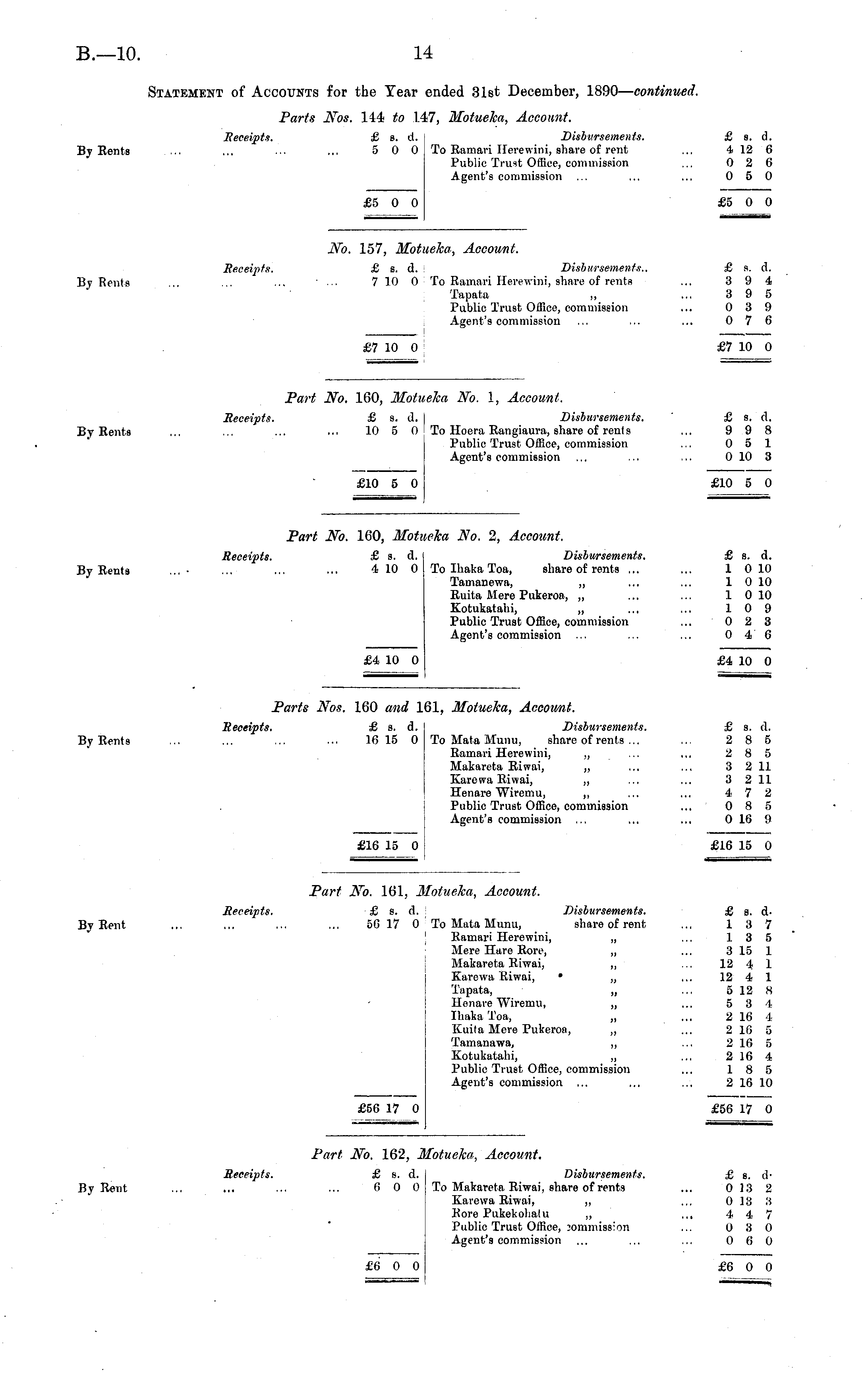Part No. 160, Motueka No. 1, Account. Receipts. £ s. d. Disbursements. £ s. d. By Rents ... ... ... ... 10 5 0 To Hoera Rangiaura, share of rents ... 9 9 8 Public Trust Office, commission ... 0 5 1 Agent's commission ... ... ... 010 3 £10 5 0 £10 5 0