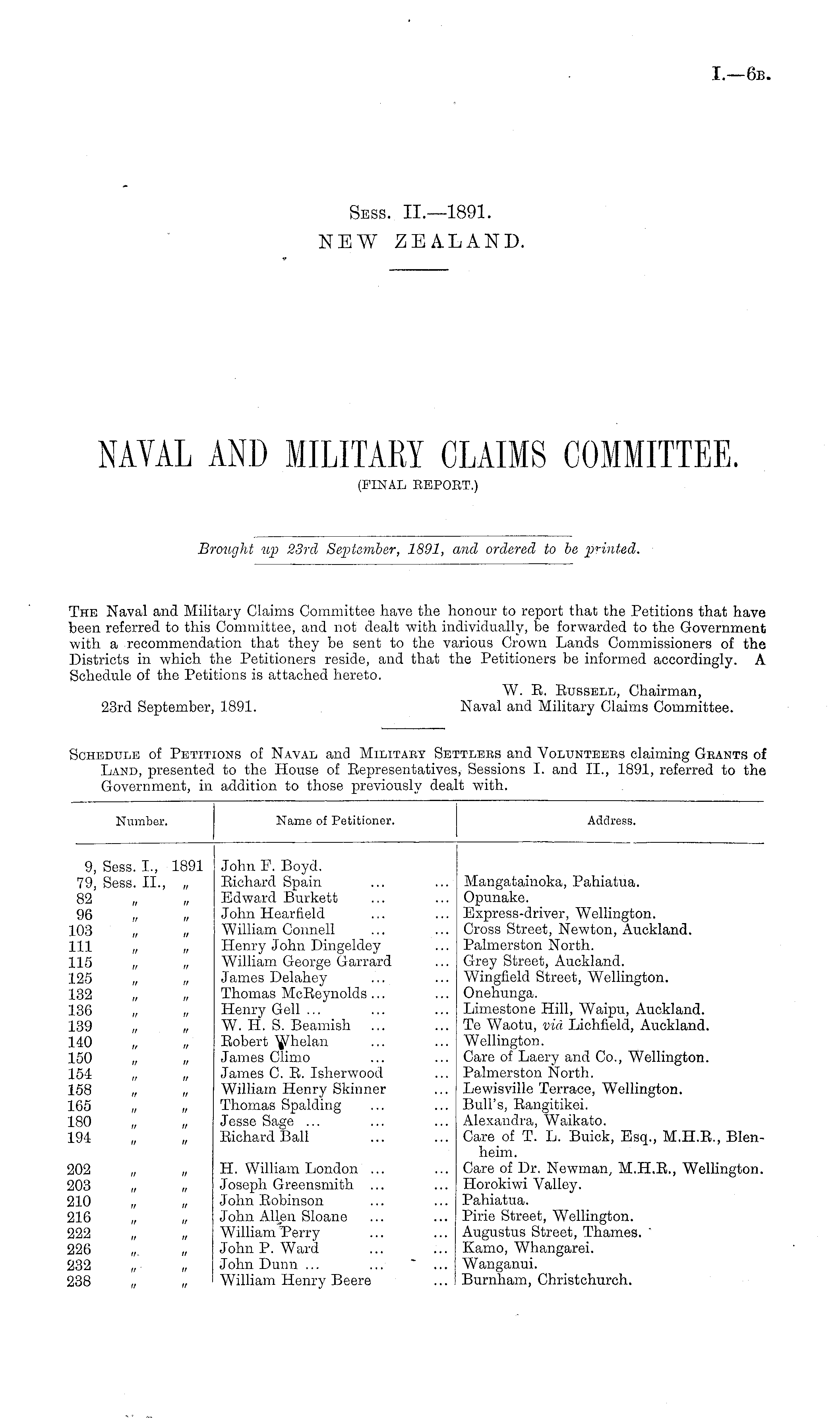 Schedule of Petitions of Naval and Military Settlers and Volunteers claiming Grants of Land, presented to the House of Representatives, Sessions I. and II., 1891, referred to the Government, in addition to those previously dealt with.