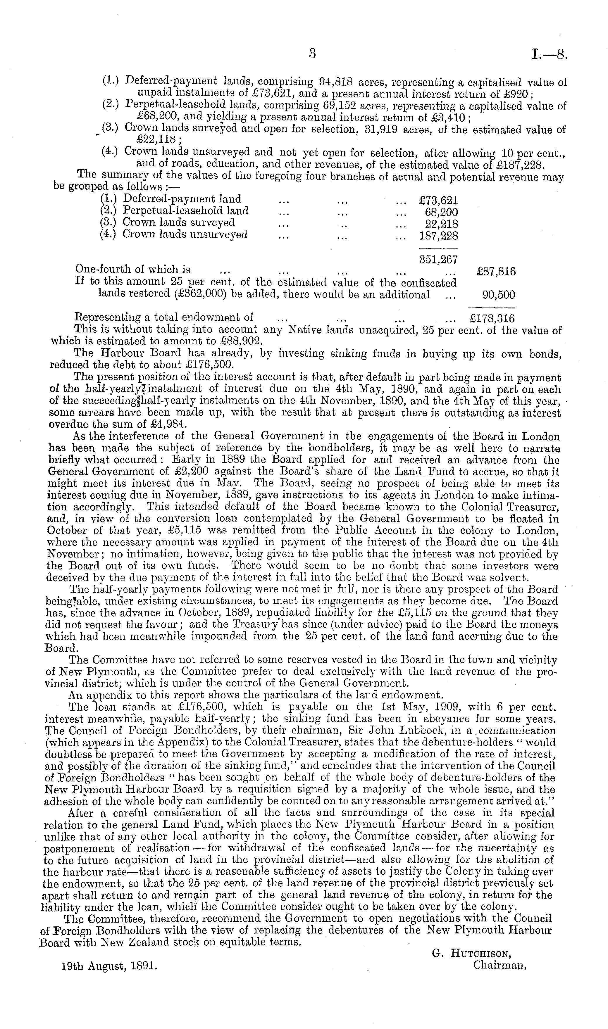 (1.) Deferred-payment lands, comprising 94,818 acres, representing a capitalised value of unpaid instalments of £73,621, and a present annual interest" return of £920; (2.) Perpetual-leasehold lands, comprising 09,152 acres, representing a capitalised value of £68,200, and yielding a present annual interest return of £3,410 ; (3.) Crown lands surveyed and open for selection, 31,919 acres, of the estimated value of £22,118; (4.) Crown lands unsurveyed and not yet open for selection, after allowing 10 per cent., and of roads, education, and other revenues, of the estimated value of £187,228. The summary of the values of the foregoing four branches of actual and potential revenue may be grouped as follows :—■ (1.) Deferred-payment land ... ... ... £73,621 (2.) Perpetual-leasehold land ... ... ... 68,200 (3.) Crown lands surveyed ... ... ... 22,218 (4.) Crown lands unsurveyed ... ... ... 187,228 351,267 One-fourth of which is ... ... ... ... ... £87,816 If to this amount 25 per cent, of the estimated value of the confiscated lands restored (£362,000) be added, there would be an additional ... 90,500 Bepresenting a total endowment of ... ... ... ... £178,316 This is without taking into account any Native lands unacquired, 25 per cent, of the value of which is estimated to amount to £88,902. The Harbour Board has already, by investing sinking funds in buying up its own bonds, reduced the debt to about £176,500. The present position of the interest account is that, after default in part being made in payment of the half -yearly J instalment of interest due on the 4th May, 1890, and again in part on each of the succeedingfhalf-yearly instalments on the 4th November, 1890, and the 4th May of this year, some arrears have been made up, with the result that at present there is outstanding as interest overdue the sum of £4,984. As the interference of the General Government in the engagements of the Board in London has been made the subject of reference by the bondholders, it may be as well here to narrate briefly what occurred : Early in 1889 the Board applied for and received an advance from the General Government of £2,200 against the Board's share of the Land Fund to accrue, so that it might meet its interest due in May. The Board, seeing no prospect of being able to meet its interest coming due in November, 1889, gave instructions to its agents in London to make intimation accordingly. This intended default of the Board became known to the Colonial Treasurer, and, in view of the conversion loan contemplated by the General Government to be floated in October of that year, £5,115 was remitted from the Public Account in the colony to London, where the necessary amount was applied in payment of the interest of the Board due on the 4th November; no intimation, however, being given to the public that the interest was not provided by the Board out of its own funds. There would seem to be no doubt that some investors were deceived by the due payment of the interest in full into the belief that the Board was solvent. The half-yearly payments following were not met in full, nor is there any prospect of the Board beingfable, under existing circumstances, to meet its engagements as they become due. The Board has, since the advance in October, 1889, repudiated liability for the £5,115 on the ground that they did not request the favour ; and the Treasury has since (under advice) paid to the Board the moneys which had been meanwhile impounded from the 25 per cent, of the land fund accruing due to the Board. The Committee have not referred to some reserves vested in the Board in the town and vicinity of New Plymouth, as the Committee prefer to deal exclusively with the land revenue of the provincial district, which is under the control of the General Government. An appendix to this report shows the particulars of the land endowment. The loan stands at £176,500, which is payable on the Ist May, 1909, with 6 per cent, interest meanwhile, payable half-yearly; the sinking fund has been in abeyance for some years. The Council of Foreign Bondholders, by their chairman, Sir John Lubbock, in a,communication (which appears in the Appendix) to the Colonial Treasurer, states that the debenture-holders " would doubtless be prepared to meet the Government by accepting a modification of the rate of interest, and possibly of the duration of the sinking fund," and concludes that the intervention of the Council of Foreign Bondholders " has been sought on behalf of the whole body of debenture-holders of the New Plymouth Harbour Board by a requisition signed by a majority of the whole issue, and the adhesion of the whole body can confidently be counted on to any reasonable arrangement arrived at." After a careful consideration of all the facts and surroundings of the case in its special relation to the general Land Fund, which places the New Plymouth Harbour Board in a position unlike that of any other local authority in the colony, the Committee consider, after allowing for postponement of realisation — for withdrawal of the confiscated lands — for the uncertainty as to the future acquisition of land in the provincial district—and also allowing for the abolition of the harbour rate—that there is a reasonable sufficiency of assets to justify the Colony in taking over the endowment, so that the 25 per cent, of the land revenue of the provincial district previously set apart shall return to and remain part of the general land revenue of the colony, in return for the liability under the loan, which the Committee consider ought to be taken over by the colony. The Committee, therefore, recommend the Government to open negotiations with the Council of Foreign Bondholders with the view of replacing the debentures of the New Plymouth Harbour Board with New Zealand stock on equitable terms. G. Hutchison, 19th August, 1891, Chairman,