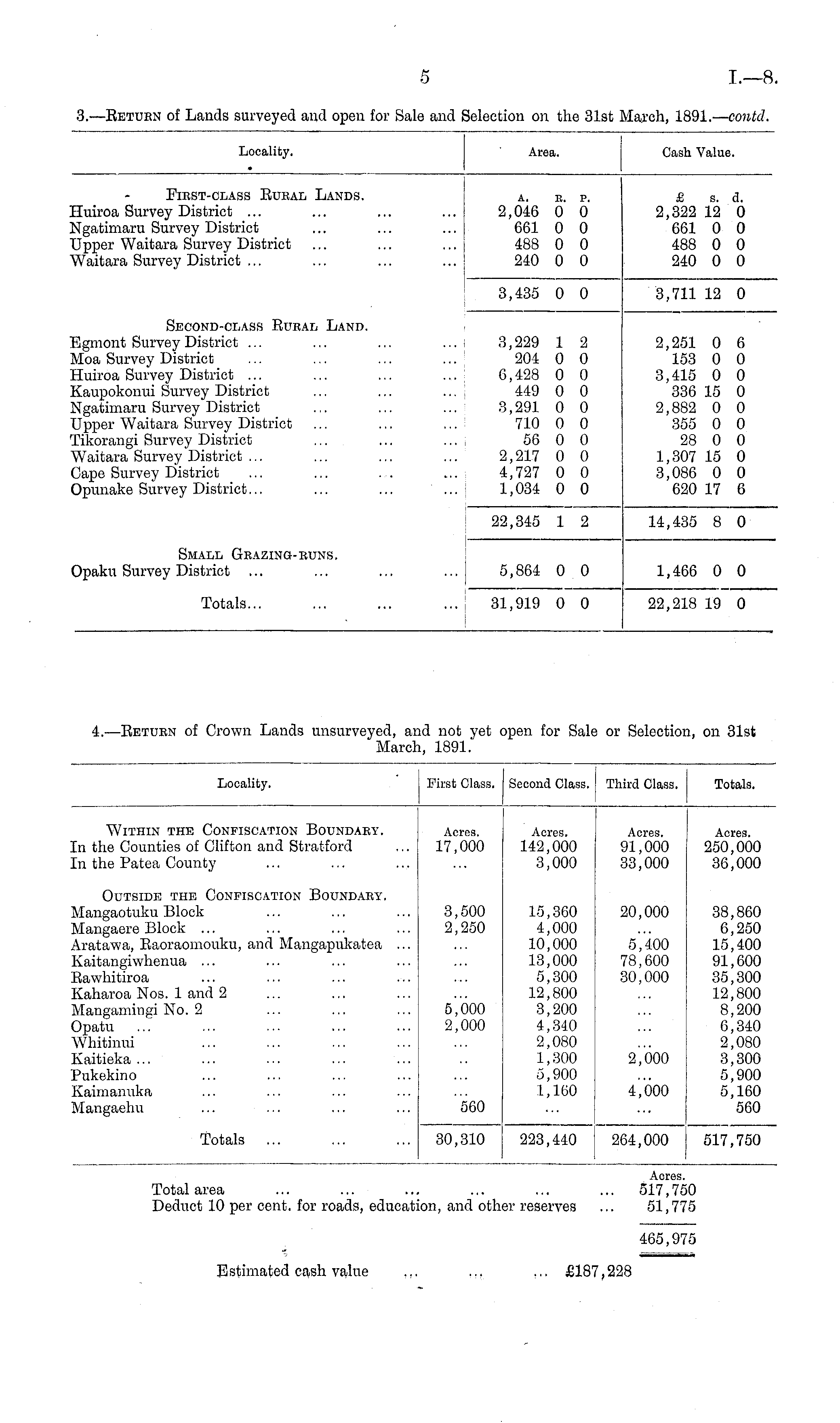Locality. First Class. Second Class. Third Class. I Totals. Within the Confiscation Boundary. In the Counties of Clifton and Stratford In the Patea County Acres. 17,000 Acres. 142,000 3,000 Acres. 91,000 33,000 Acres. 250,000 36,000 Outside the Confiscation Boundaey. Mangaotuku Block Mangaere Block ... Aratawa, Eaoraomouku, and Mangapukatea Kaitangiwhenua ... Eawhitiroa Kaharoa Nos. 1 and 2 Mangamingi No. 2 Opatu Whitinui Kaitieka ... Pukekino Kaimanuka Mangaehu 3,500 2,250 5,000 2,000 15,360 4,000 10,000 13,000 5,300 12,800 3,200 4,340 2,080 1,300 5,900 1,160 20,000 5,400 78,600 30,000 38,860 6,250 15,400 91,600 35,300 12,800 8,200 6,340 2,080 3,300 5,900 5,160 560 2,000 560 4,000 Totals ... 30,310 223,440 264,000 517,750 Total area Deduct 10 per cent, for roads, educati Acres. ... ,517,750 ion, and other reserves ... 51,775 465,975 Estimated cash value ... ,.. £187,228