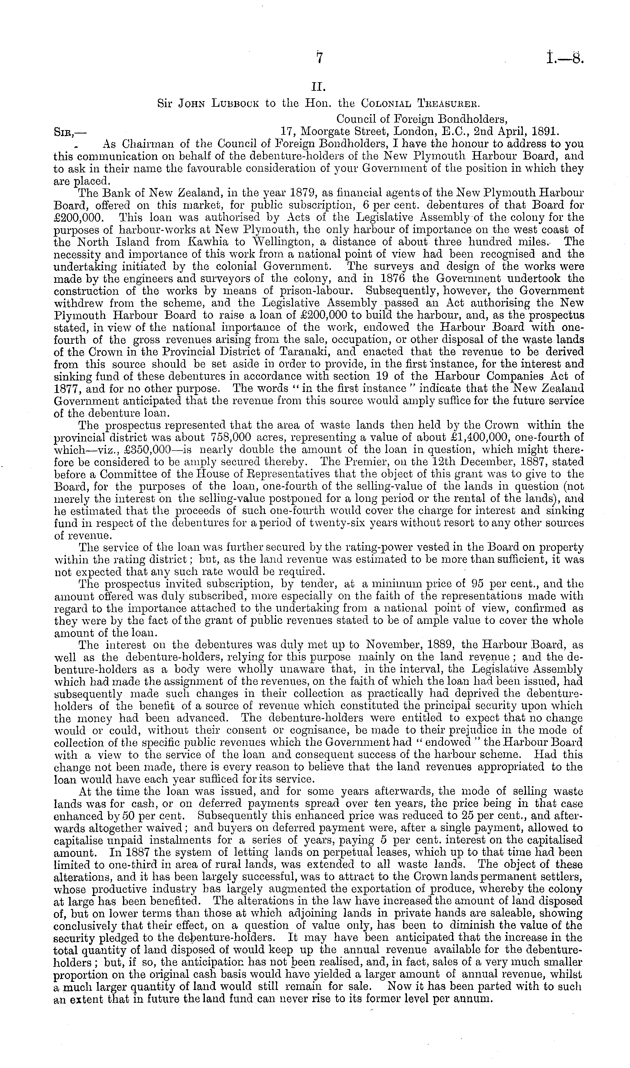 11. Sir John Lubbock to the Hon. the. Colonial Tkeasuhek. Council of Foreign Bondholders, Sic, — 17, Moorgate Street, London, E.G., 2nd April, 1891. As Chairman of the Council of Foreign Bondholders, I have the honour to address to you this communication on behalf of the debenture-holders of the New Plymouth Harbour Board, and to ask in their name the favourable consideration of your Government of the position in which they are placed. The Bank of New Zealand, in the year 1879, as financial agents of the New Plymouth Harbour Board, offered on this market, for public subscription, 6 per cent, debentures of that Board for £200,000. This loan was authorised by Acts of the Legislative Assembly of the colony for the purposes of harbour-works at New Plymouth, the only harbour of importance on the west coast of the North Island from Kawhia to Wellington, a distance of about three hundred miles. The necessity and importance of this work from a national point of view had been recognised and the undertaking initiated by the colonial Government. The surveys and design of the works were made by the engineers and surveyors of the colony, and in 1876 the Government undertook the construction of the works by means of prison-labour. Subsequently, however, the Government withdrew from the scheme, and the Legislative Assembly passed an Act authorising the New Plymouth Harbour Board to raise a loan of £200,000 to build the harbour, and, as the prospectus stated, in view of the national importance of the work, endowed the Harbour Board with onefourth of the gross revenues arising from the sale, occupation, or other disposal of the waste lands of the Crown in the Provincial District of Taranaki, and enacted that the revenue to be derived from this source should be set aside in order to provide, in the first "instance, for the interest and sinking fund of these debentures in accordance with section 19 of the Harbour Companies Act of 1877, and for no other purpose. The words "in the first instance " indicate that the New Zealand Government anticipated that the revenue from this source would amply suffice for the future service of the debenture loan. The prospectus represented that the area of waste lands then held by the Crown within the provincial district was about 758,000 acres, representing a value of about £1,400,000, one-fourth of which —viz., £350,000 —is nearly double the amount of the loan in question, which might therefore be considered to be amply secured thereby. The Premier, on the 12th December, 1887, stated before a Committee of the House of Representatives that the object of this grant was to give to the Board, for the purposes of the loan, one-fourth of the selling-value of the lands in question (not merely the interest on the selling-value postponed for a long period or the rental of the lands), and he estimated that the proceeds of such one-fourth would cover the charge for interest and sinking fund in respect of the debentures for a period of twenty-six years without resort to any other sources of revenue. The service of the loan was further secured by the rating-power vested in the Board on property within the rating district; but, as the land revenue was estimated to be more than sufficient, it was not expected that any such rate would be required. The prospectus invited subscription, by tender, at a minimum price of 95 per cent., and the amount offered was duly subscribed, more especially on the faith of the representations made with regard to the importance attached to the undertaking from a national point of view, confirmed as they were by the fact of the grant of public revenues stated to be of ample value to cover the whole amount of the loan. The interest on the debentures was duly met up to November, 1889, the Harbour Board, as well as the debenture-holders, relying for this purpose mainly on the land revenue ; and the de-benture-holders as a body were wholly unaware that, in the interval, the Legislative Assembly which had made the assignment of the revenues, on the faith of which the loan had been issued, had subsequently made such changes in their collection as practically had deprived the debentureholders of the benefit of a source of revenue which constituted the principal security upon which the money had been advanced. The debenture-holders were entitled to expect that no change would or could, without their consent or cognisance, be made to their prejudice in the mode of collection of the specific public revenues which the Government had " endowed. " the Harbour Board with a view to the service of the loan and consequent success of the harbour scheme. Had this change not been made, there is every reason to believe that the land revenues appropriated to the loan would have each year sufficed for its service. At the time the loan was issued, and for some years afterwards, the mode of selling waste lands was for cash, or on deferred payments spread over ten years, the price being in that case enhanced by 50 per cent. Subsequently this enhanced price was reduced to 25 per cent., and afterwards altogether waived; and buyers on deferred payment were, after a single payment, allowed to capitalise unpaid instalments for a series of years, paying 5 per cent, interest on the capitalised amount. In 1887 the system of letting lands on perpetual leases, which up to that time had been limited to one-third in area of rural lands, was extended to all waste lands. The object of these alterations, and it has been largely successful, was to attract to the Crown lands permanent settlers, whose productive industry has largely augmented the exportation of produce, whereby the colony at large has been benefited. The alterations in the law have increased the amount of land disposed of, but on lower terms than those at which adjoining lands in private hands are saleable, showing conclusively that their effect, on a question of value only, has been to diminish the value of the security ple